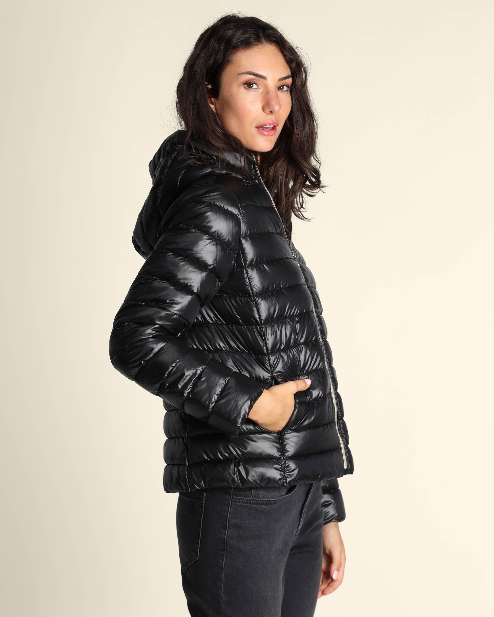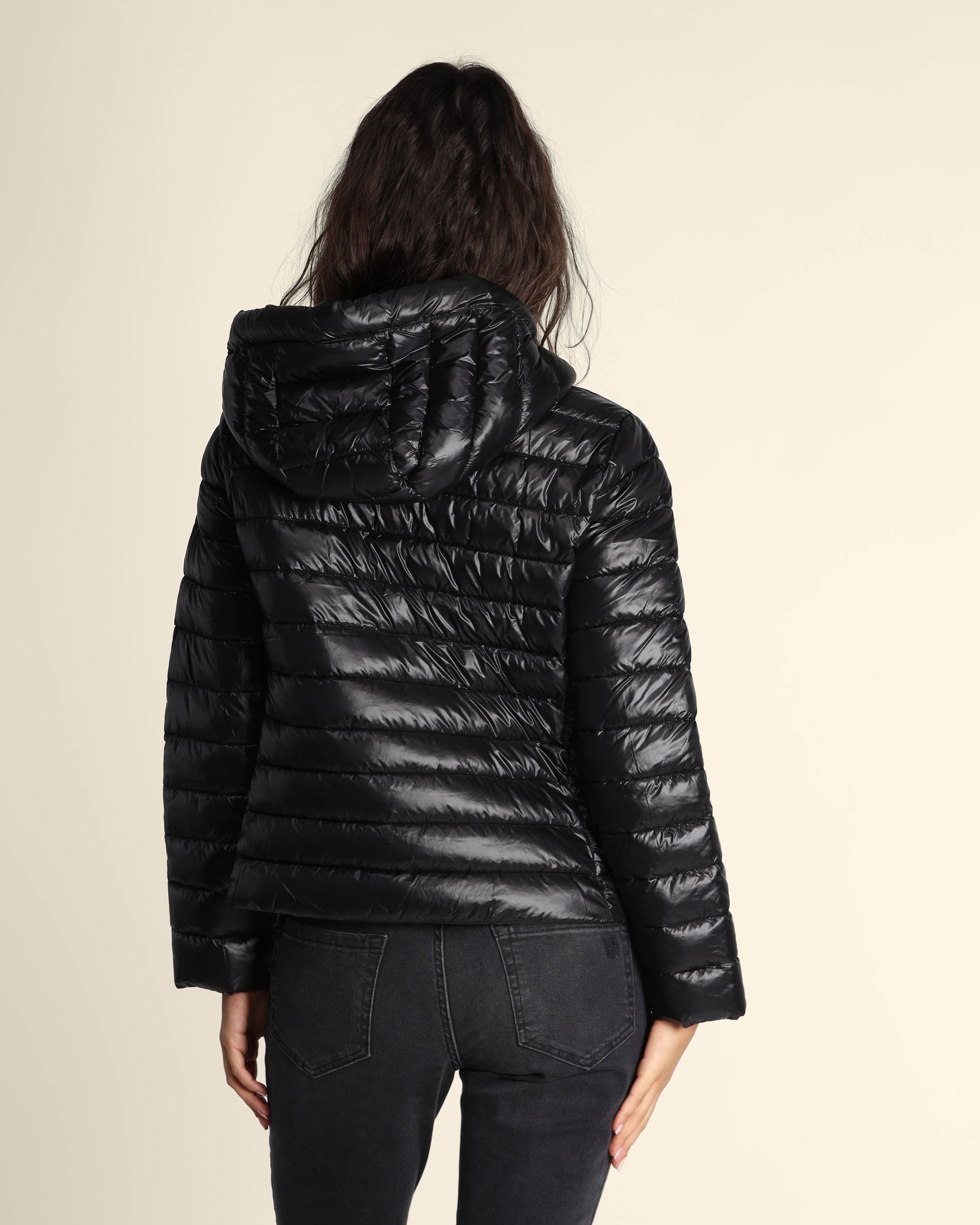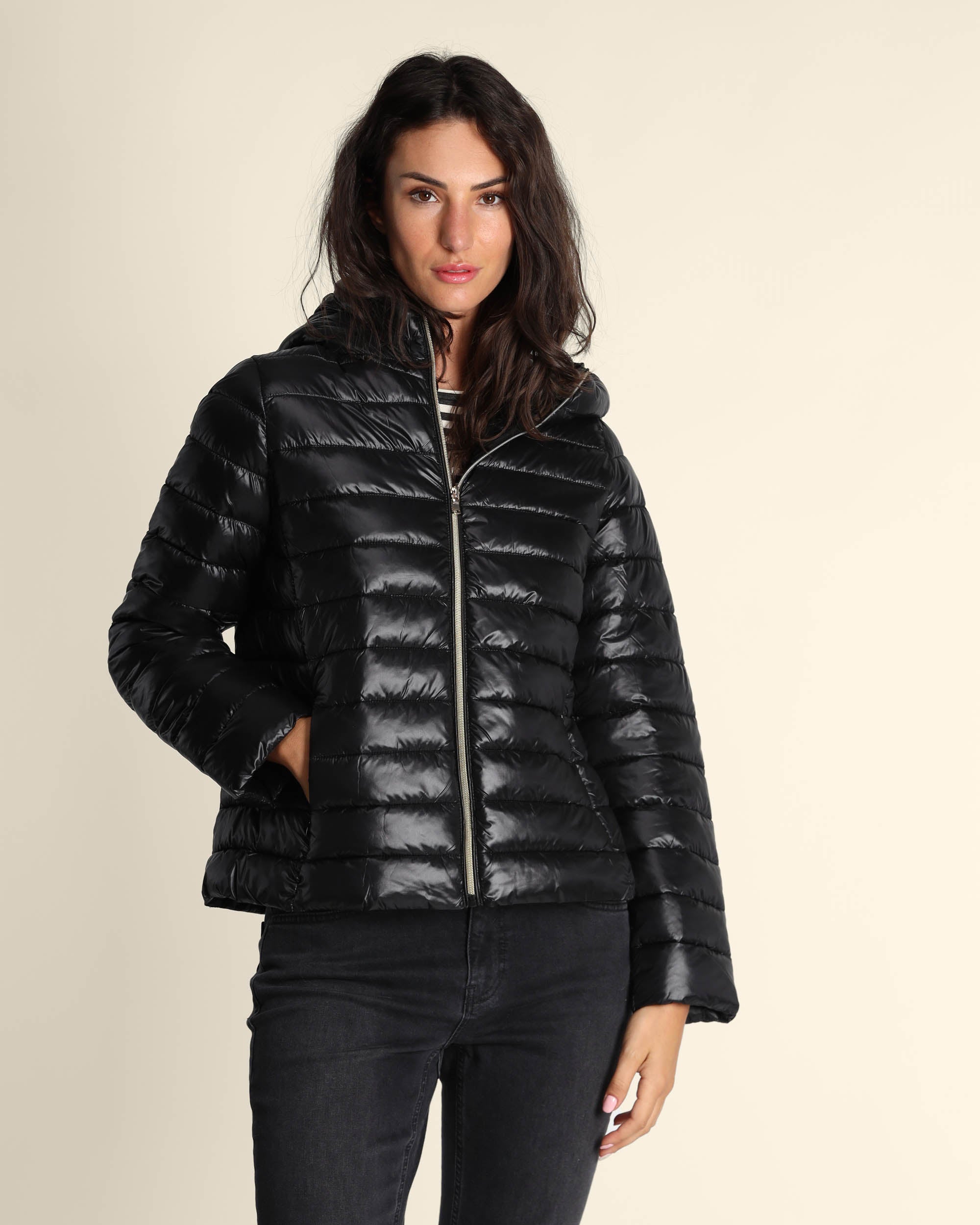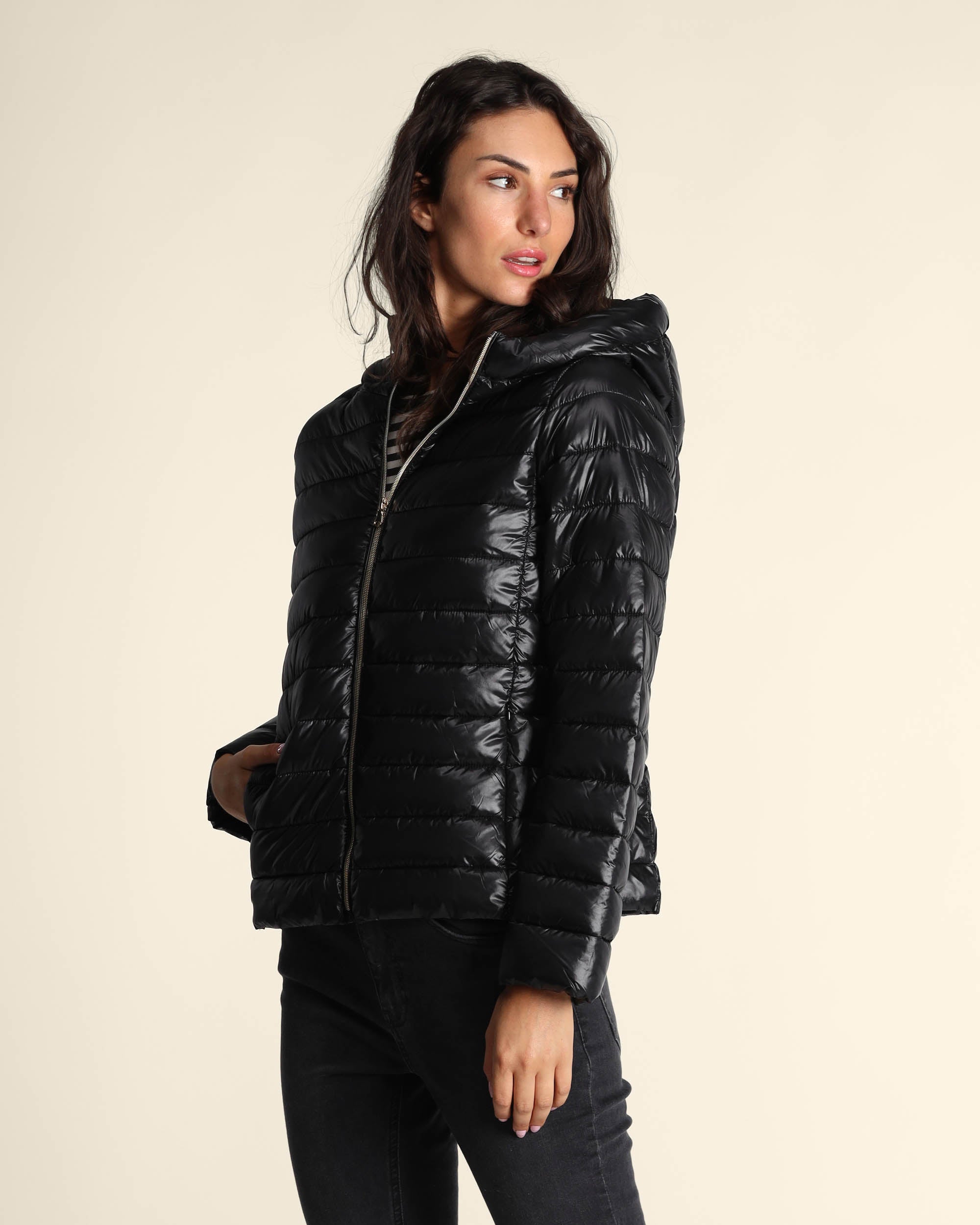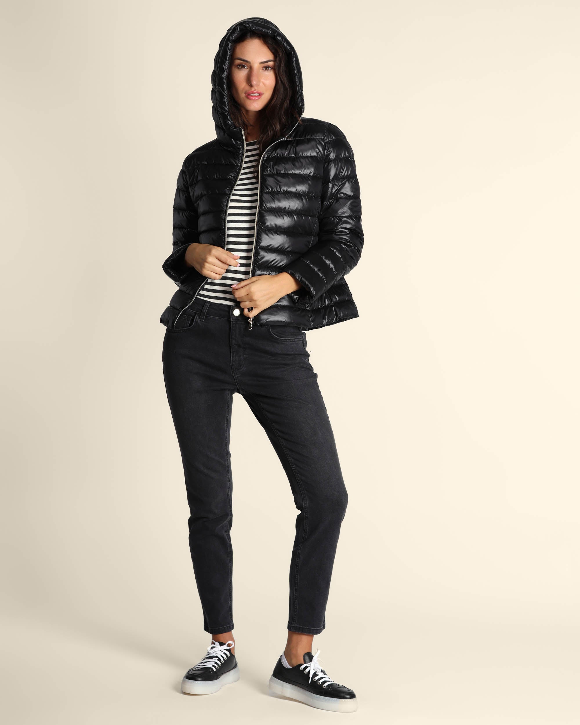 Piumino nero in tessuto tecnico antigoccia, collo con cappuccio, maniche lunghe, chiusura con zip, linea dritta, tasche a filetto con zip invisibile, imbottitura leggera, sacchetto portapiumino, la modella indossa una tg.42, la modella ha le seguenti misure: altezza 178, seno 86,vita 65, fianchi 93, collezione donna Emme by Marella Autunno Inverno 2025