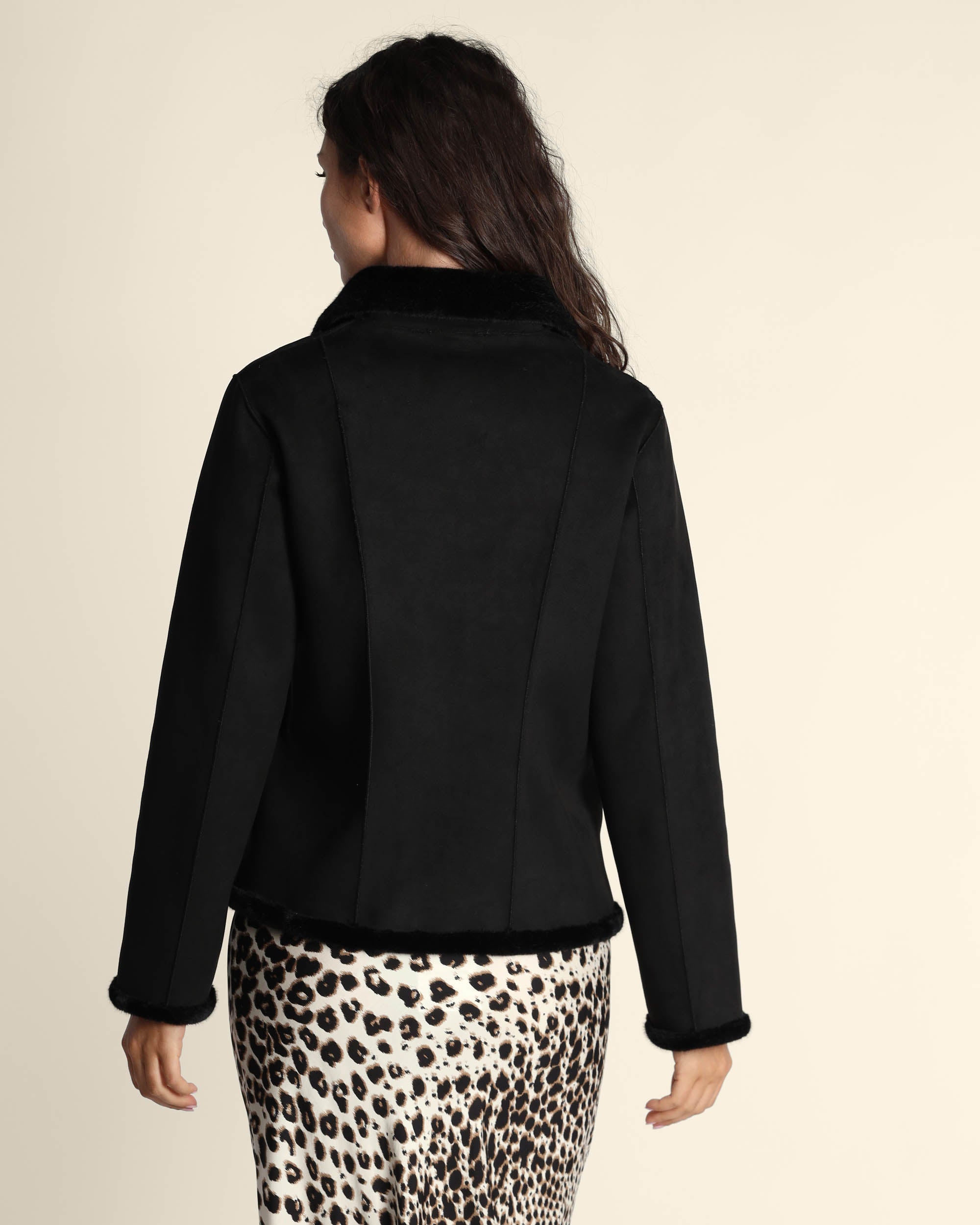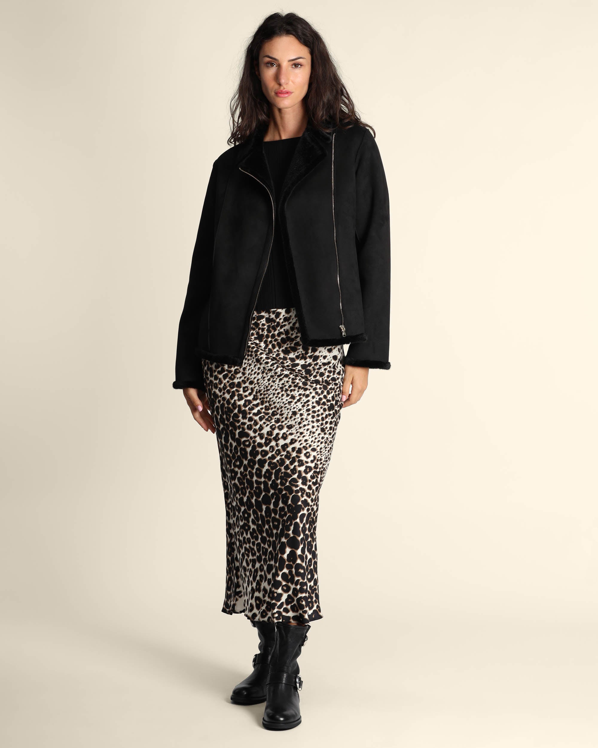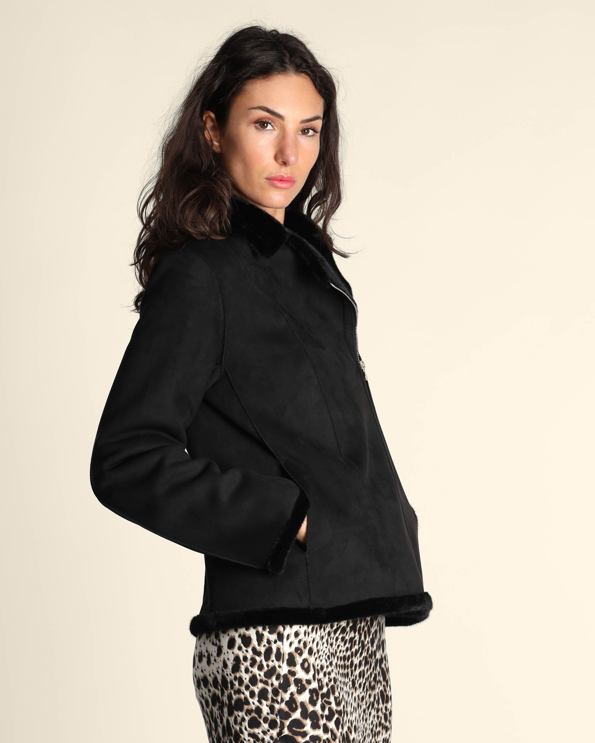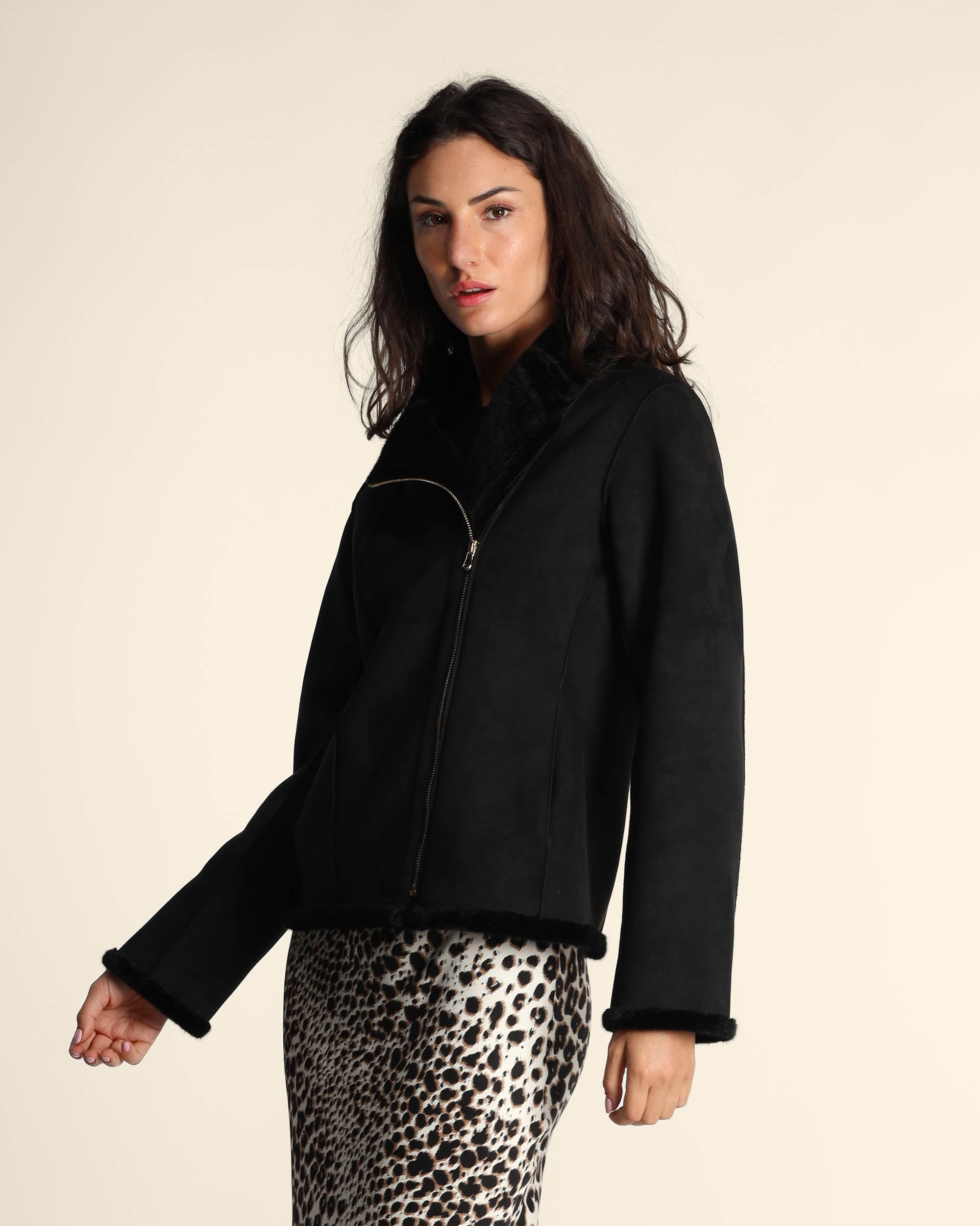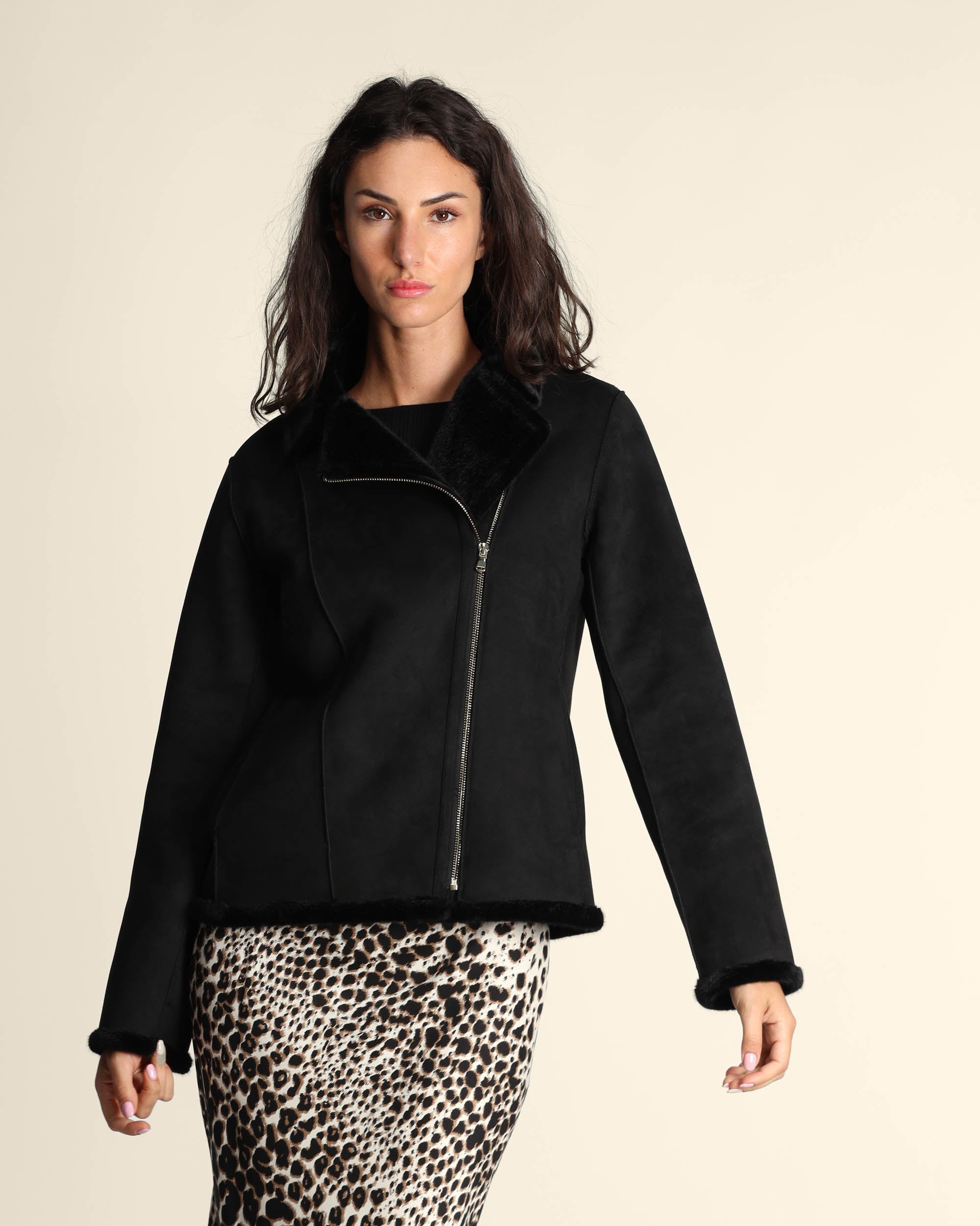 Giaccone in eco montone nero, collo a rever, maniche lunghe, chiusura con zip, linea dritta, tasche a filetto, la modella indossa una tg.42, la modella ha le seguenti misure: altezza 178, seno 86,vita 65, fianchi 93, collezione donna Emme by Marella Autunno Inverno 2025/26