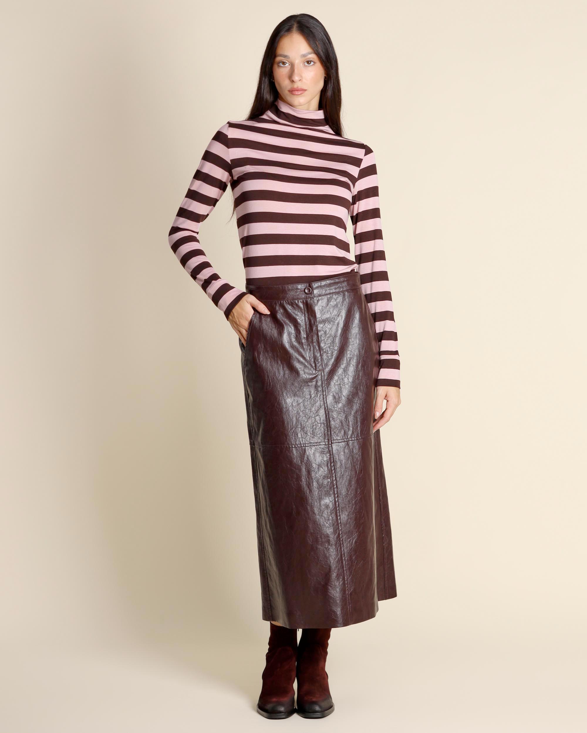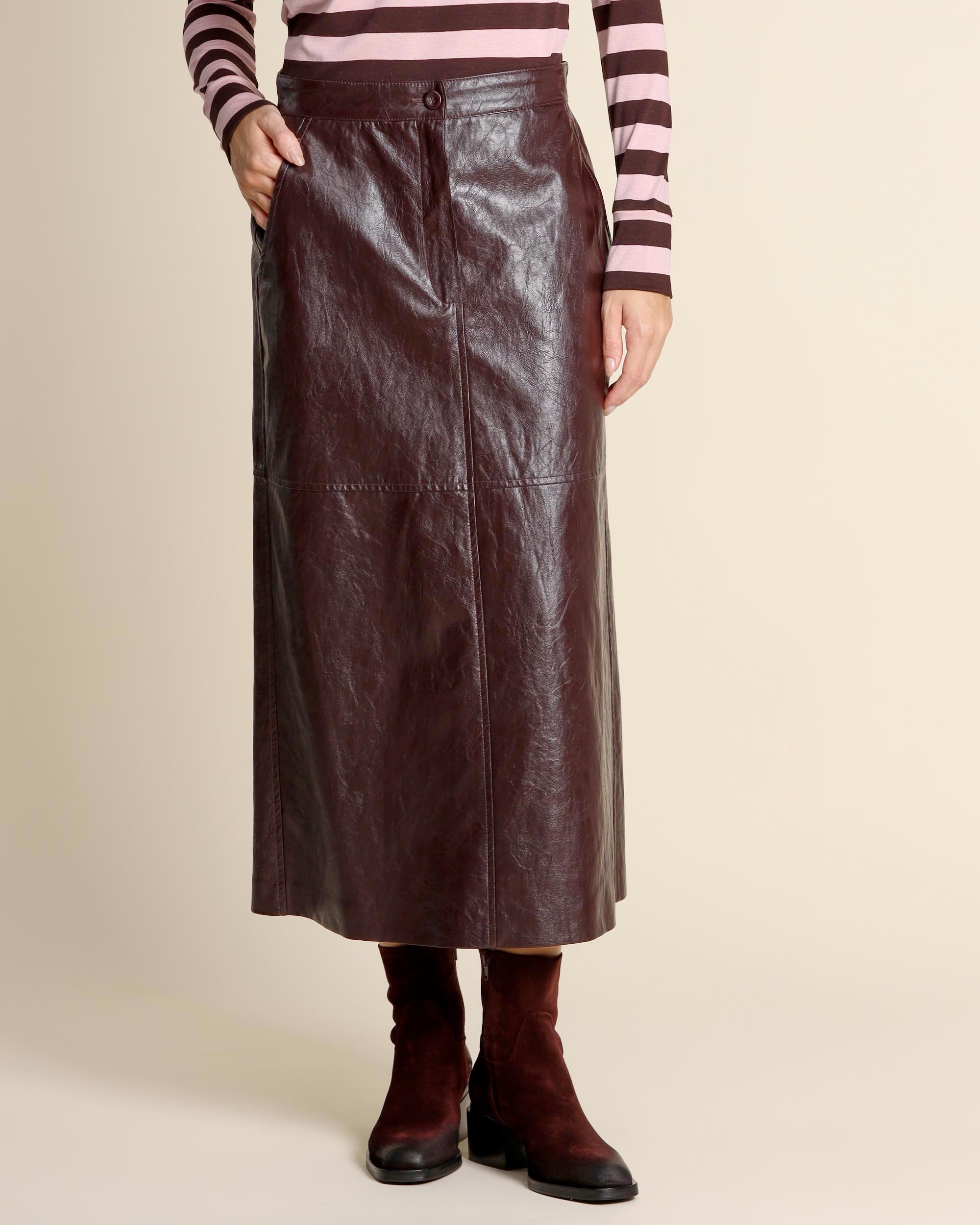 Gonna midi bordeaux ad A in tessuto spalmato effetto pelle, chiusura con bottone e zip nascosta, tasche alla francese sul davanti e tasca a filetto sul dietro, linea svasata, foderata, spacco centrale sul dietro, la modella indossa una tg.42, la modella ha le seguenti misure: altezza 173, seno 86,vita 65, fianchi 93, collezione donna I Bues Autunno Inverno 2025/26