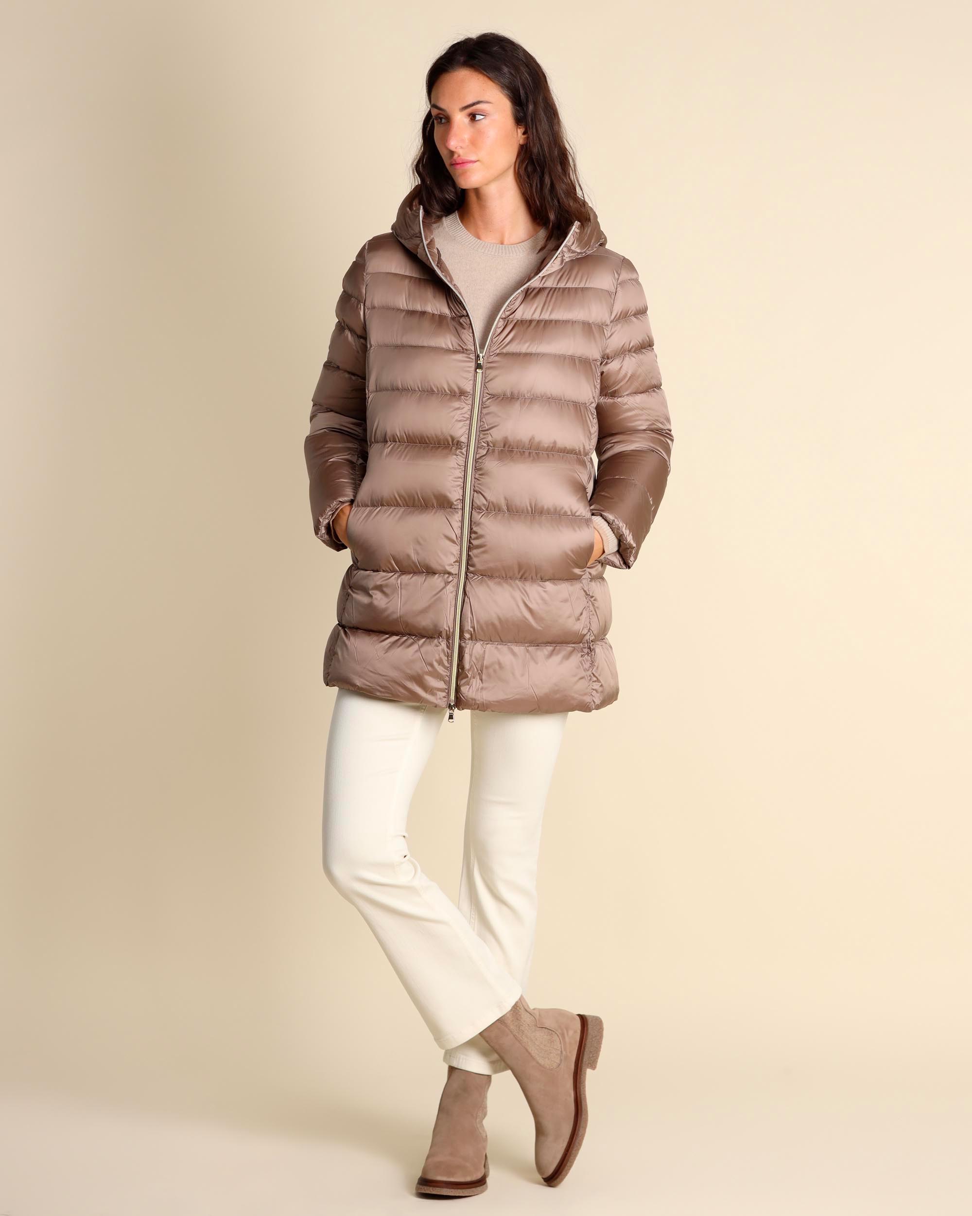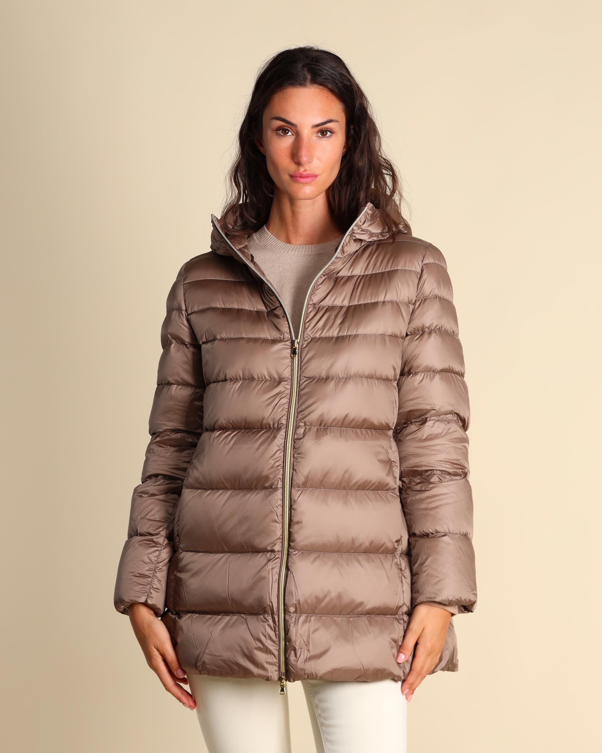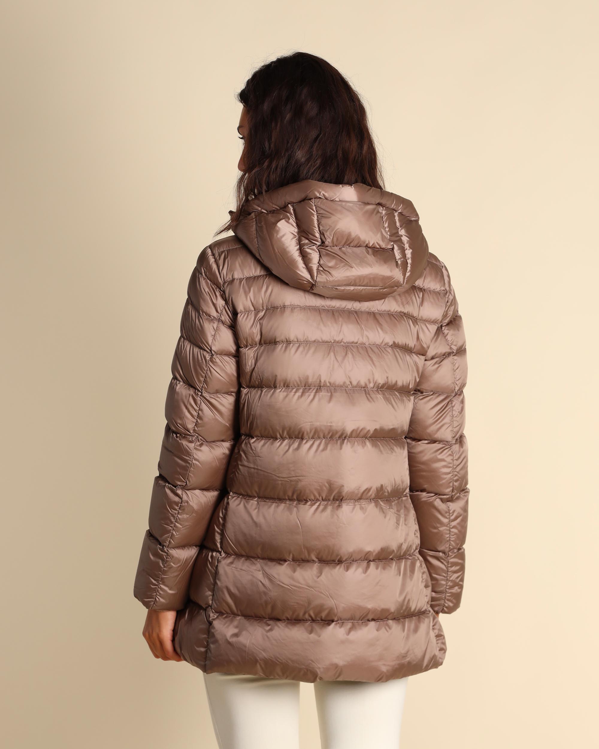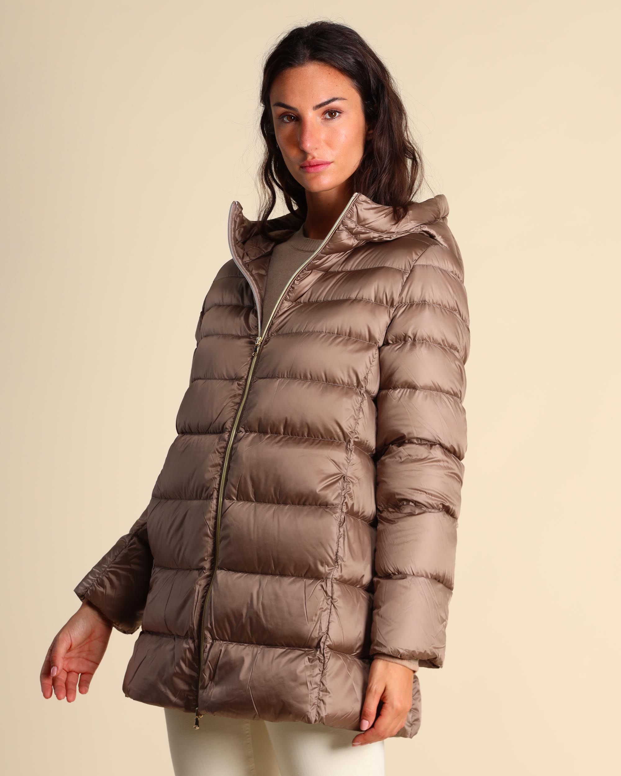 Piumino color tortora in raso antigoccia, collo con cappuccio, maniche lunghe, chiusura con zip a doppio cursore, linea morbida, tasche a filetto, imbottitura in piumino, la modella indossa una tg.42, la modella ha le seguenti misure: altezza 178, seno 86,vita 65, fianchi 93, collezione donna Emme by Marella Autunno Inverno 2025/26