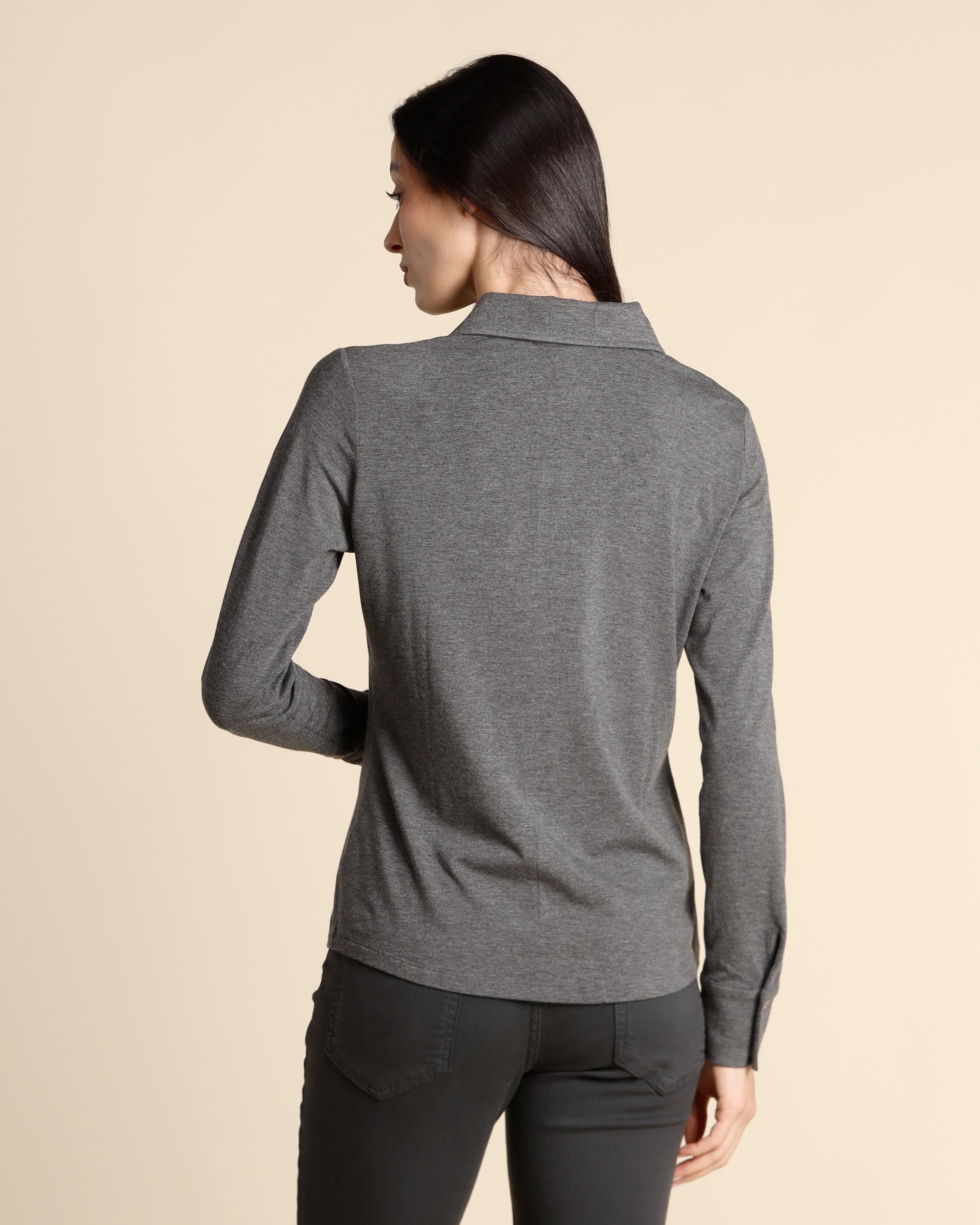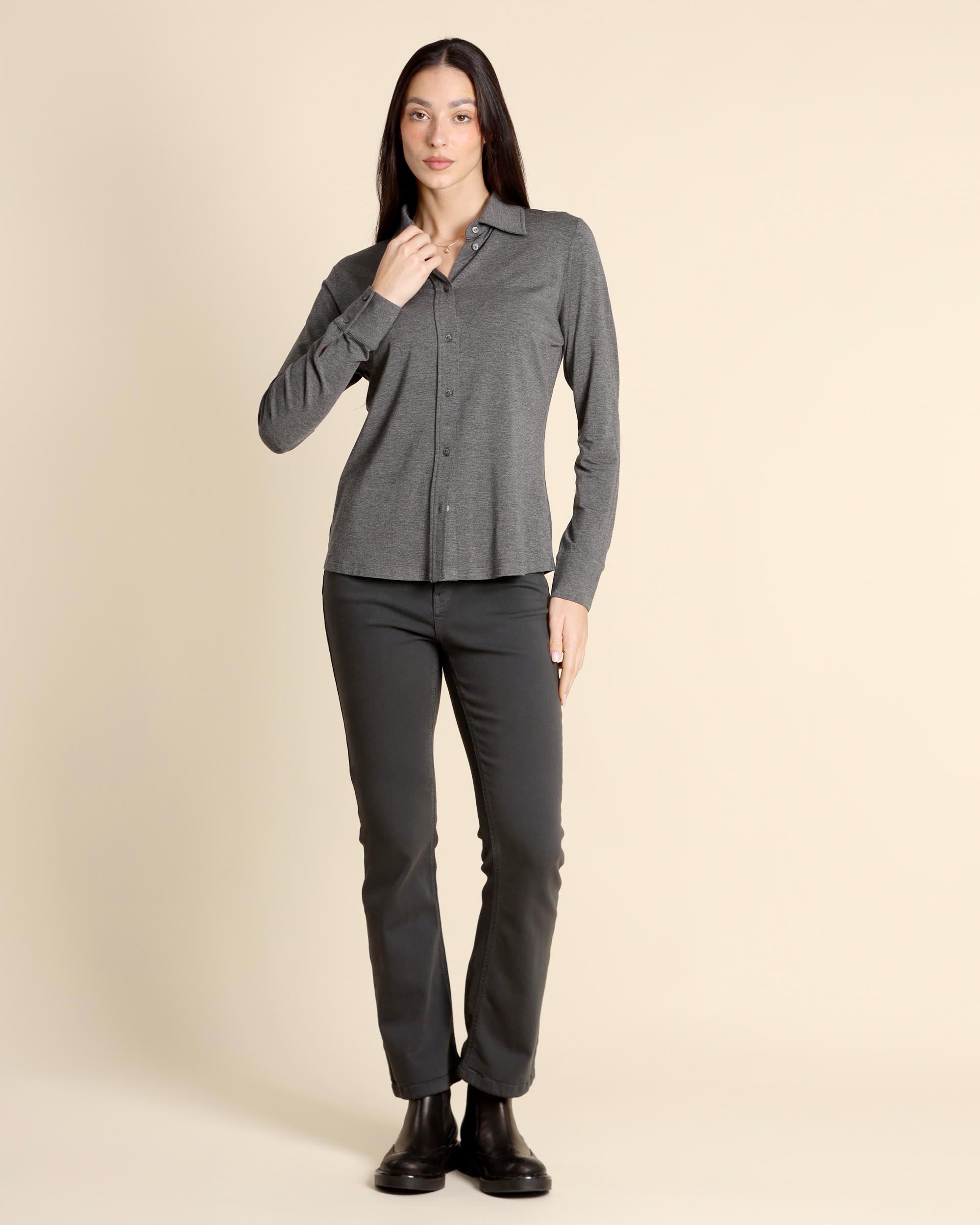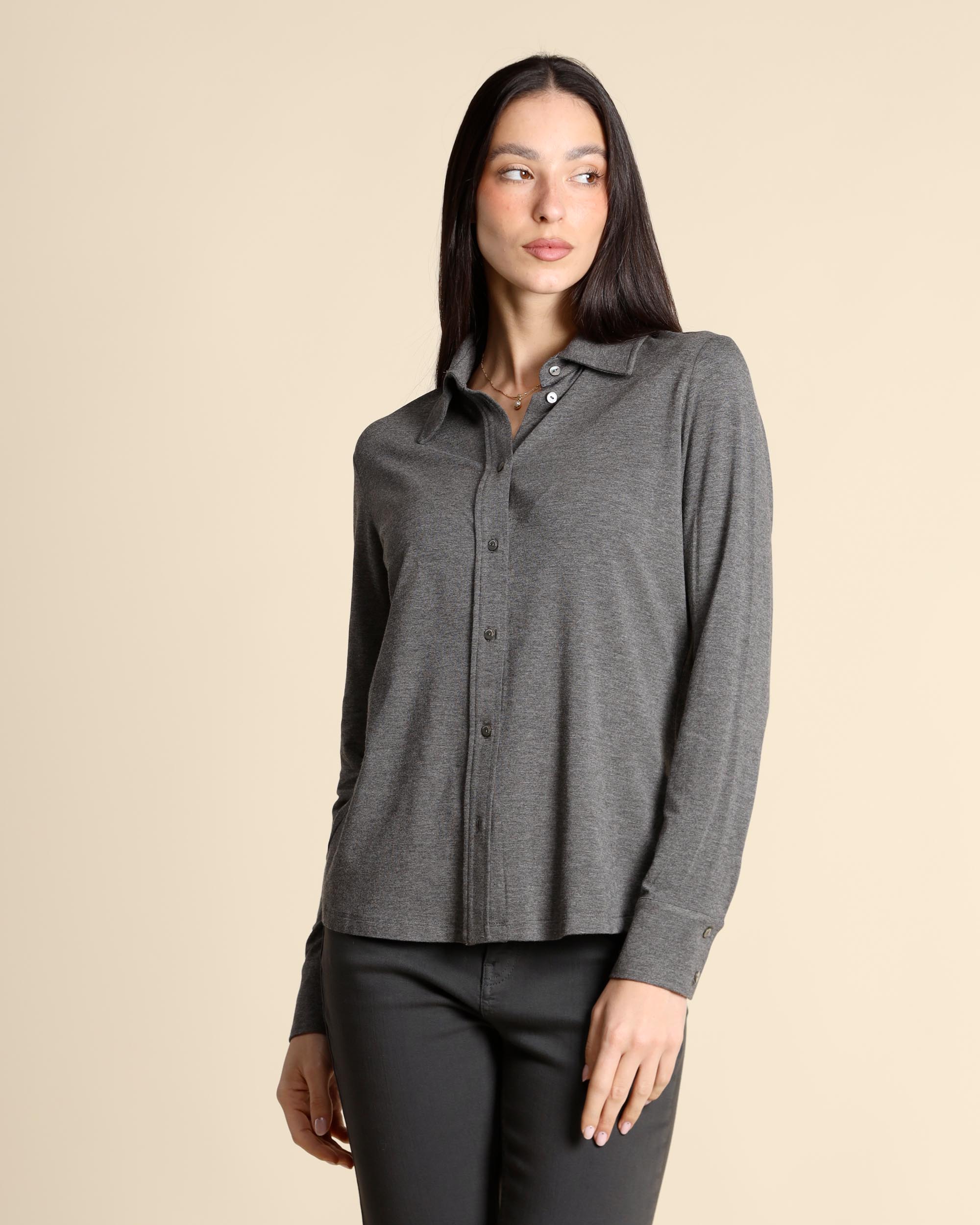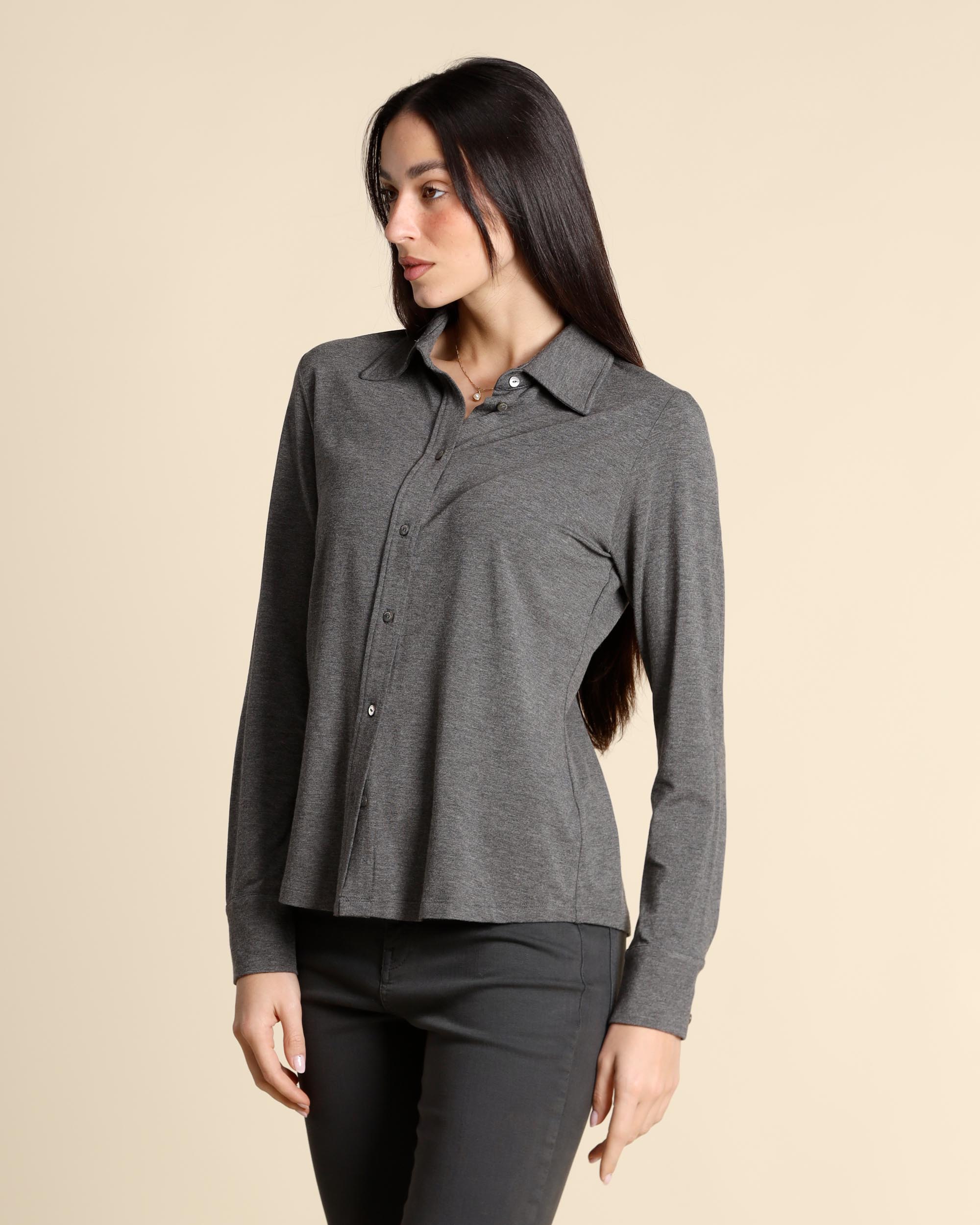 Camicia grigio melange in jersey di viscosa stretch, collo a camicia, linea dritta, maniche lunghe con polsino, chiusura con bottoni, la modella indossa una tg.42, la modella ha le seguenti misure: altezza 175, seno 86,vita 65, fianchi 93, collezione donna Pennyblack Autunno Inverno 2025/26
