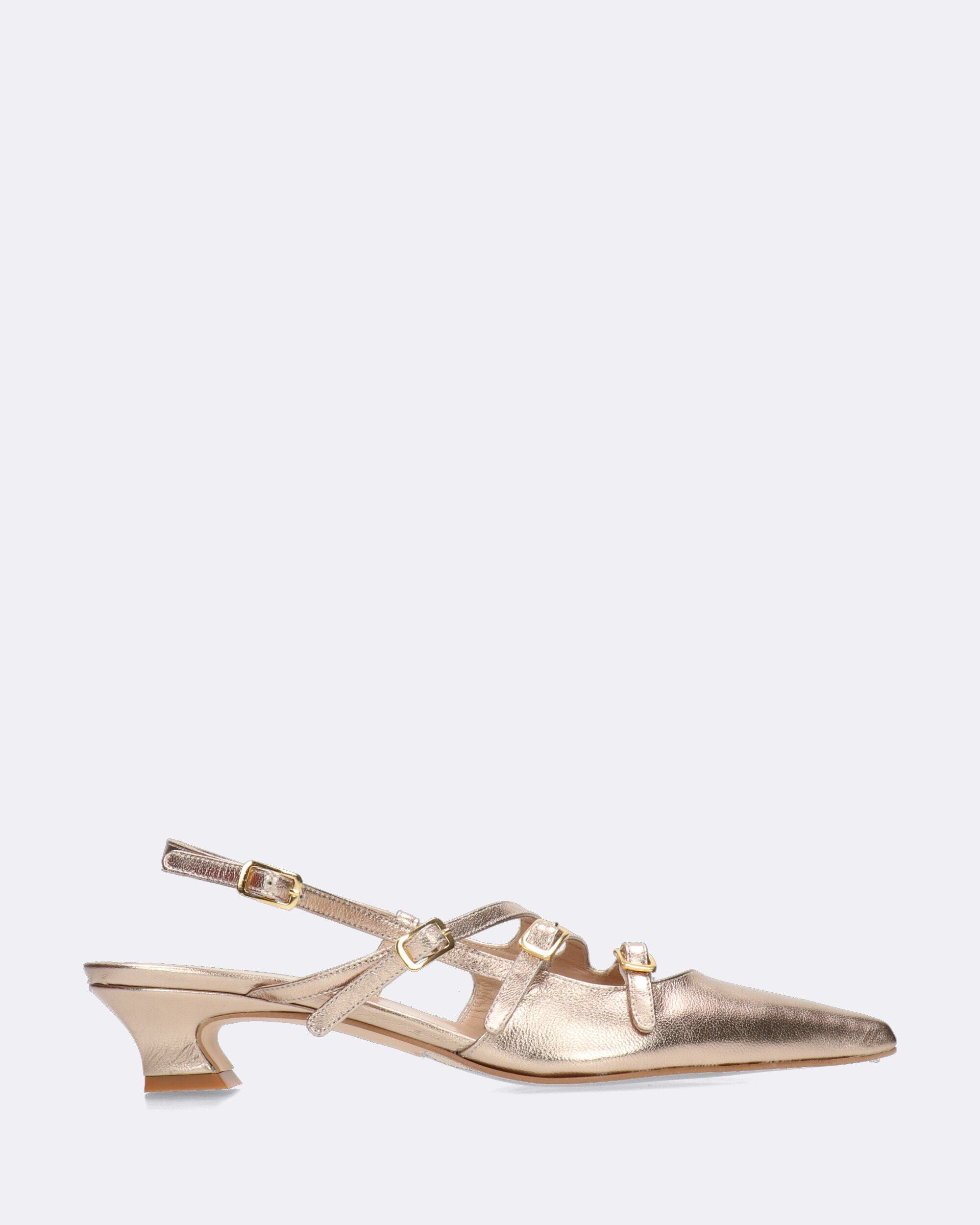 Slingback in pelle laminata color ottone, tacco ricoperto 40mm, sottopiede in pelle, suola in cuoio, a punta, cinturini regolabili con fibbia, made in Italy, collezione donna Hope Primavera estate 2024