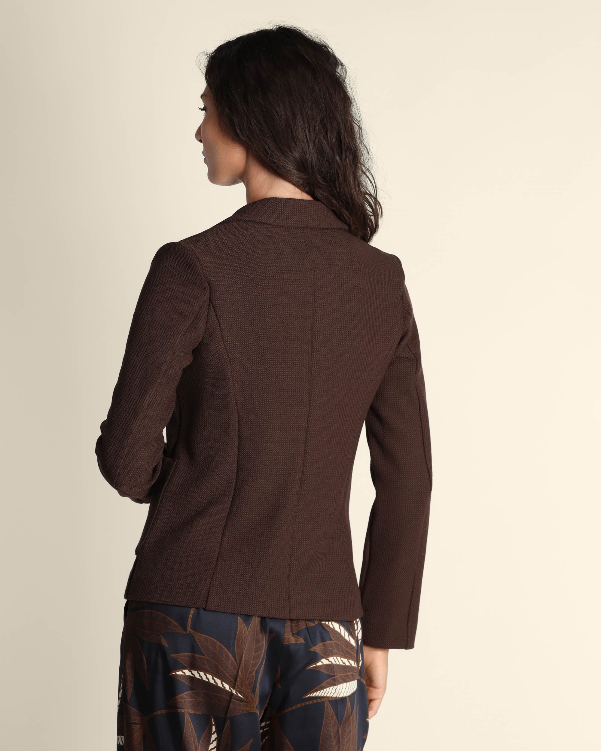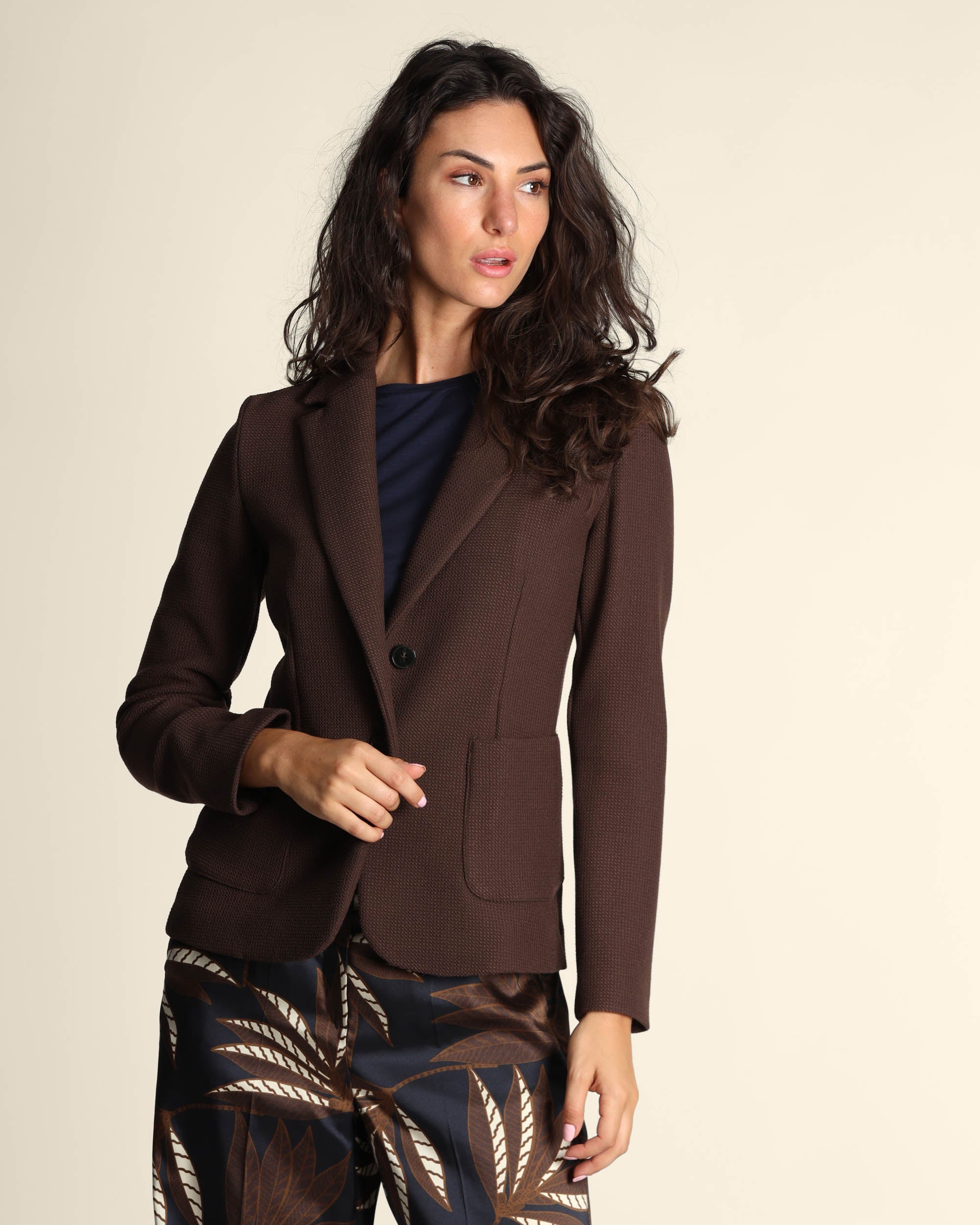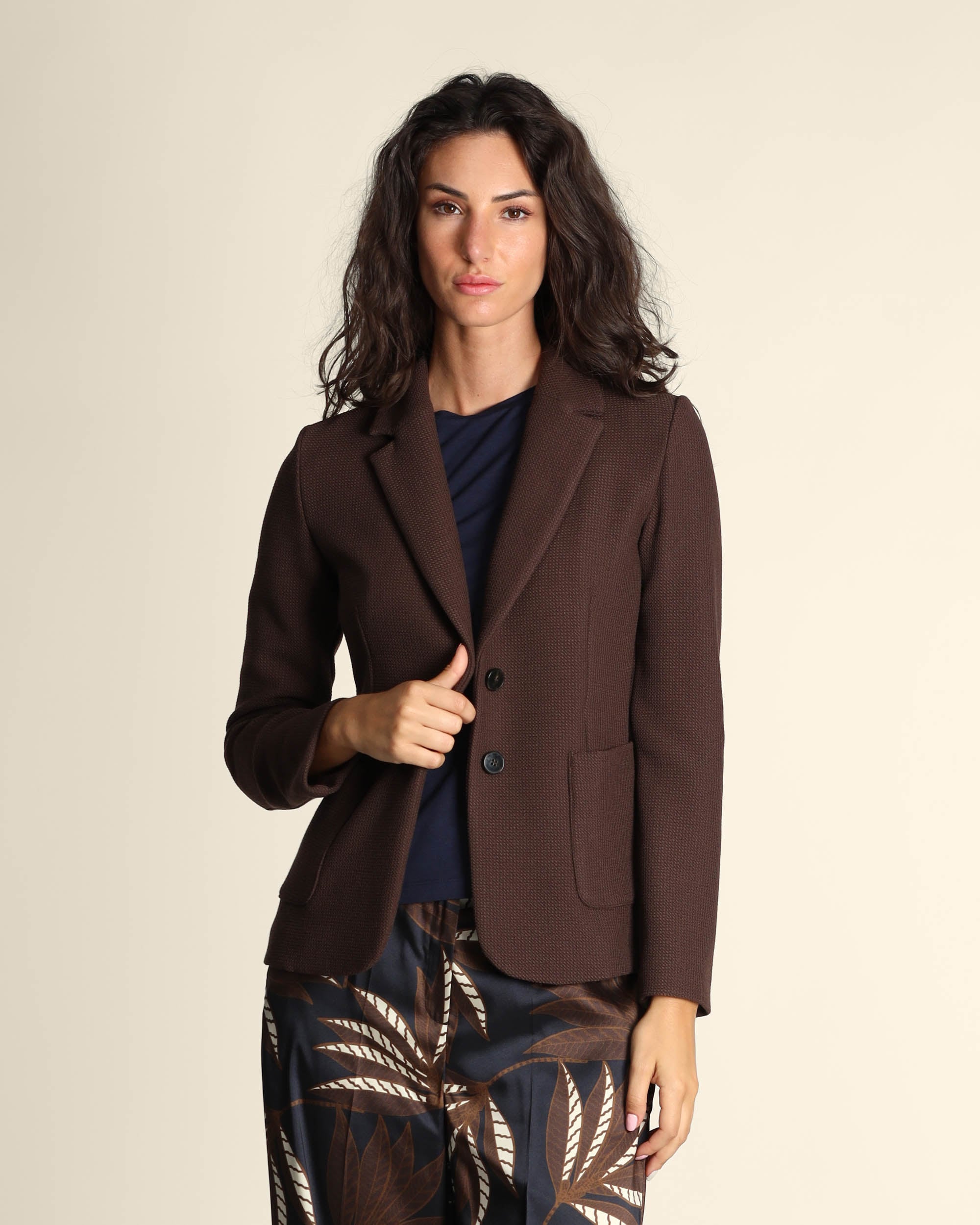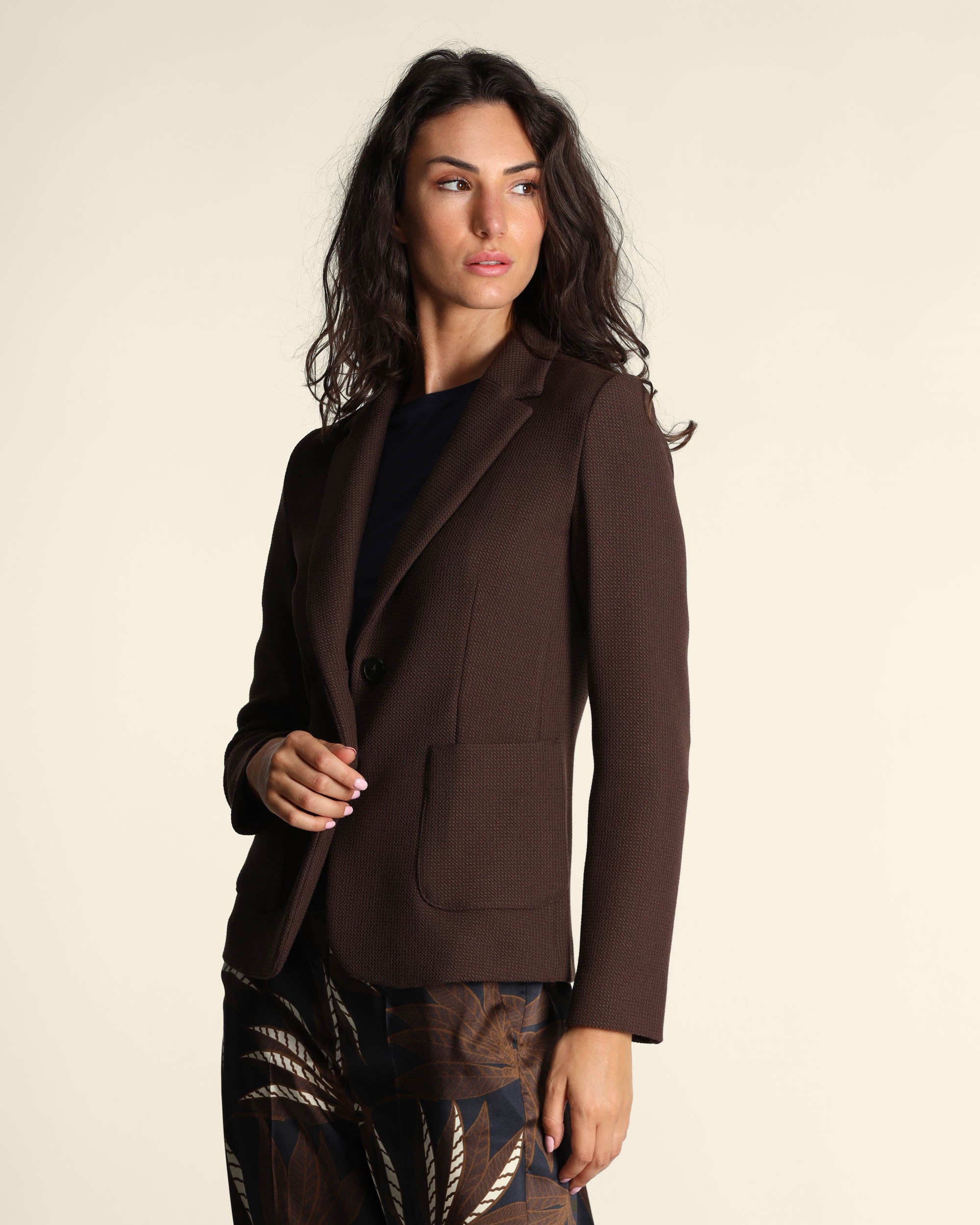 Giacca testa moro in stuoia armaturata, scollo tondo, maniche lunghe, chiusura con bottoni, linea semiaderente, tasche a filetto, sfoderata, la modella indossa una tg.42, la modella ha le seguenti misure: altezza 178, seno 86,vita 65, fianchi 93, collezione donna Emme by Marella Autunno Inverno 2025/26