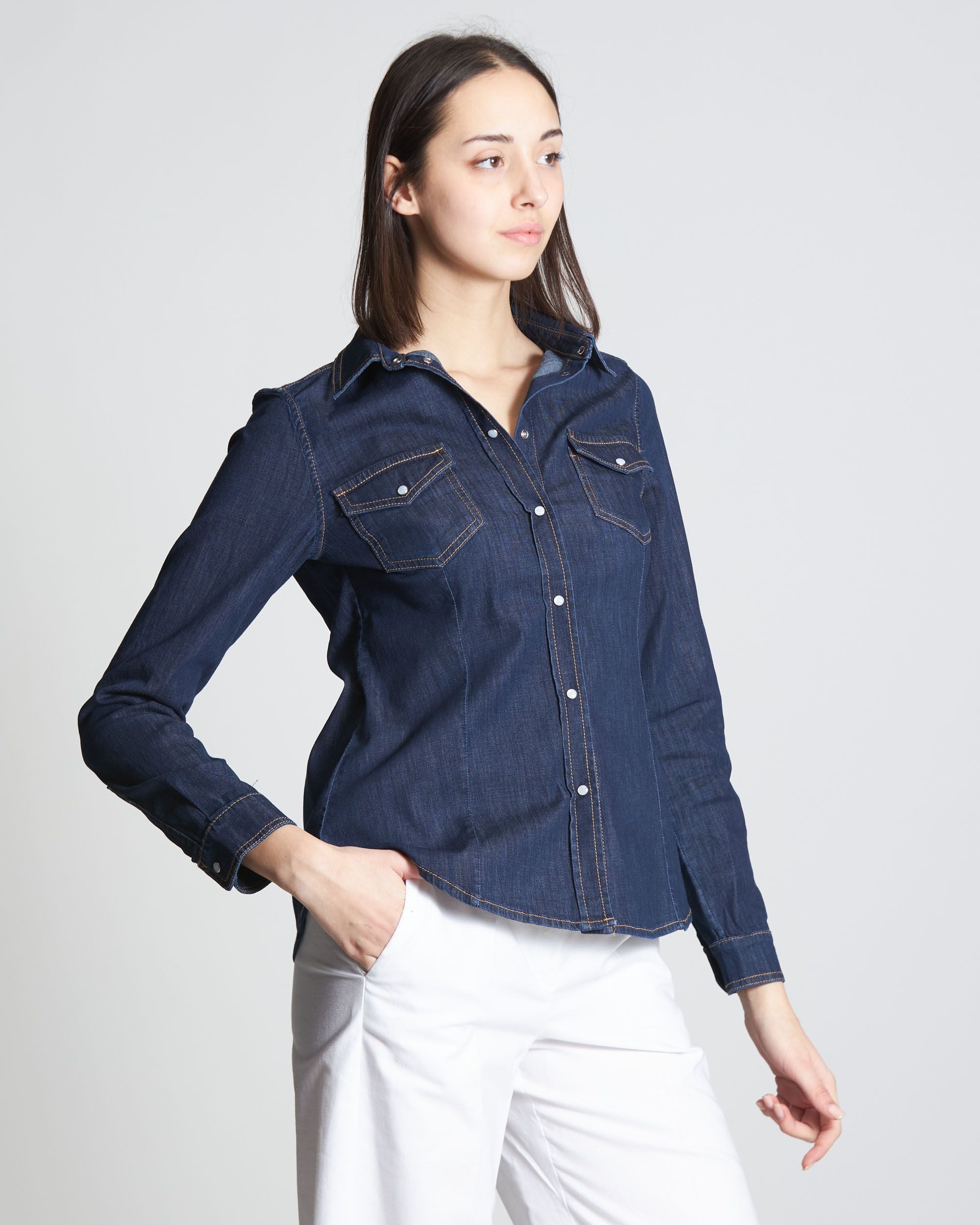 Camicia jeans in cotone stretch blu, collo a camicia, maniche lunghe con polsino, tasche con patta, chiusura con bottoni automatici, linea semiaderente, Giorgia indossa una tg.42, Giorgia ha le seguenti misure: altezza 1.78, seno 85cm, vita 70cm, fianchi 88cm, collezione donna Emme by Marella Primavera Estate 2024