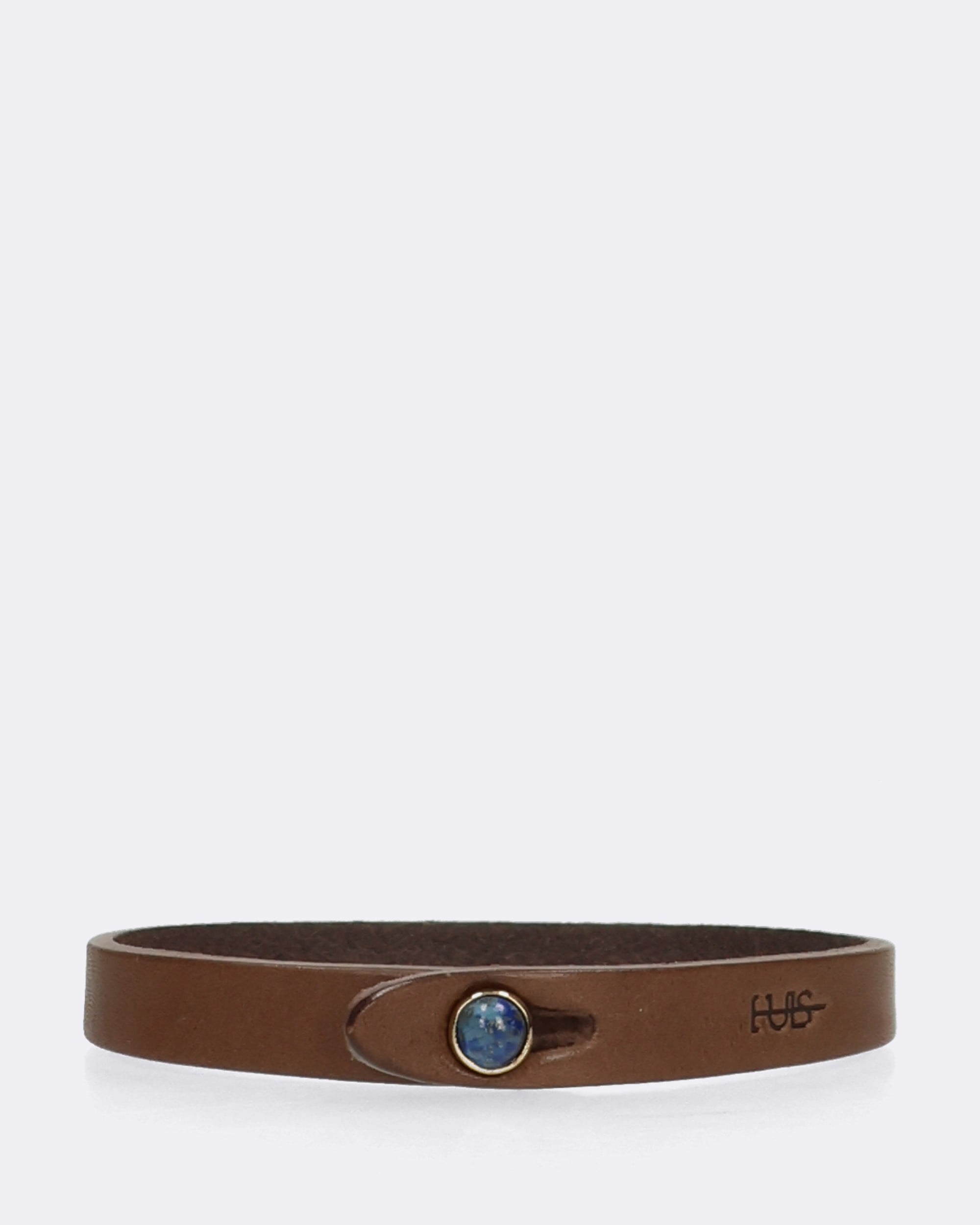 Bracciale in pelle marrone conciata al vegetale pietre dure di lapislazzuli con finitura galvanica da gioielleria in oro giallo. Fatto a mano. Made in Italy. Taglia S: circonferenza polso da 15 a 16,5 cmTaglia M: circonferenza polso da 16,5 a 18,5 cm