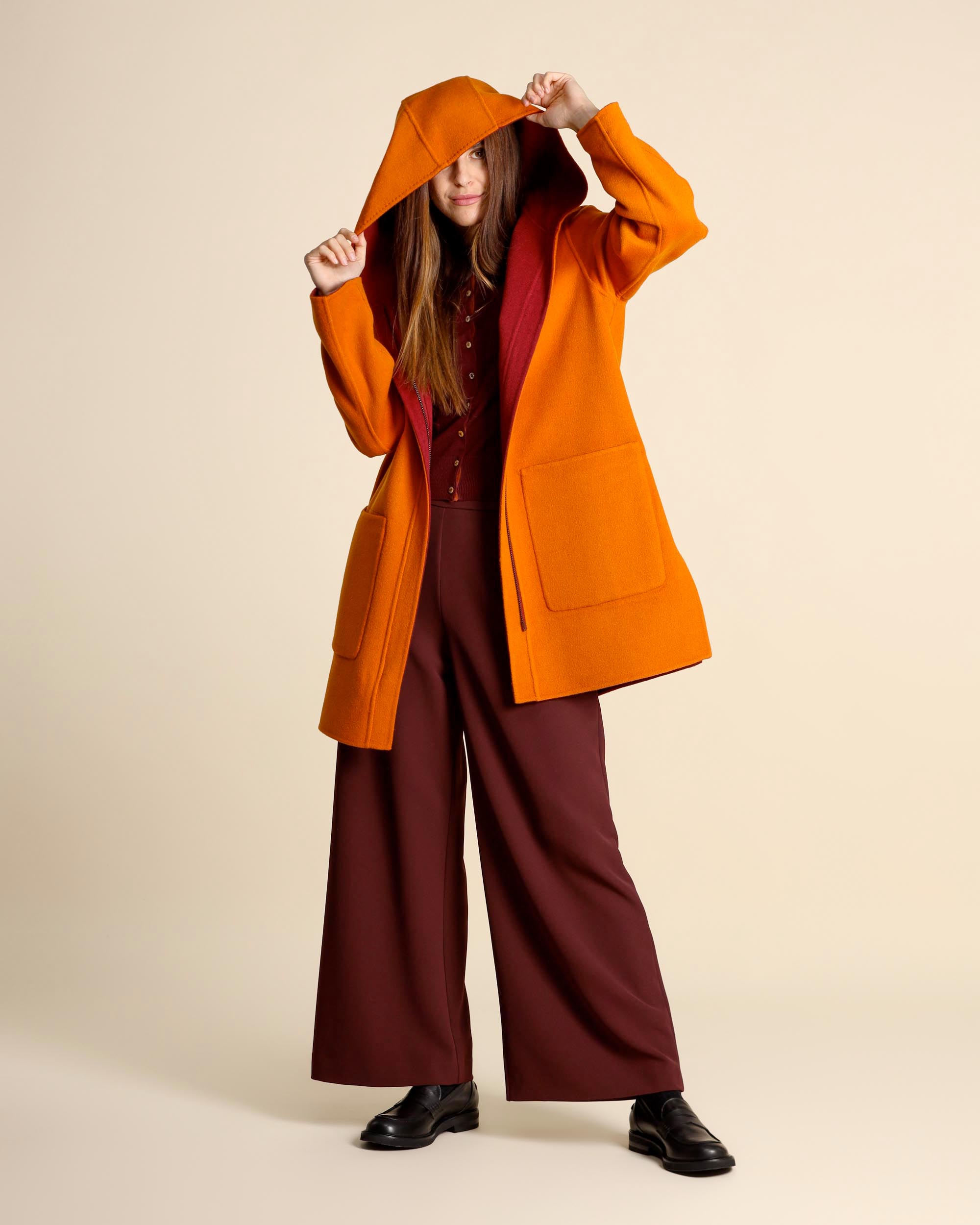 Cappotto double wool reversibile arancio e bordeaux, collo con cappuccio, maniche lunghe, giro sceso, chiusura con zip a doppio cursore, tasche applicate con patta e bottone ricoperto da una parte e tasche applicate dall'altro, spacchi laterali, linea morbida, la modella indossa una tg.42, la modella ha le seguenti misure: altezza 177, seno 87,vita 65, fianchi 93, collezione donna Maliparmi Autunno Inverno 2025/26