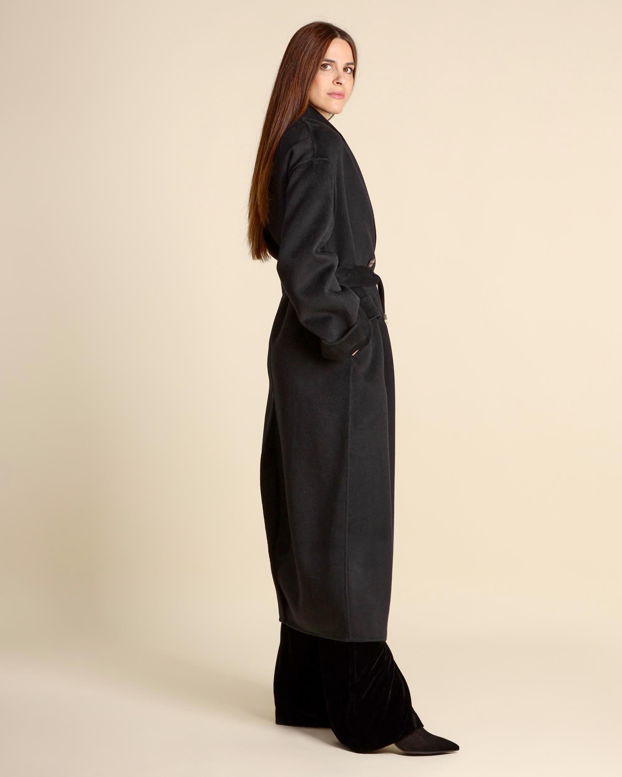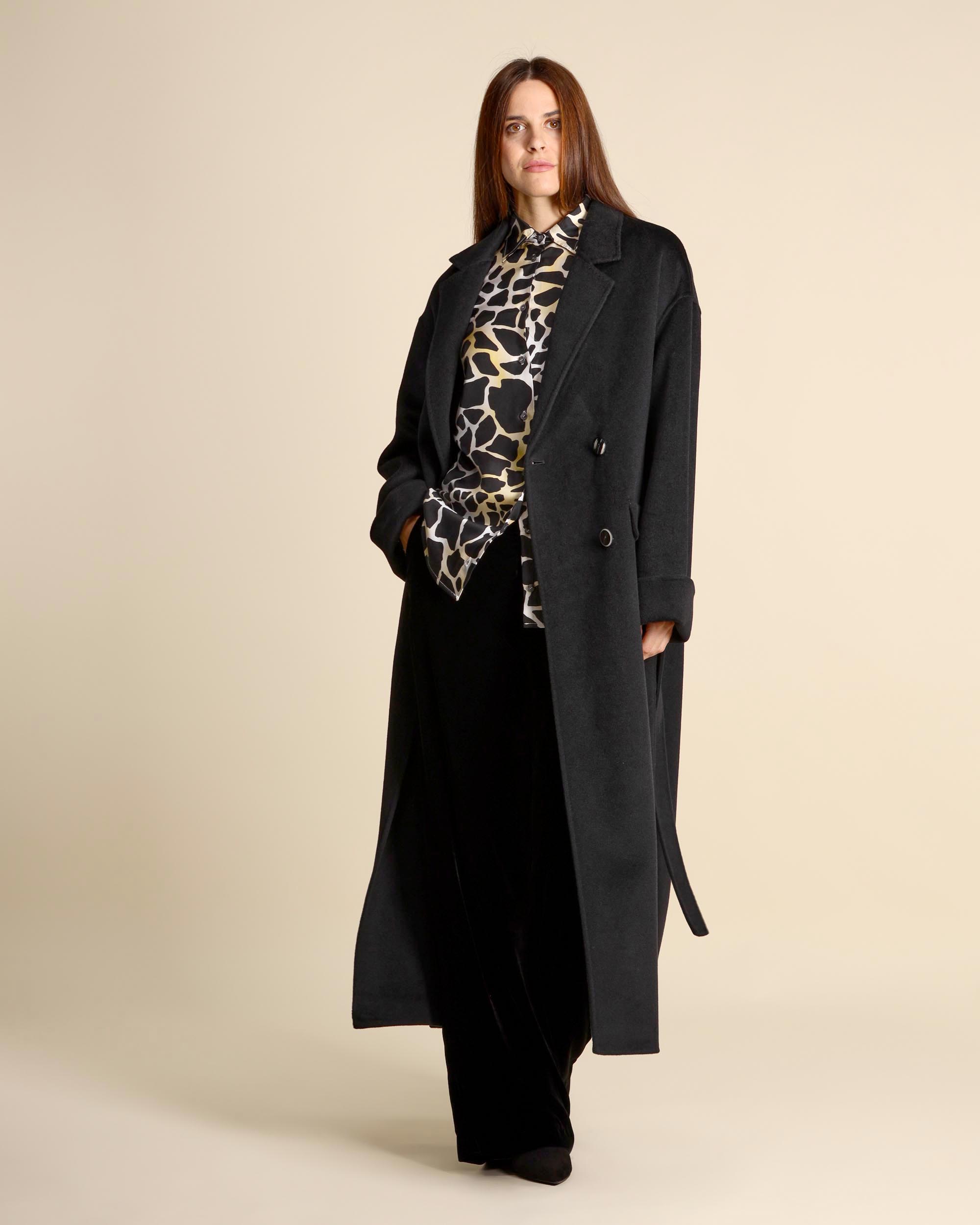 Cappotto nero doppiopetto in lana, collo a rever, chiusura con mix di bottoni, tasche con patta, maniche lunghe, giro sceso, cintura coordinata, linea ampia, sfoderato, spacco centrale sul dietro, la modella indossa una tg.42, la modella ha le seguenti misure: altezza 178, seno 86,vita 65, fianchi 93, collezione donna Maliparmi Autunno Inverno 2025/26