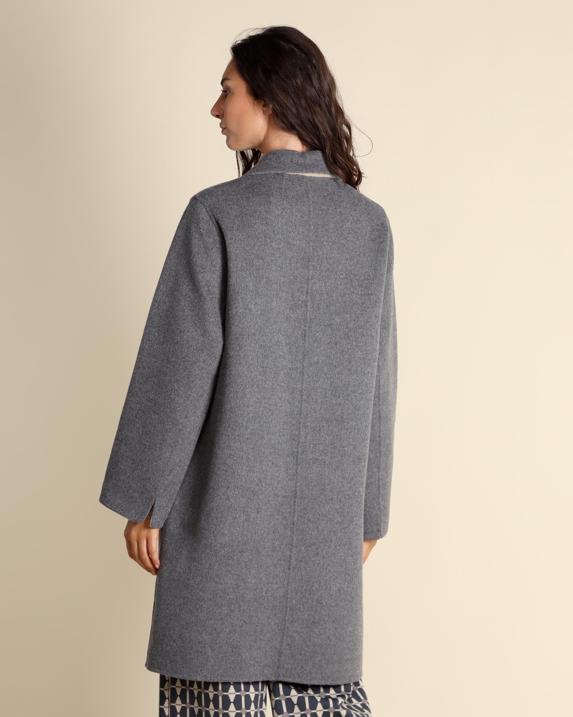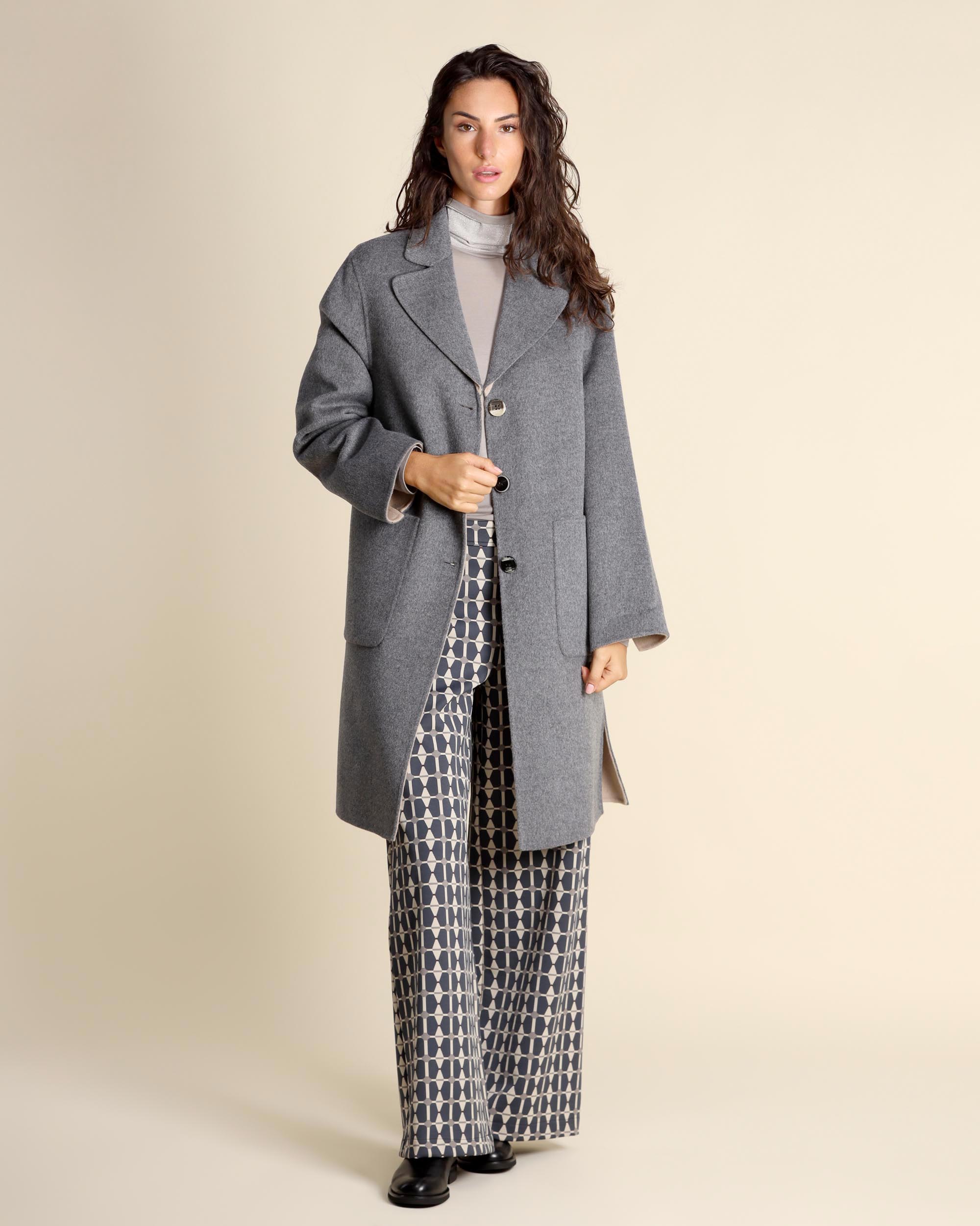 Cappotto in misto lana reversibile, grigio melange da un lato e beige dall'altro, collo a rever, chiusura con bottoni, tasche applicate, maniche lunghe, linea morbida, spacchi laterali, la modella indossa una tg.42, la modella ha le seguenti misure: altezza 178, seno 86,vita 65, fianchi 93, collezione donna Maliparmi Autunno Inverno 2025/26
