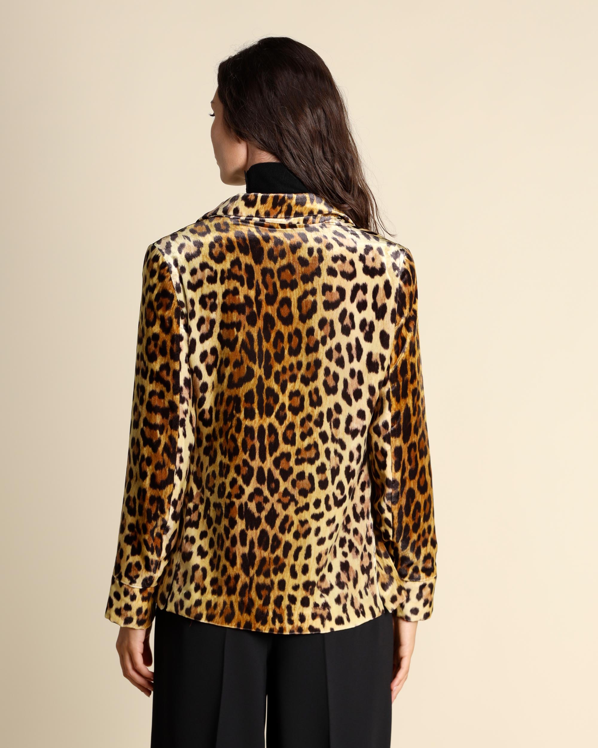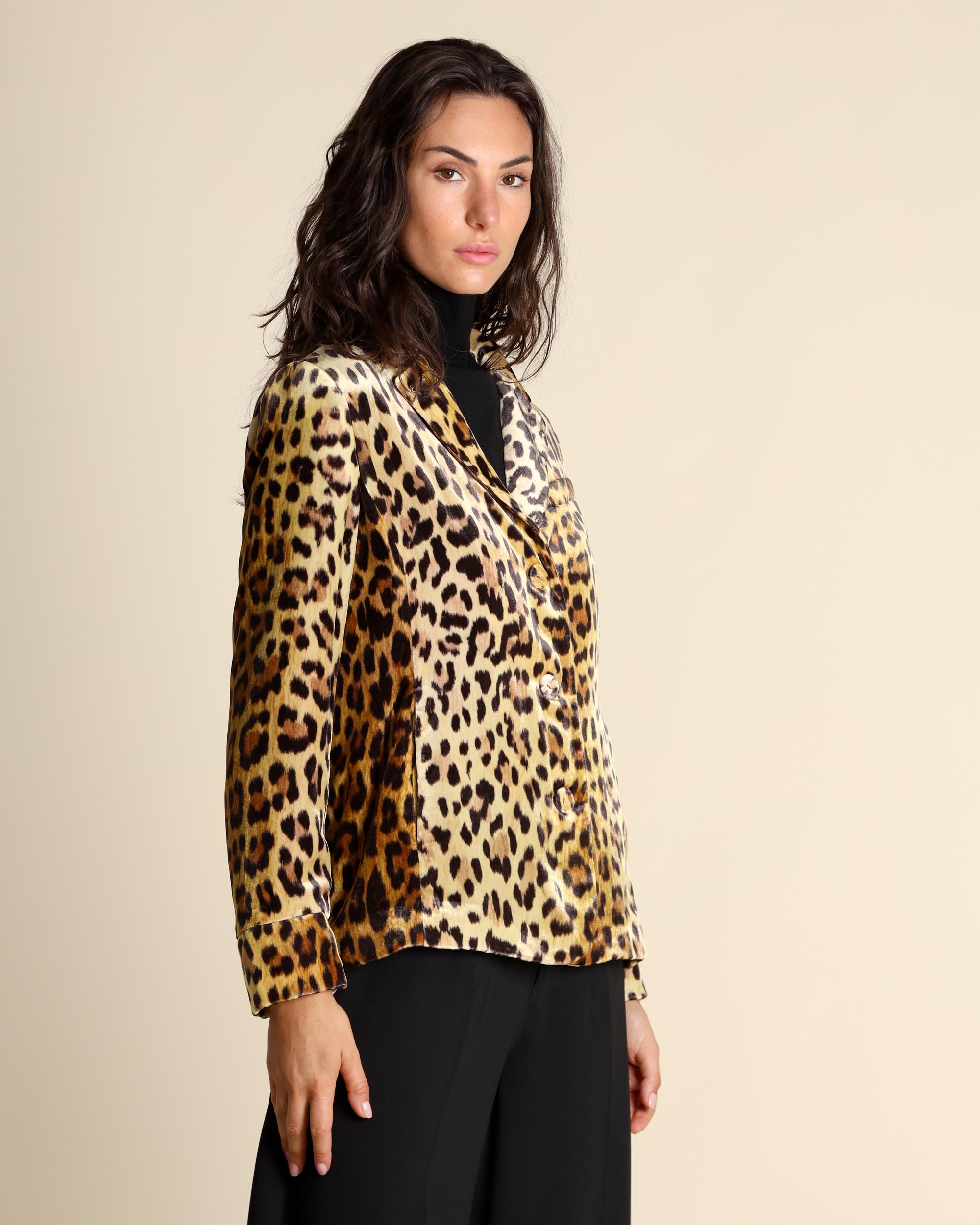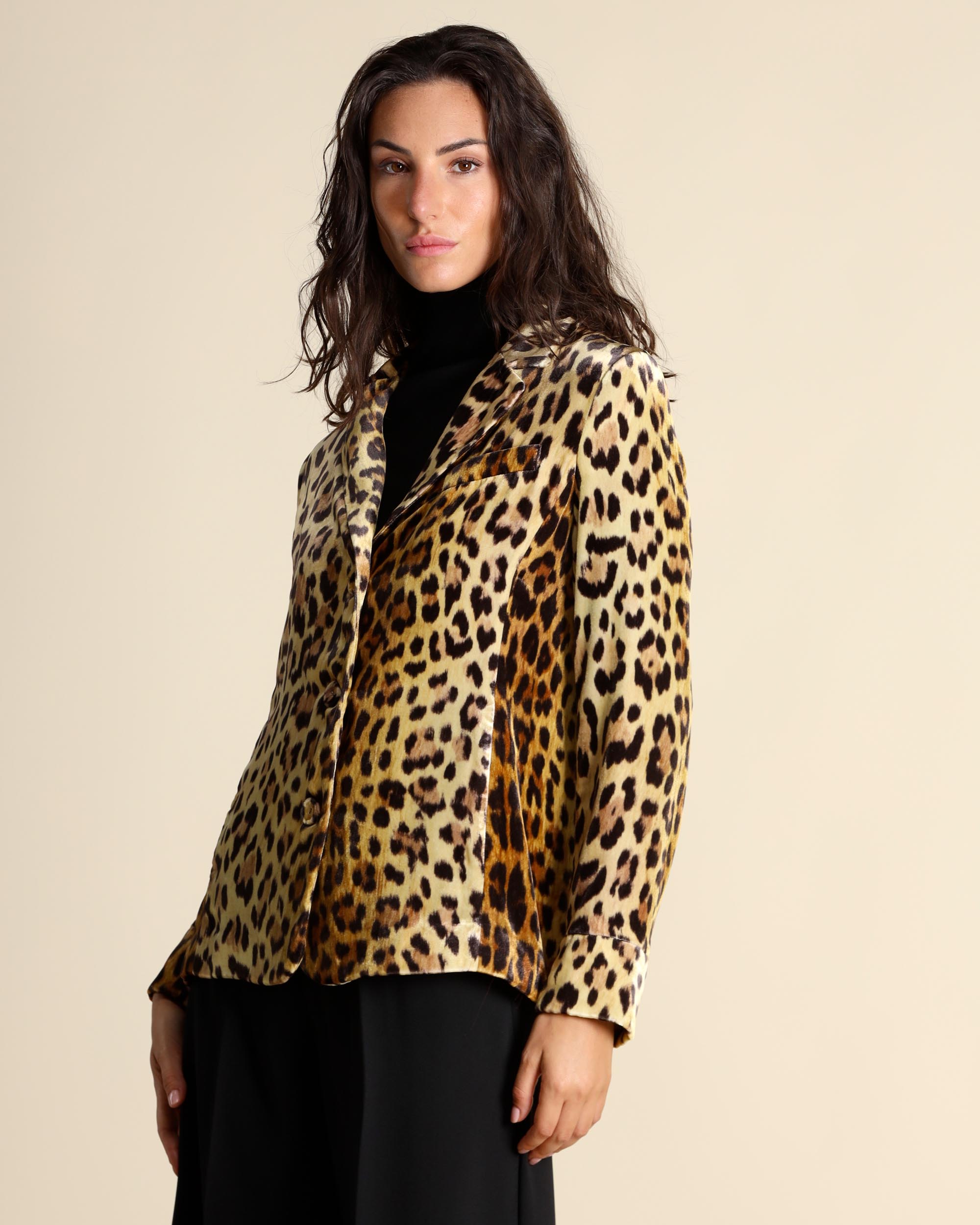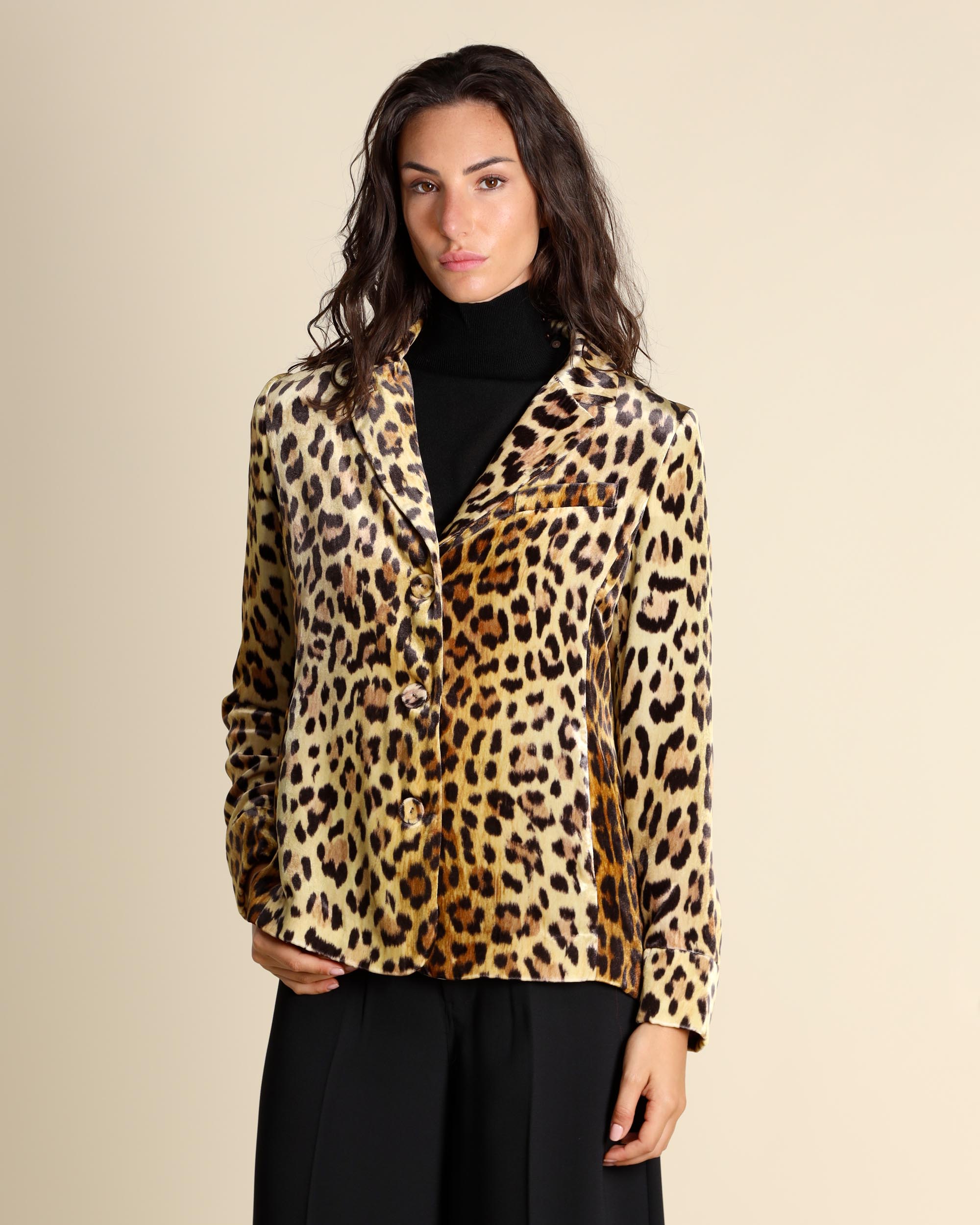 Giacca animalier in velluto di viscosa e seta, collo a rever, chiusura con bottoni ricoperti, tasche a filetto, maniche lunghe, linea dritta, foderata, spacchi laterali, la modella indossa una tg.42, la modella ha le seguenti misure: altezza 178, seno 86,vita 65, fianchi 93, collezione donna Maliparmi Autunno Inverno 2025/26