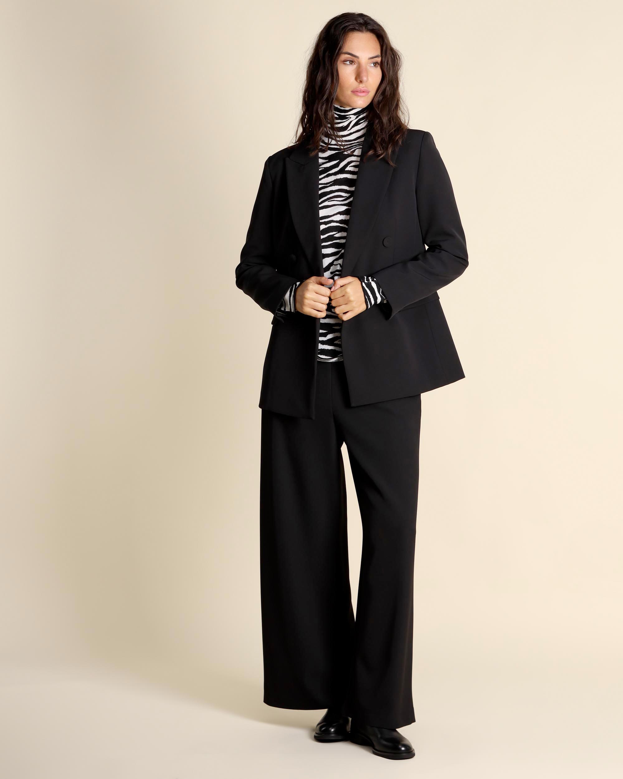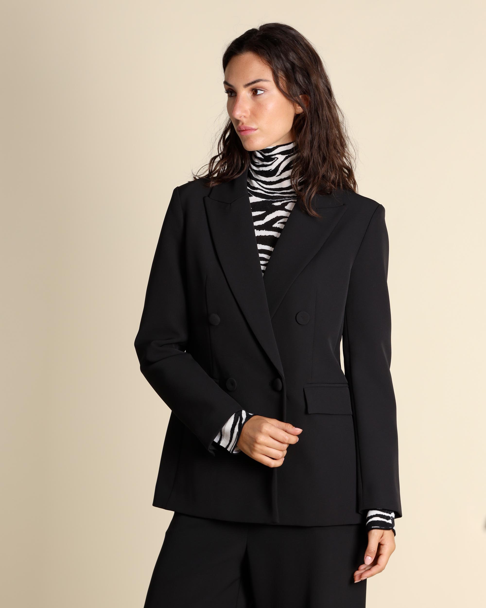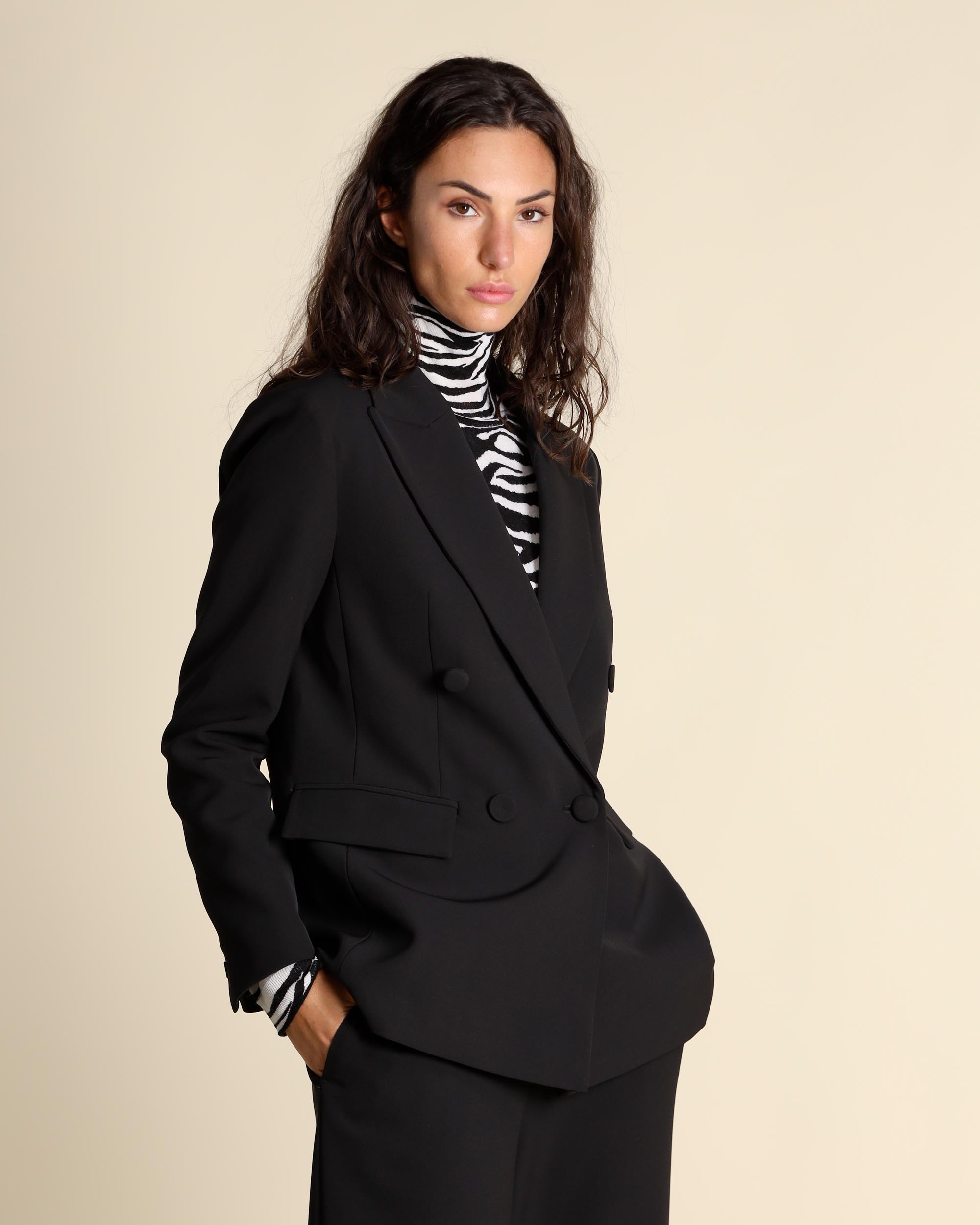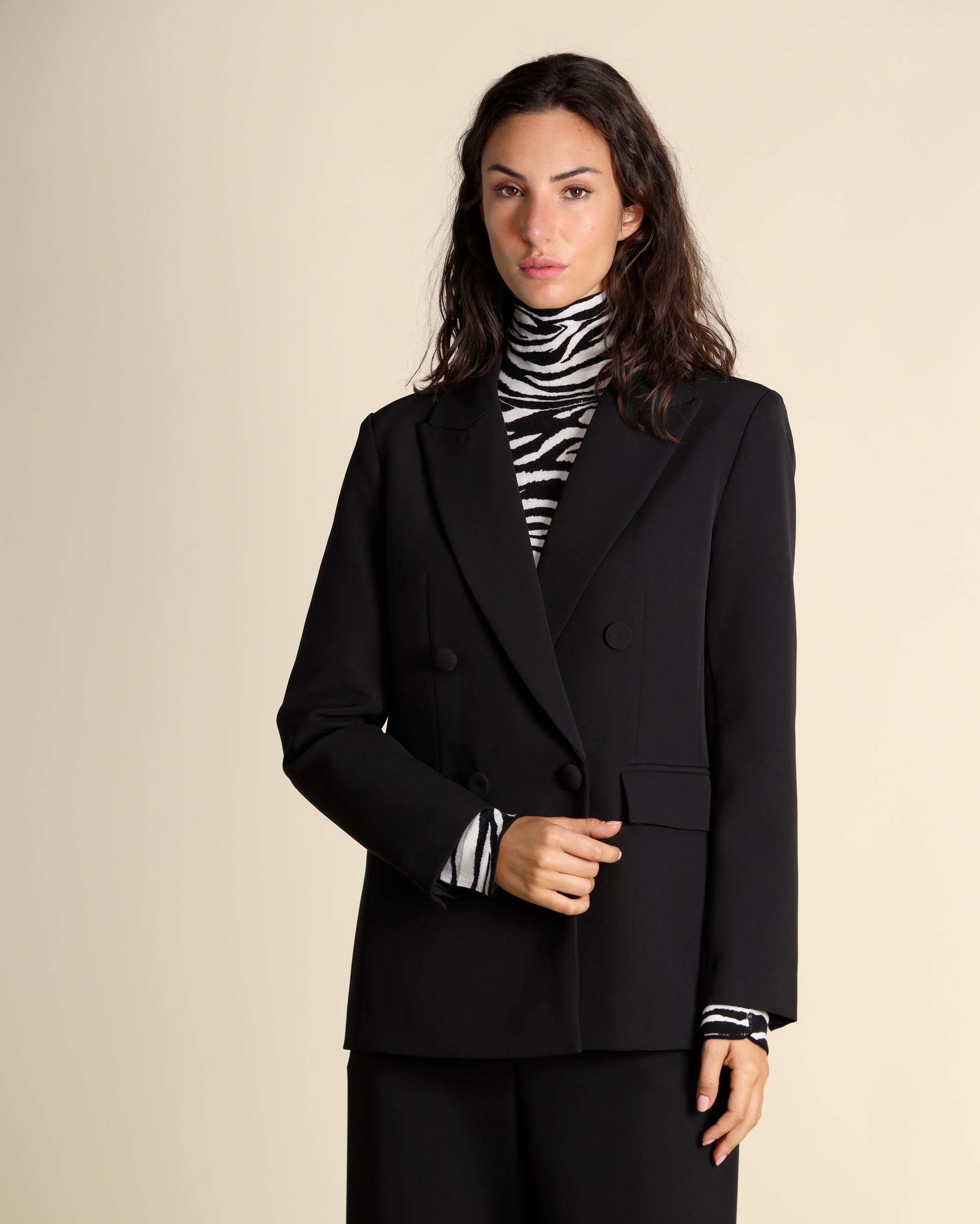 Giacca nera doppiopetto in cady, collo a rever, chiusura con bottoni ricoperti, tasche con patta, maniche lunghe, linea morbida, foderata, spacco centrale sul dietro, la modella indossa una tg.42, la modella ha le seguenti misure: altezza 178, seno 86,vita 65, fianchi 93, collezione donna Maliparmi Autunno Inverno 2025/26