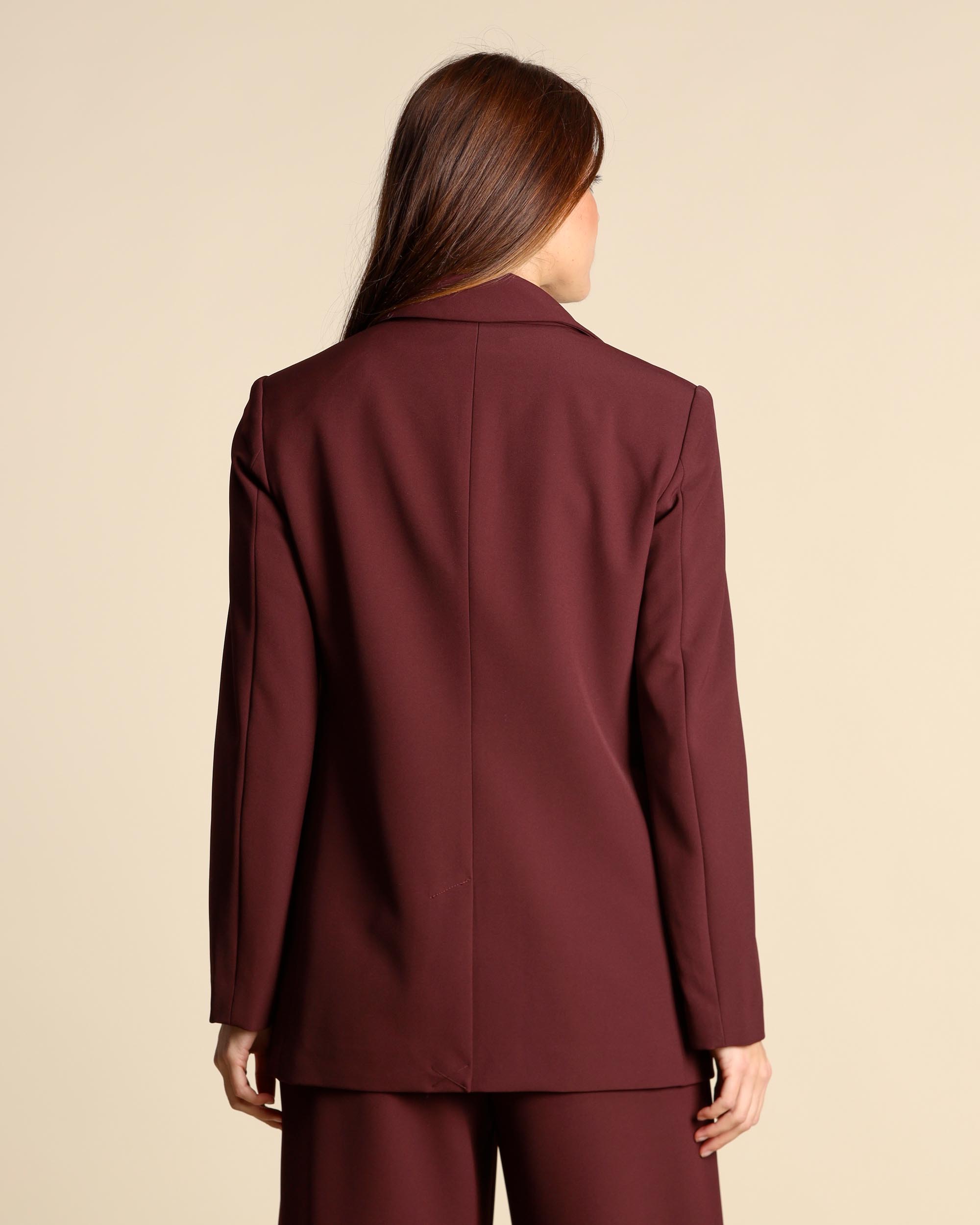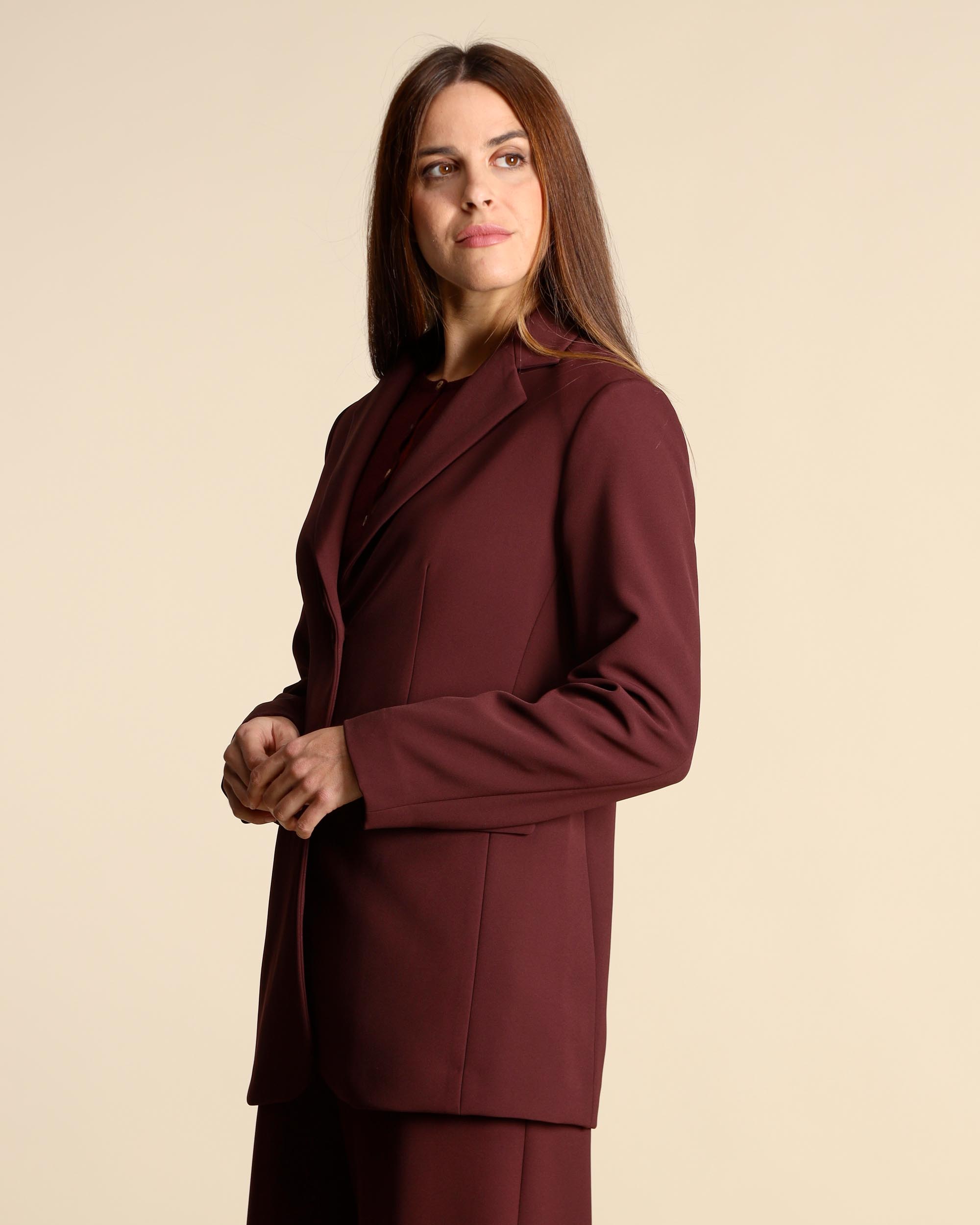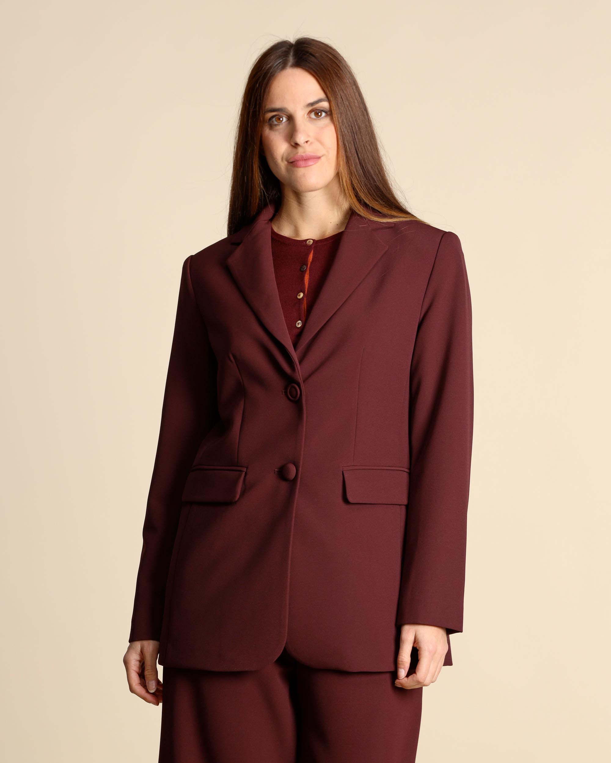 Giacca cady in color mosto, collo a rever, chiusura con bottoni, tasche con patta, maniche lunghe, linea morbida, foderata, spacco centrale sul dietro, la modella indossa una tg.42, la modella ha le seguenti misure: altezza 178, seno 86,vita 65, fianchi 93, collezione donna Maliparmi Autunno Inverno 2025/26