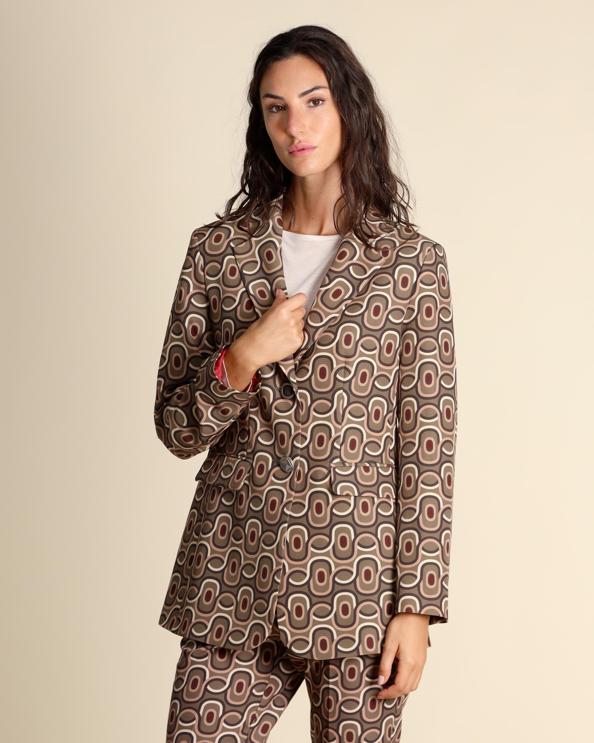 Giacca jacquard in tessuto tecnico verde, crema e rosso, collo a rever, chiusura con bottoni, tasche con patta, maniche lunghe, linea morbida, foderata, spacco centrale sul dietro, la modella indossa una tg.42, la modella ha le seguenti misure: altezza 178, seno 86,vita 65, fianchi 93, collezione donna Maliparmi Autunno Inverno 2025/26