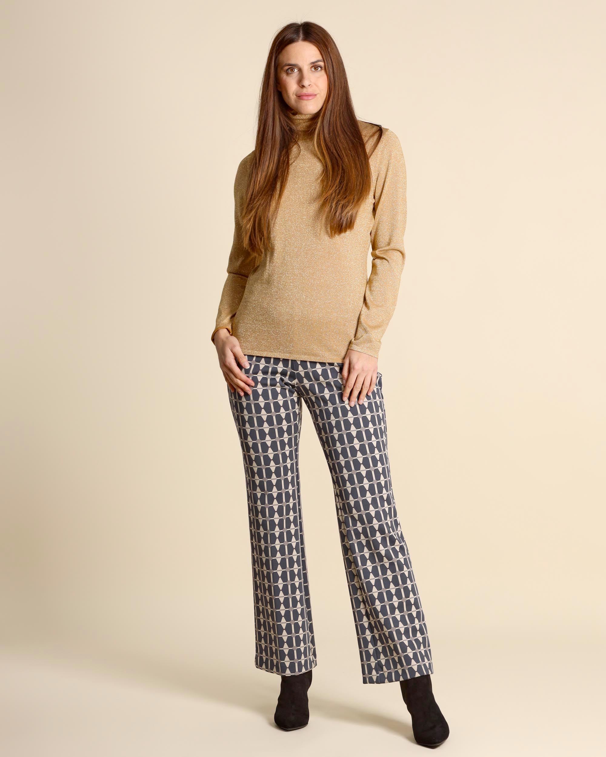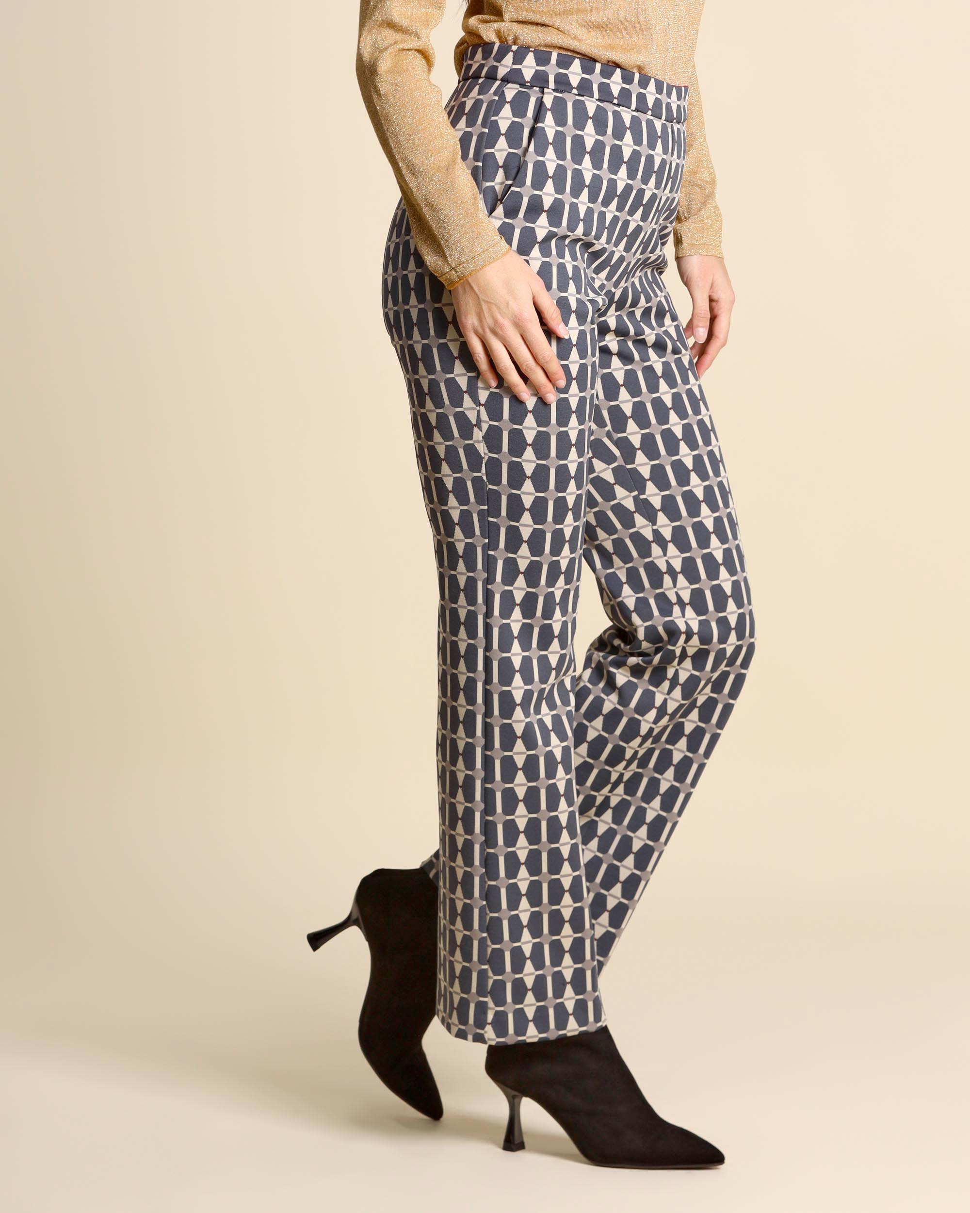 Pantaloni jacquard in jersey interlock grigio, rosso e beige, chiusura laterale con zip invisibile, tasche alla francese, linea alla caviglia leggermente svasata sul fondo, la modella indossa una tg.42, la modella ha le seguenti misure: altezza 178, seno 86,vita 65, fianchi 93, collezione donna Maliparmi Autunno Inverno 2025/26