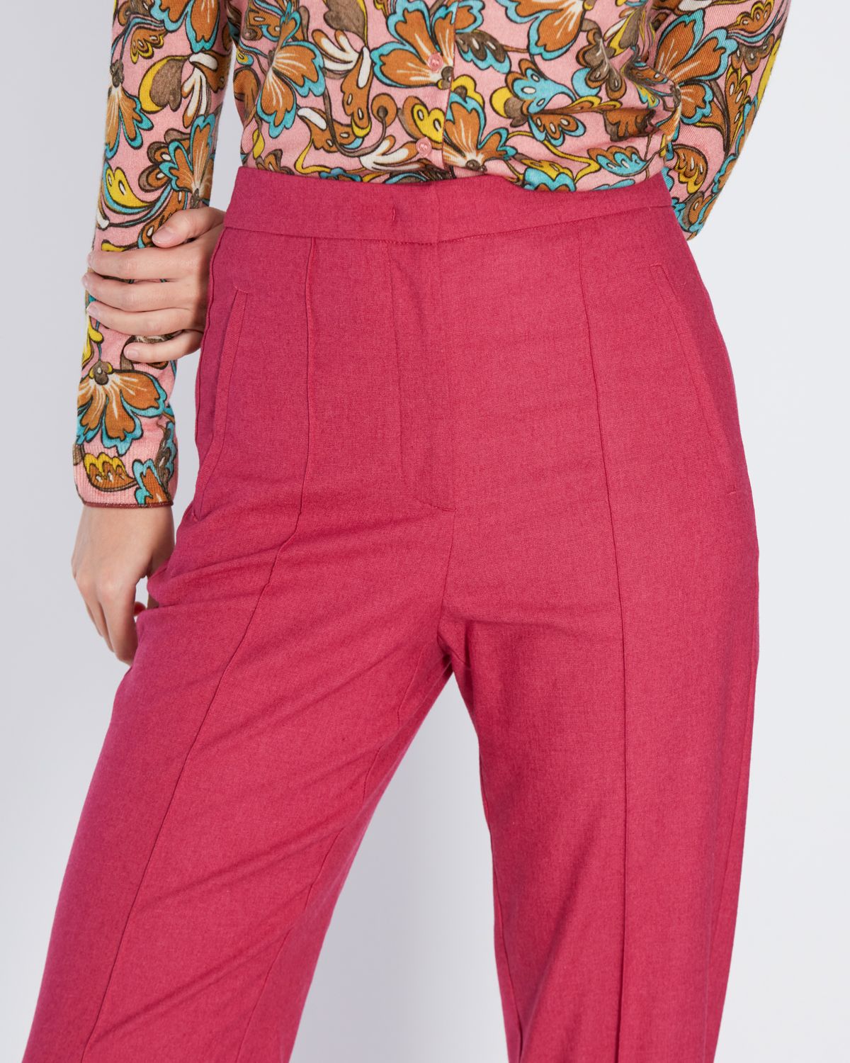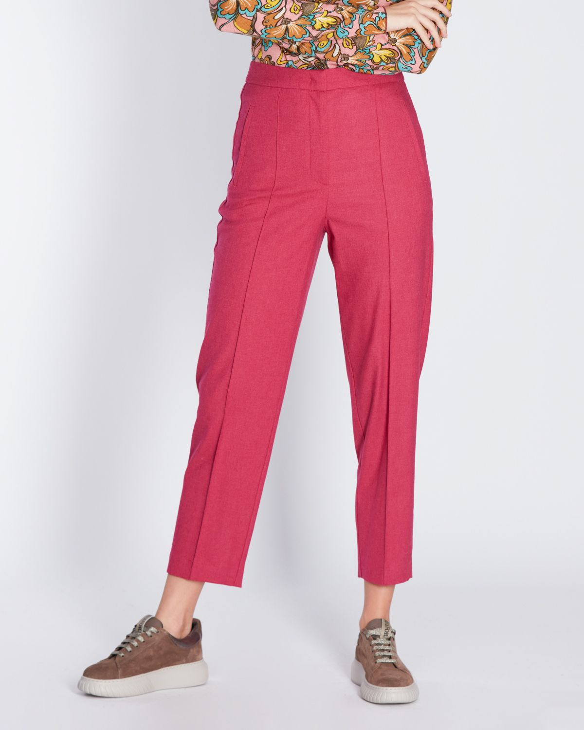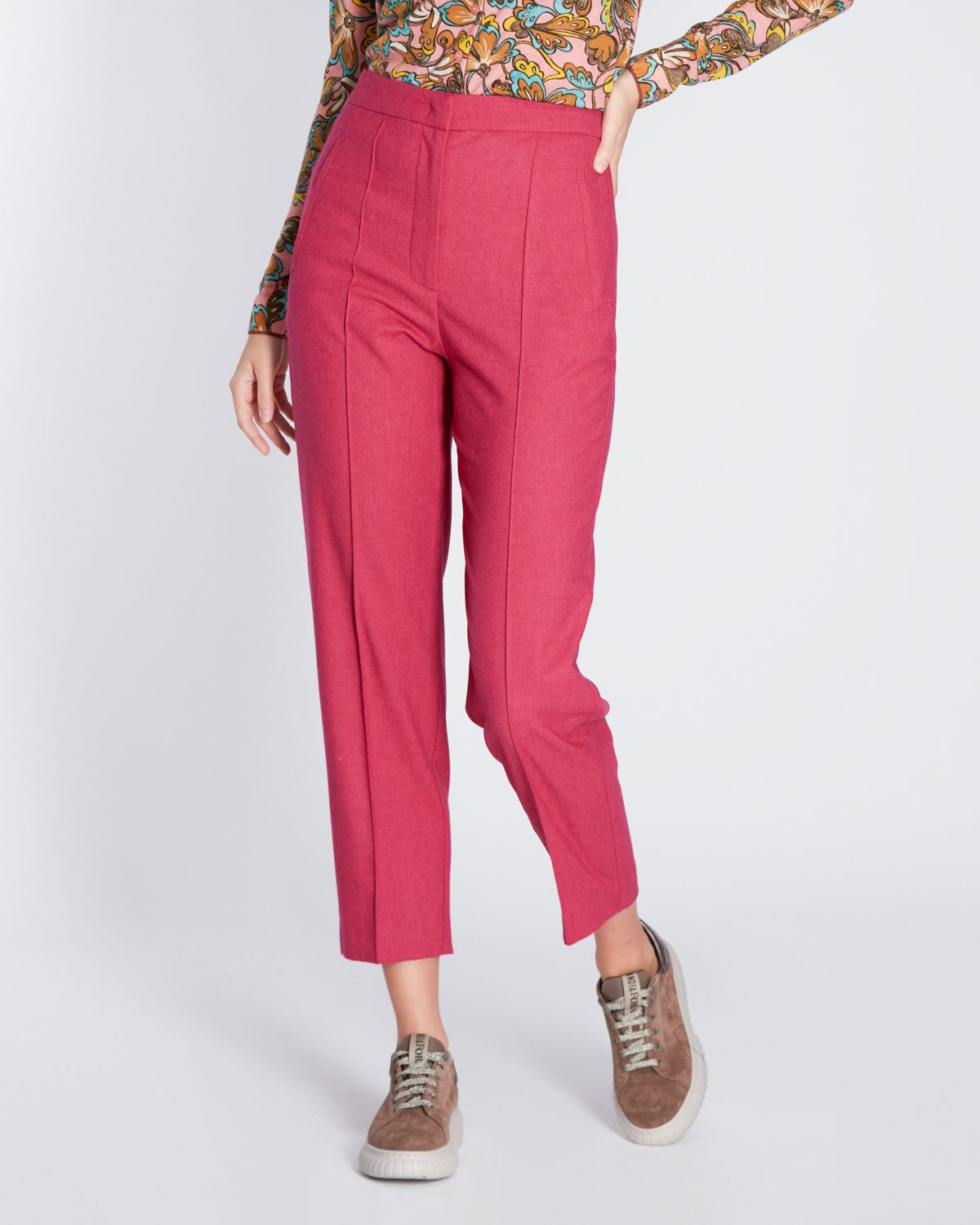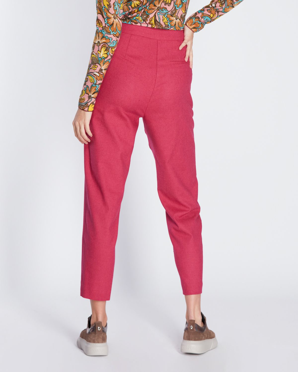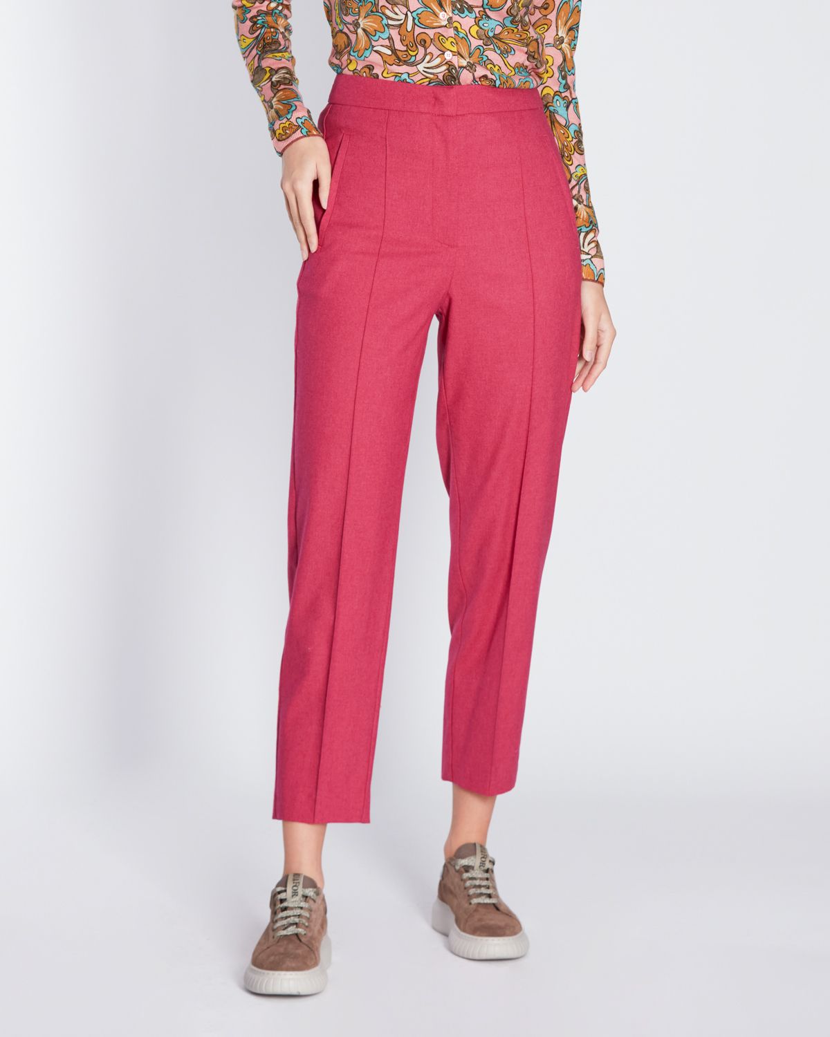 Pantaloni color rosa indiano in flanella di misto viscosa e lana stretch, vita regolare, chiusura con gancio e zip nascosta, tasche a filetto, linea dritta, Giorgia indossa una tg.40, Giorgia ha le seguenti misure:altezza 1.78, seno 85cm, vita 70cm, fianchi 88cm, collezione donna Maliparmi Autunno Inverno 2022
