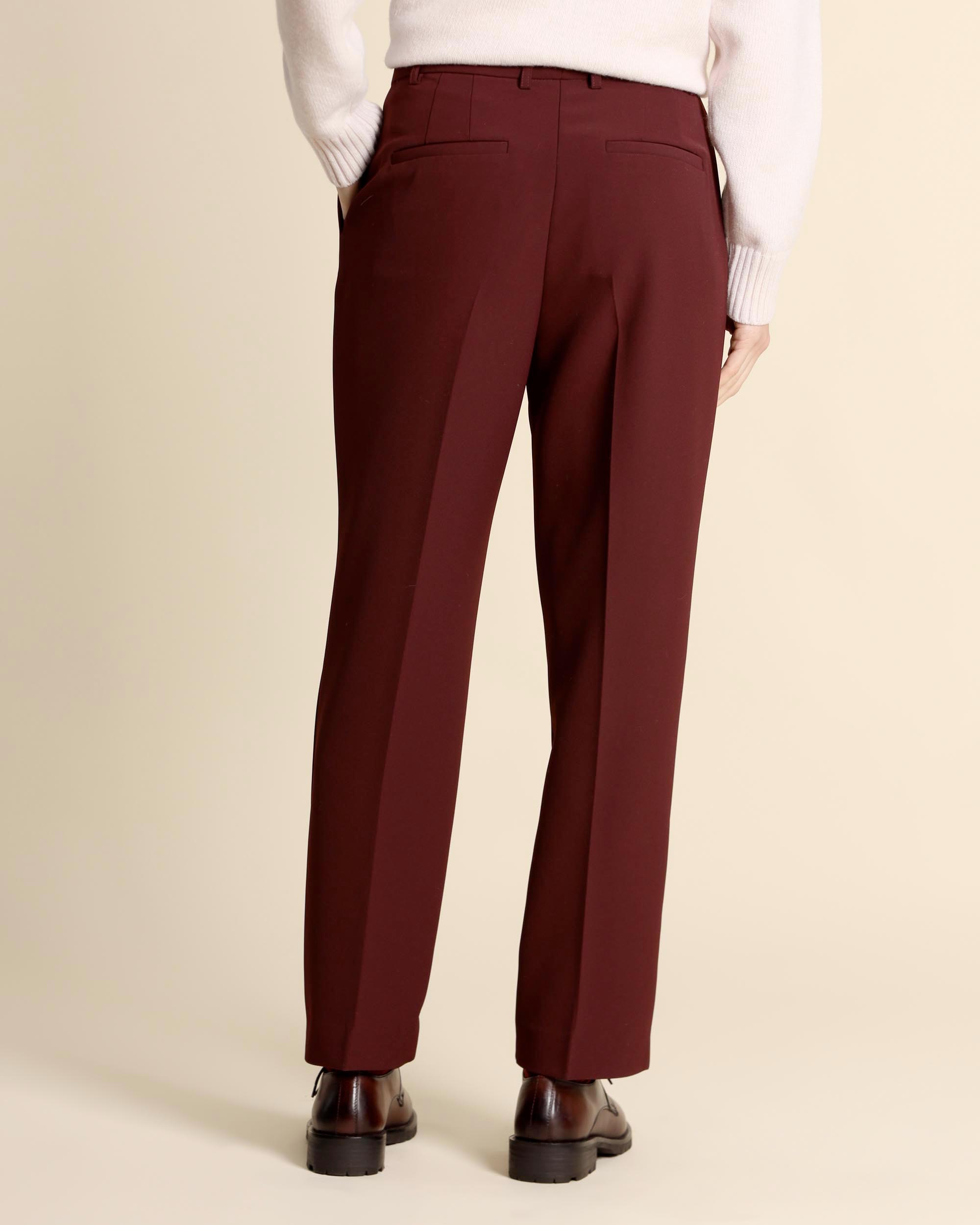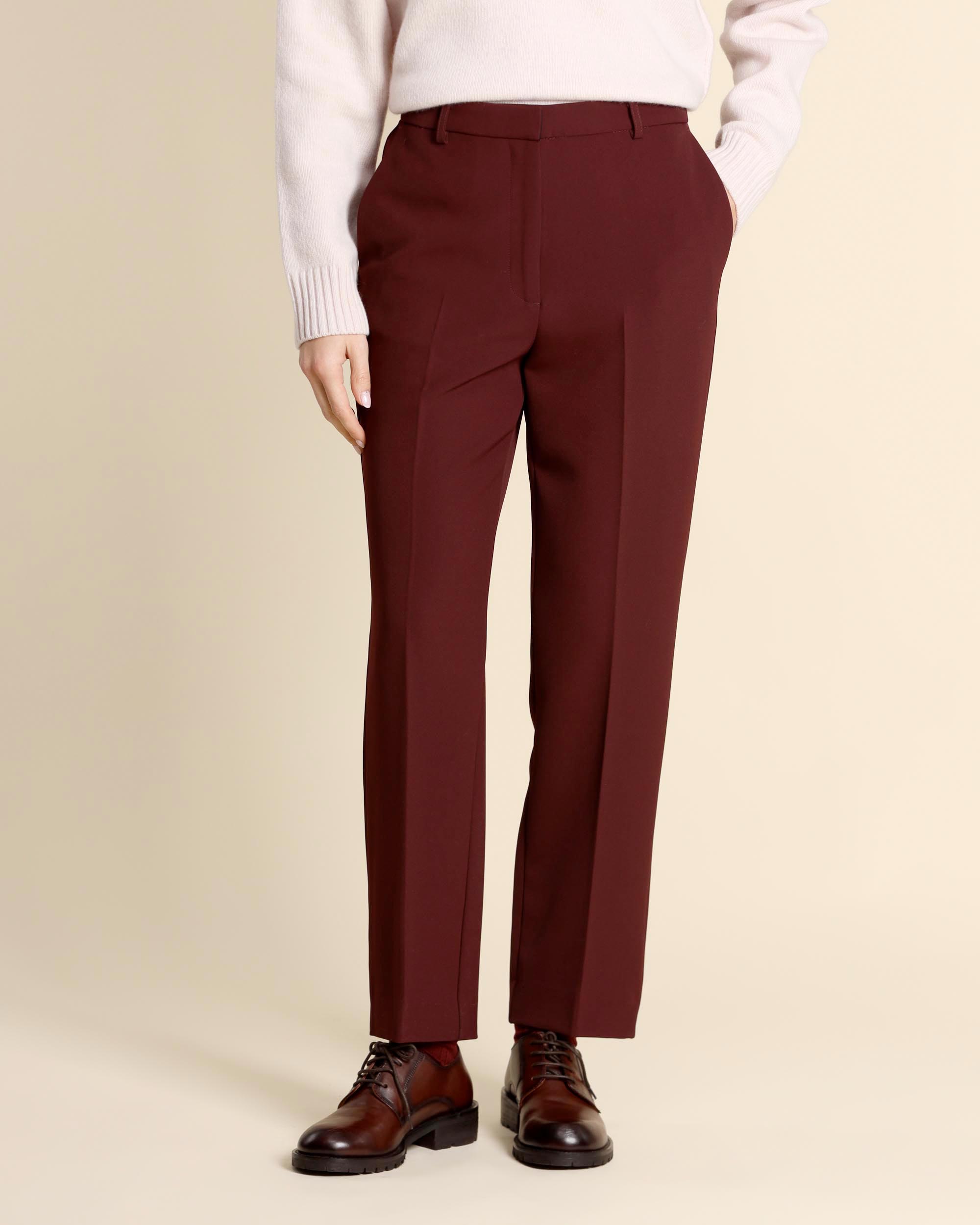 Pantaloni color mosto in cady, tasche alla francese sul davanti e tasche a filetto sul dietro, chiusura con gancio e zip nascosta, piega stirata, linea a sigaretta, spacchi laterali sul fondo, la modella indossa una tg.42, la modella ha le seguenti misure: altezza 178, seno 86,vita 65, fianchi 93, collezione donna Maliparmi Autunno Inverno 2025/26