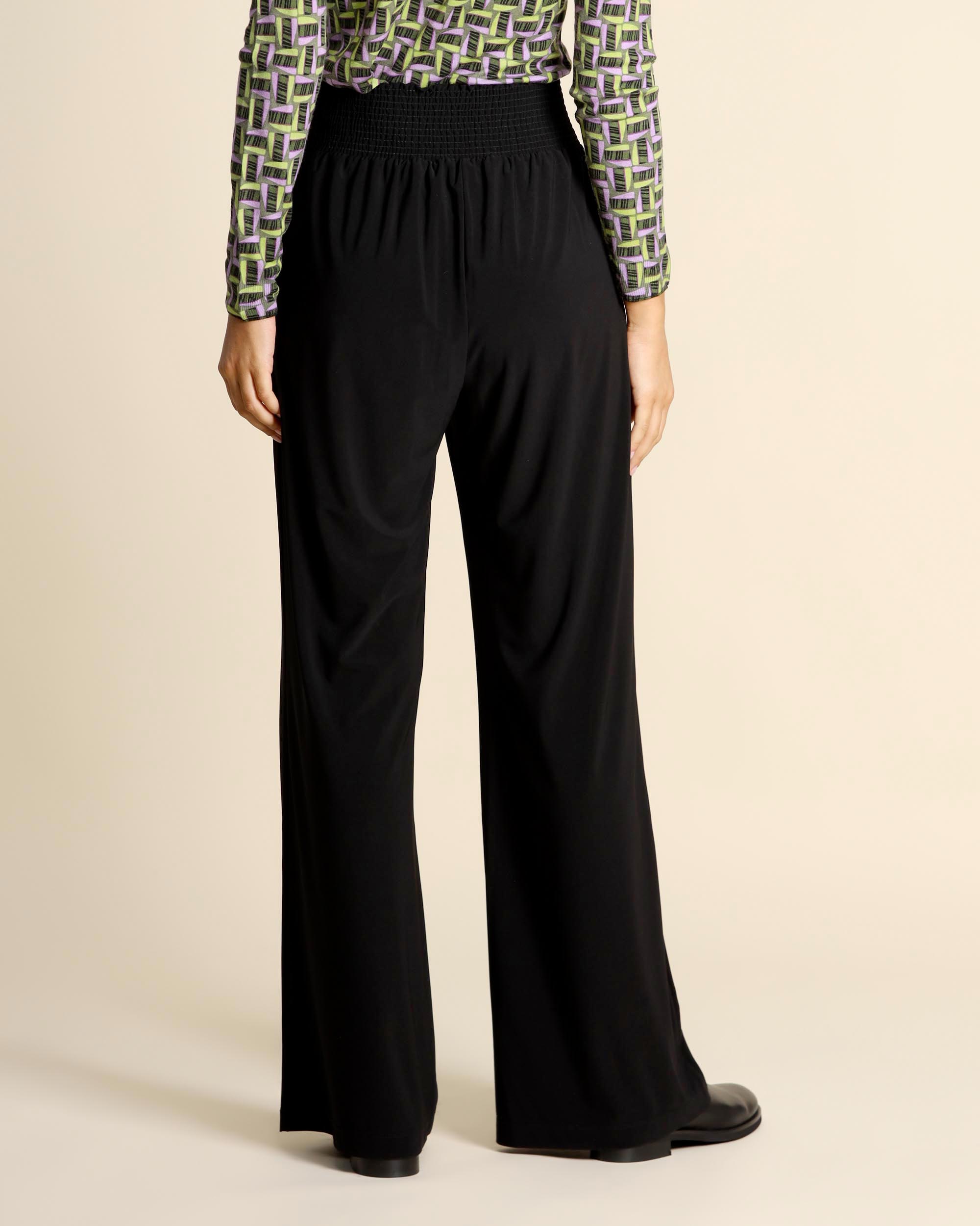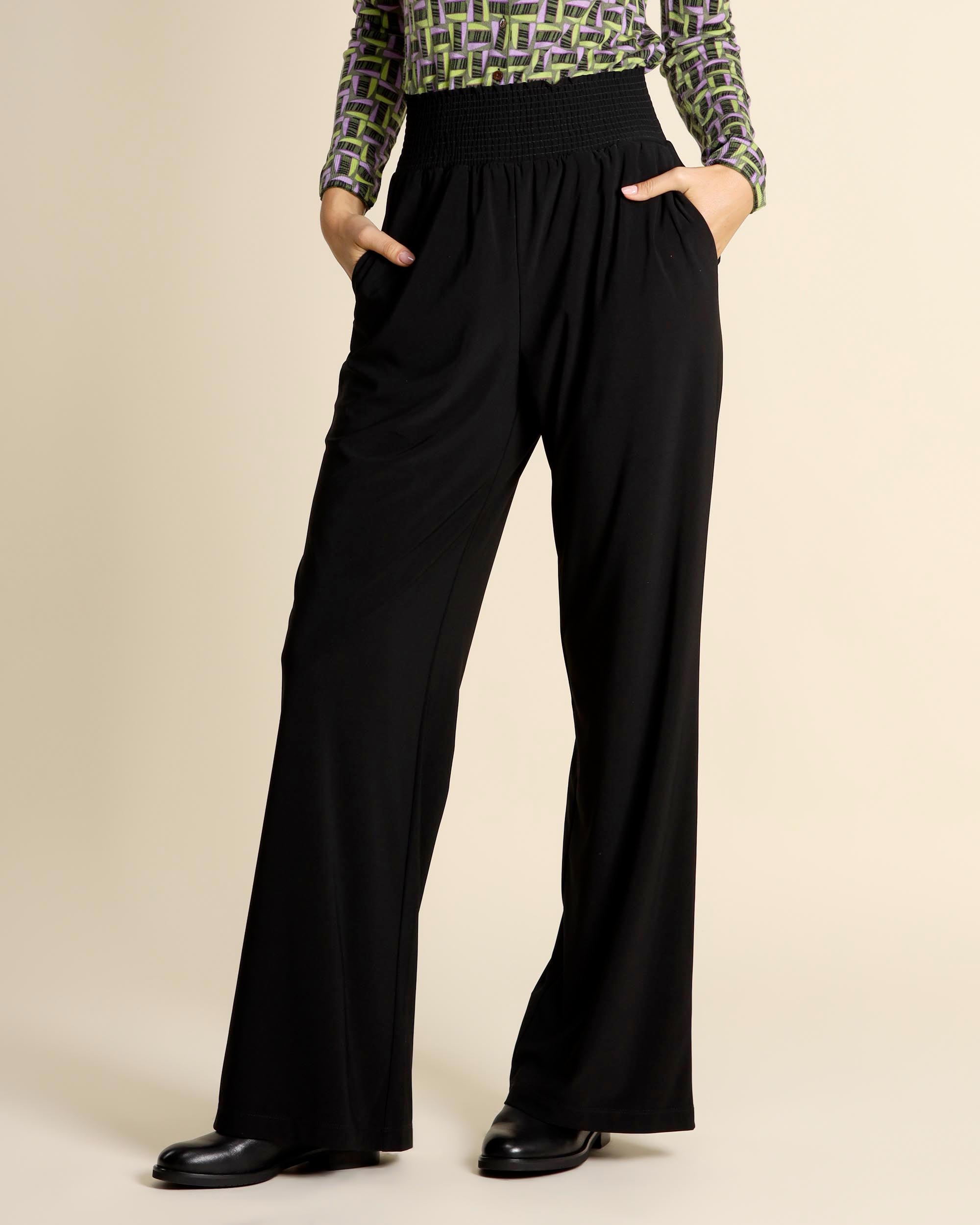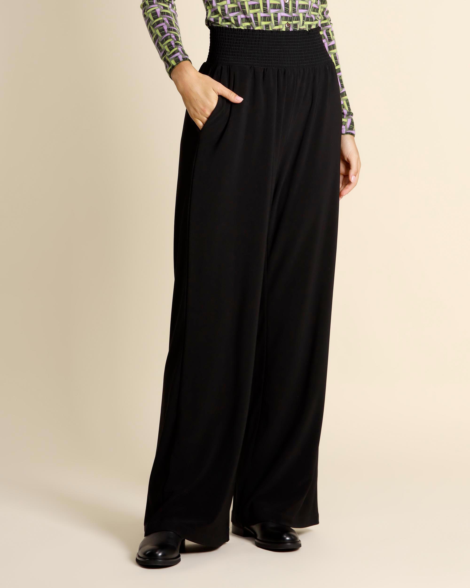 Pantaloni neri in jersey stretch, vita elastica, tasche alla francese, linea ampia, made in Italy, la modella indossa una tg.42, la modella ha le seguenti misure: altezza 178, seno 86,vita 65, fianchi 93, collezione donna Maliparmi Autunno Inverno 2025/26