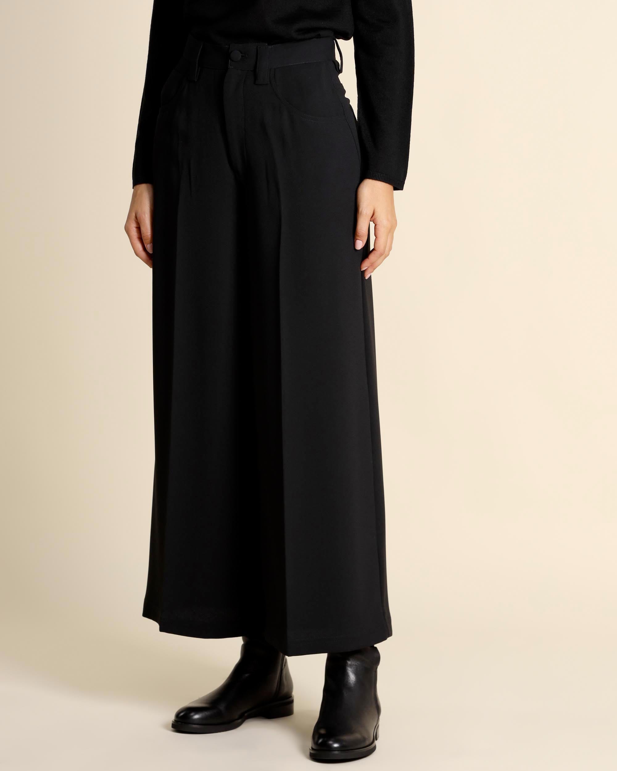 Pantaloni neri in cady stretch, vita elastica sul dietro, tasche alla francese, linea ampia, made in Italy, la modella indossa una tg.42, la modella ha le seguenti misure: altezza 178, seno 86,vita 65, fianchi 93, collezione donna Maliparmi Autunno Inverno 2025/26
