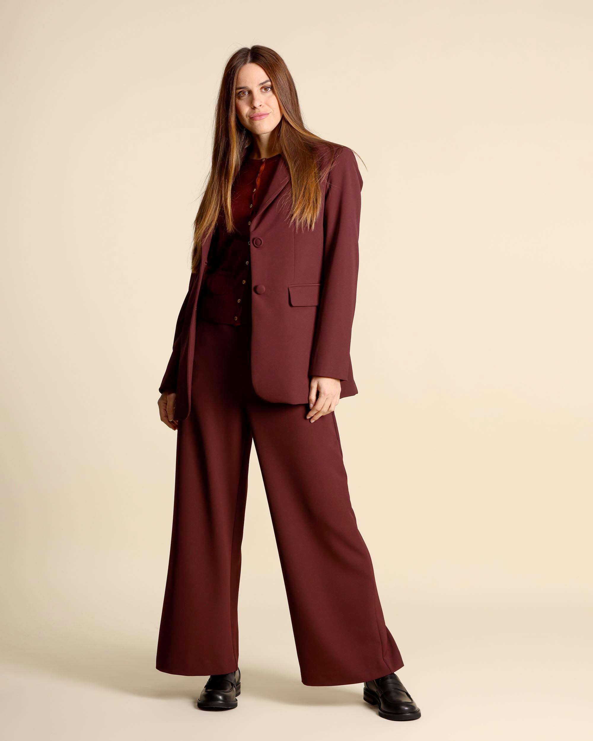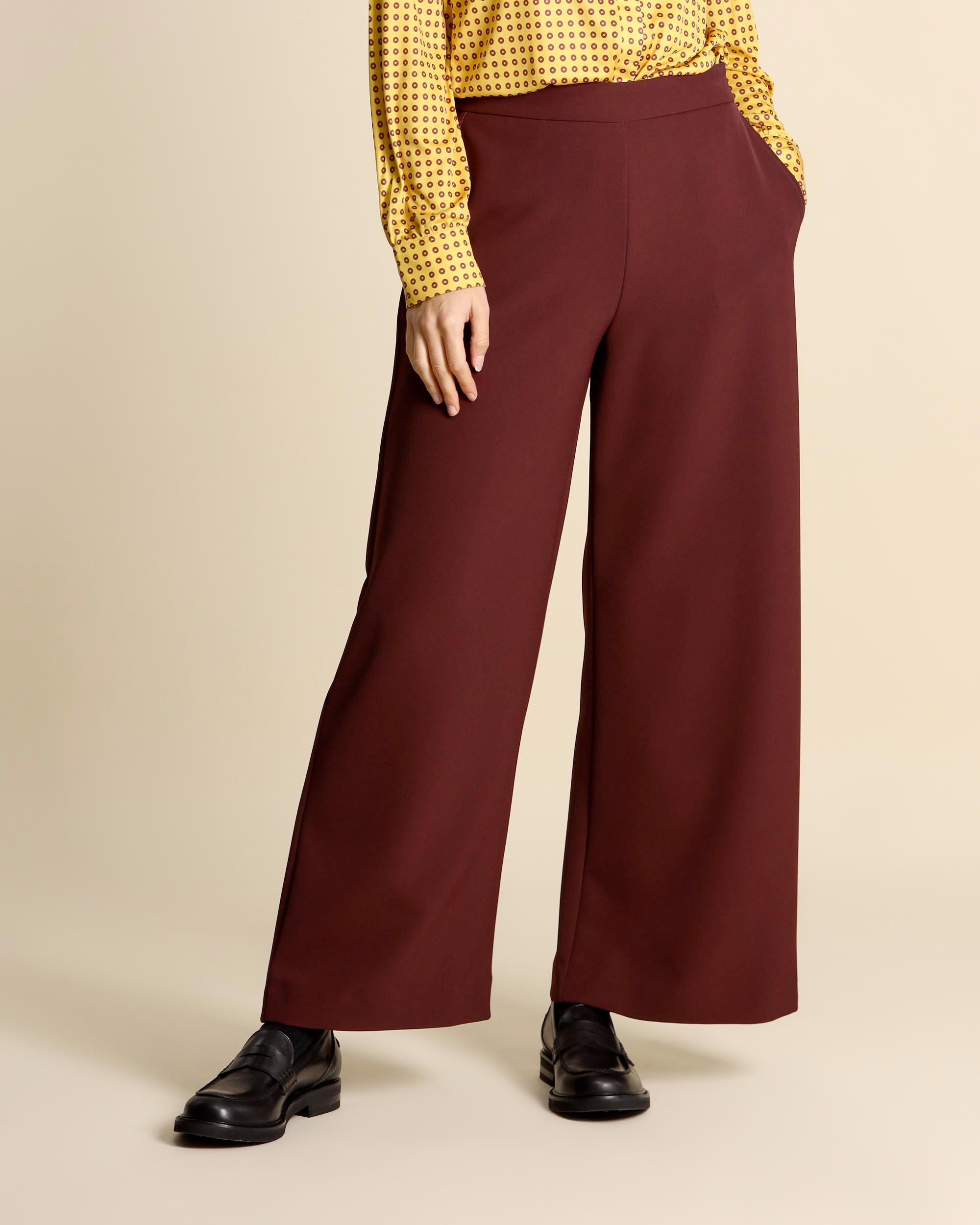 Pantaloni color mosto in cady, tasche inserite sul fianco, vita elastica sul dietro, la modella indossa una tg.42, la modella ha le seguenti misure: altezza 178, seno 86,vita 65, fianchi 93, collezione donna Maliparmi Autunno Inverno 2025/26