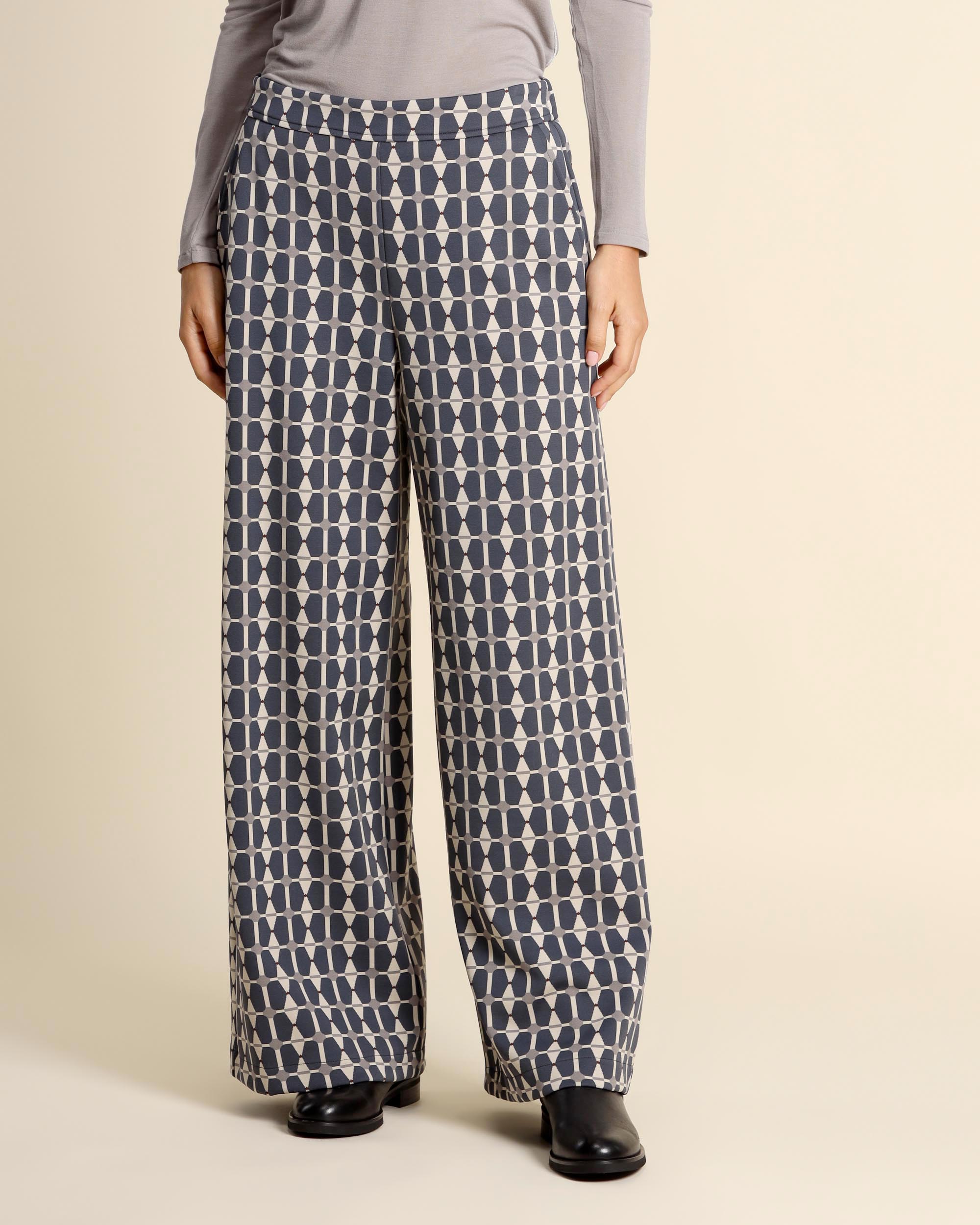 Pantaloni jacquard in jersey interlock grigio,rosso e beige, vita elastica sul dietro, tasche alla francese, linea ampia, la modella indossa una tg.42, la modella ha le seguenti misure: altezza 178, seno 86,vita 65, fianchi 93, collezione donna Maliparmi Autunno Inverno 2025/26