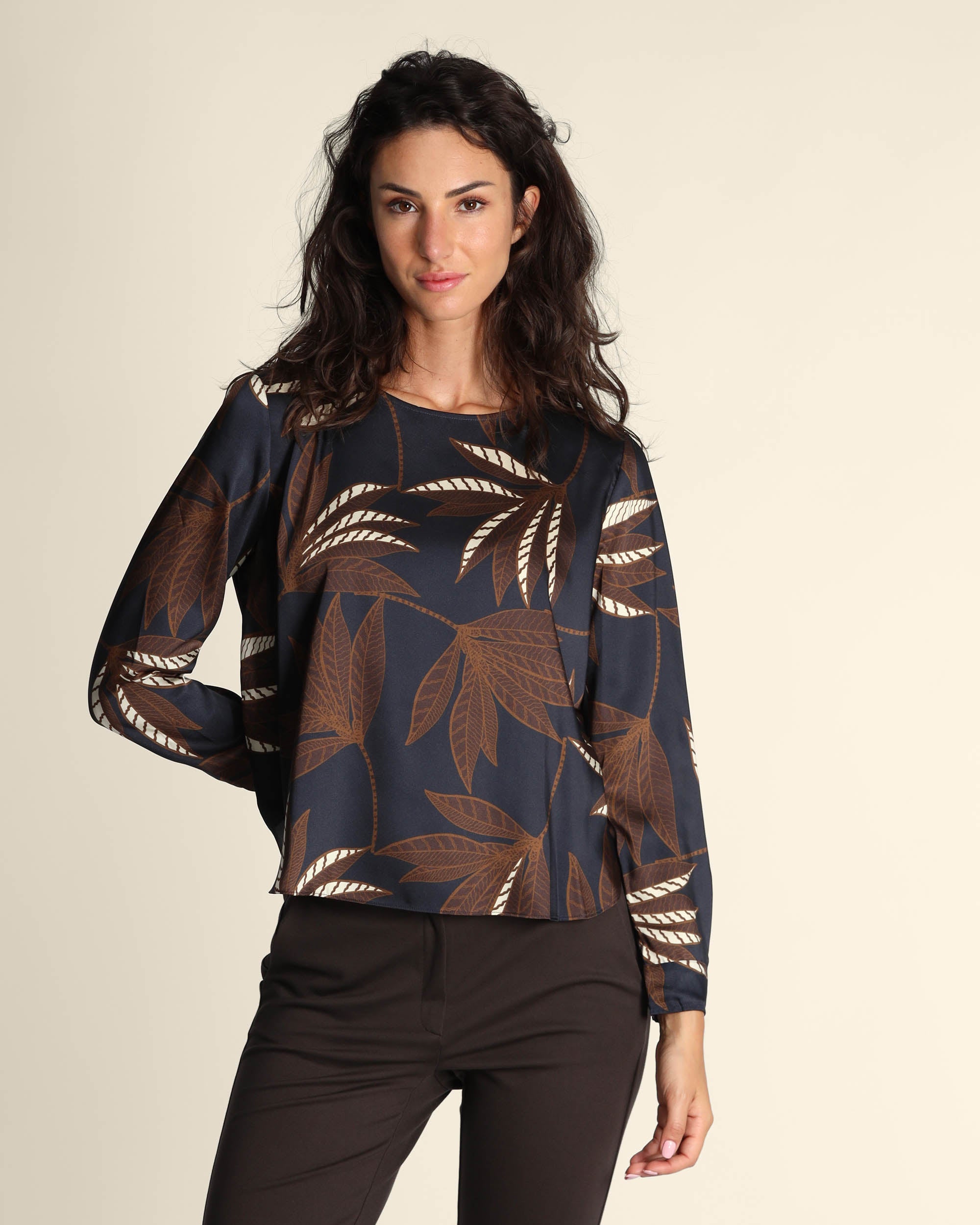 Blusa blu a fantasia in twill, scollo tondo, maniche lunghe con polsino, linea dritta, fondo stondato, la modella indossa una tg.42, la modella ha le seguenti misure: altezza 178, seno 86,vita 65, fianchi 93, collezione donna Emme by Marella Autunno Inverno 2025/26