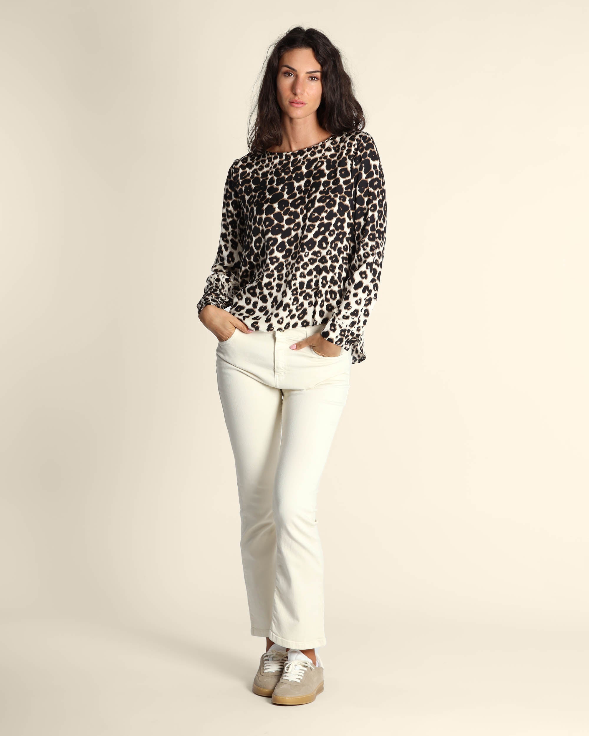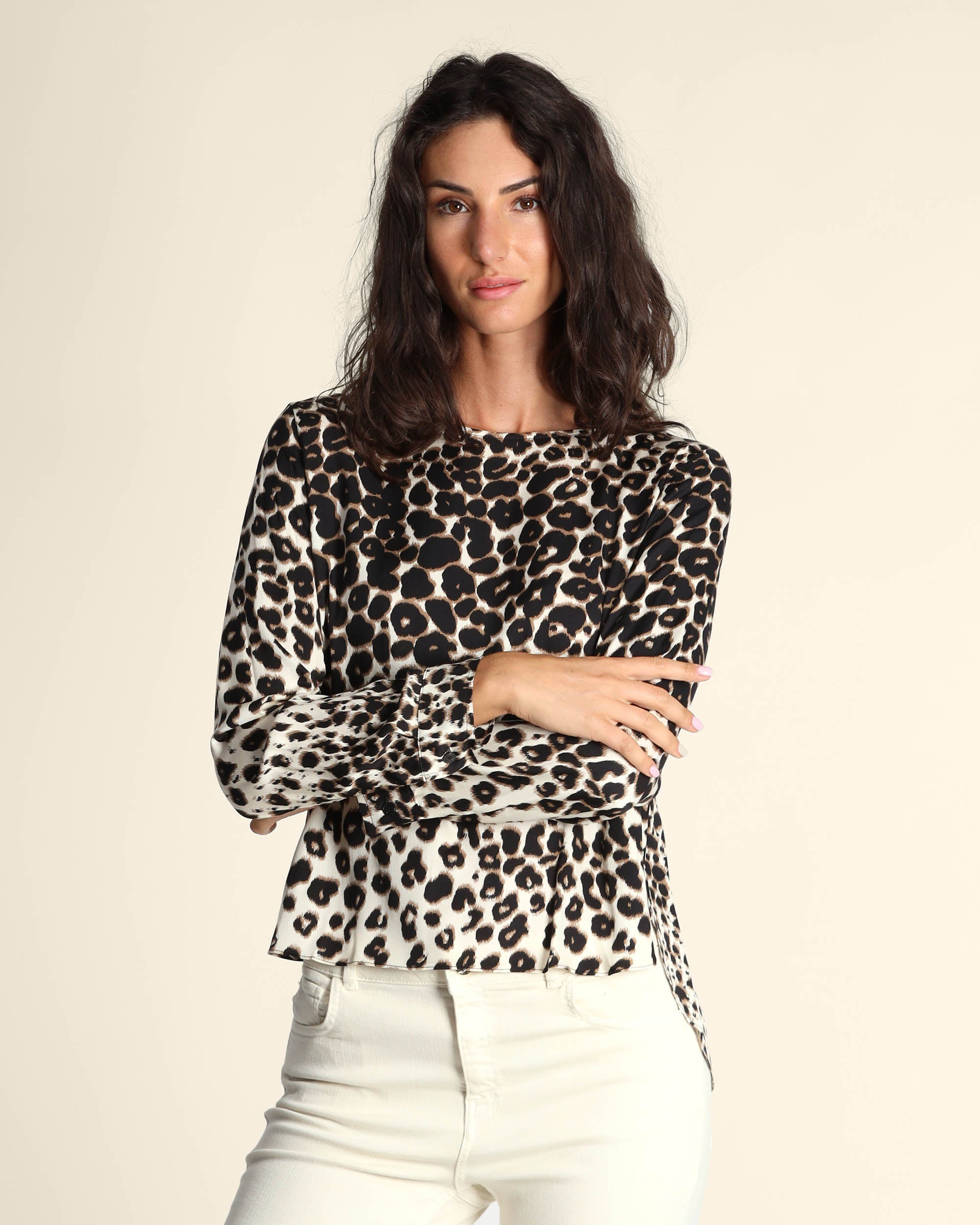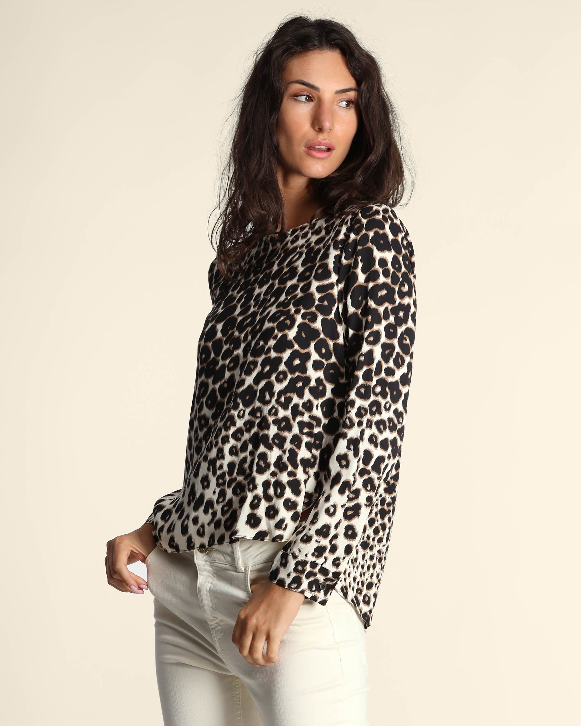 Blusa animalier in twill, scollo tondo, maniche lunghe con polsino, linea dritta, fondo stondato, la modella indossa una tg.42, la modella ha le seguenti misure: altezza 178, seno 86,vita 65, fianchi 93, collezione donna Emme by Marella Autunno Inverno 2025/26