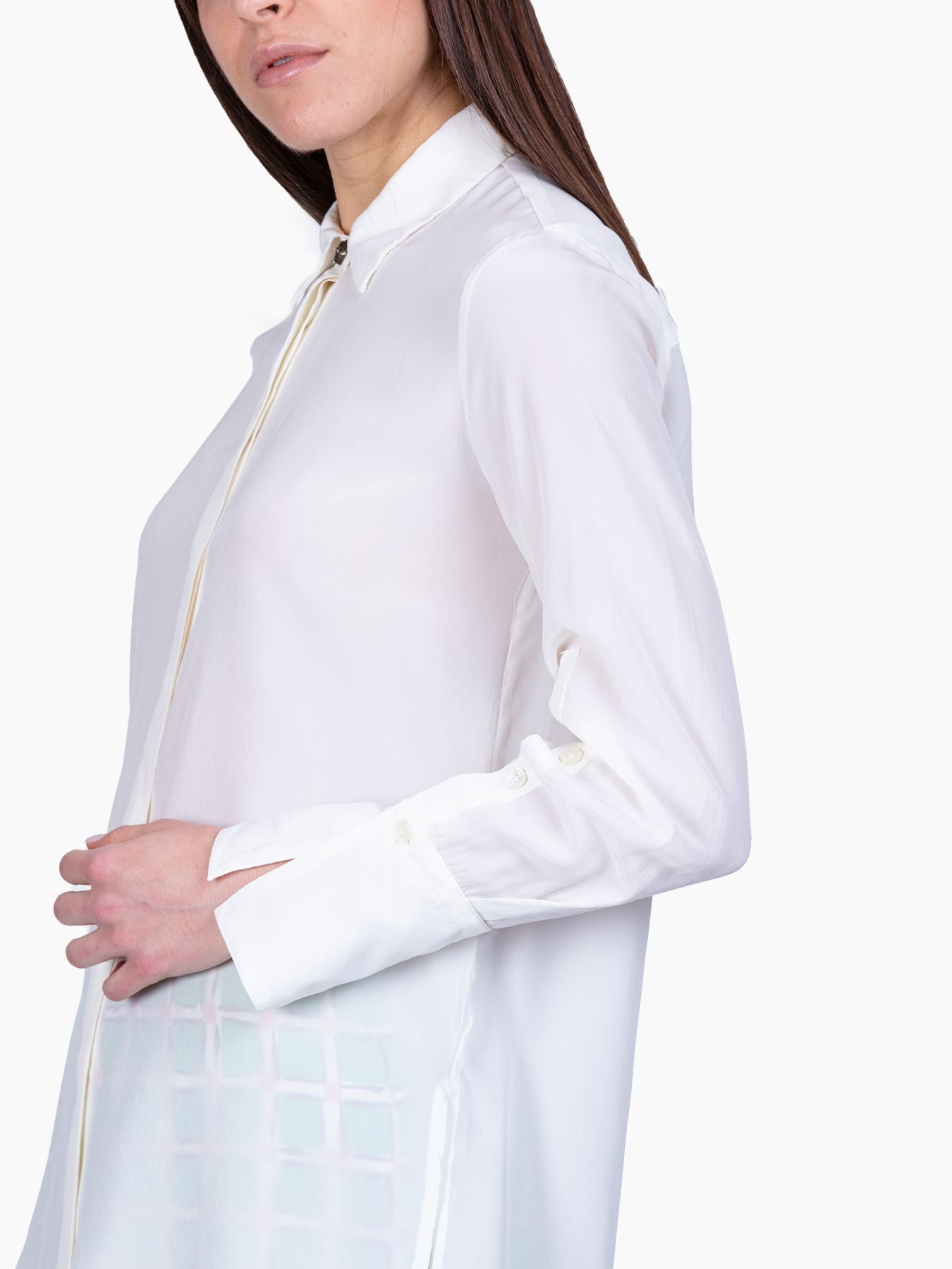 Camicia in seta bianca, collo a camicia, maniche lunghe con polsini alti, chiusura con bottoni nascosti, carrè sul dietro, spacchi laterali, linea morbida, Veronica indossa una tg.42, Veronica ha le seguenti misure: altezza 177, seno 87,vita 65, fianchi 93, collezione donna Maliparmi Primavera Estate 2020