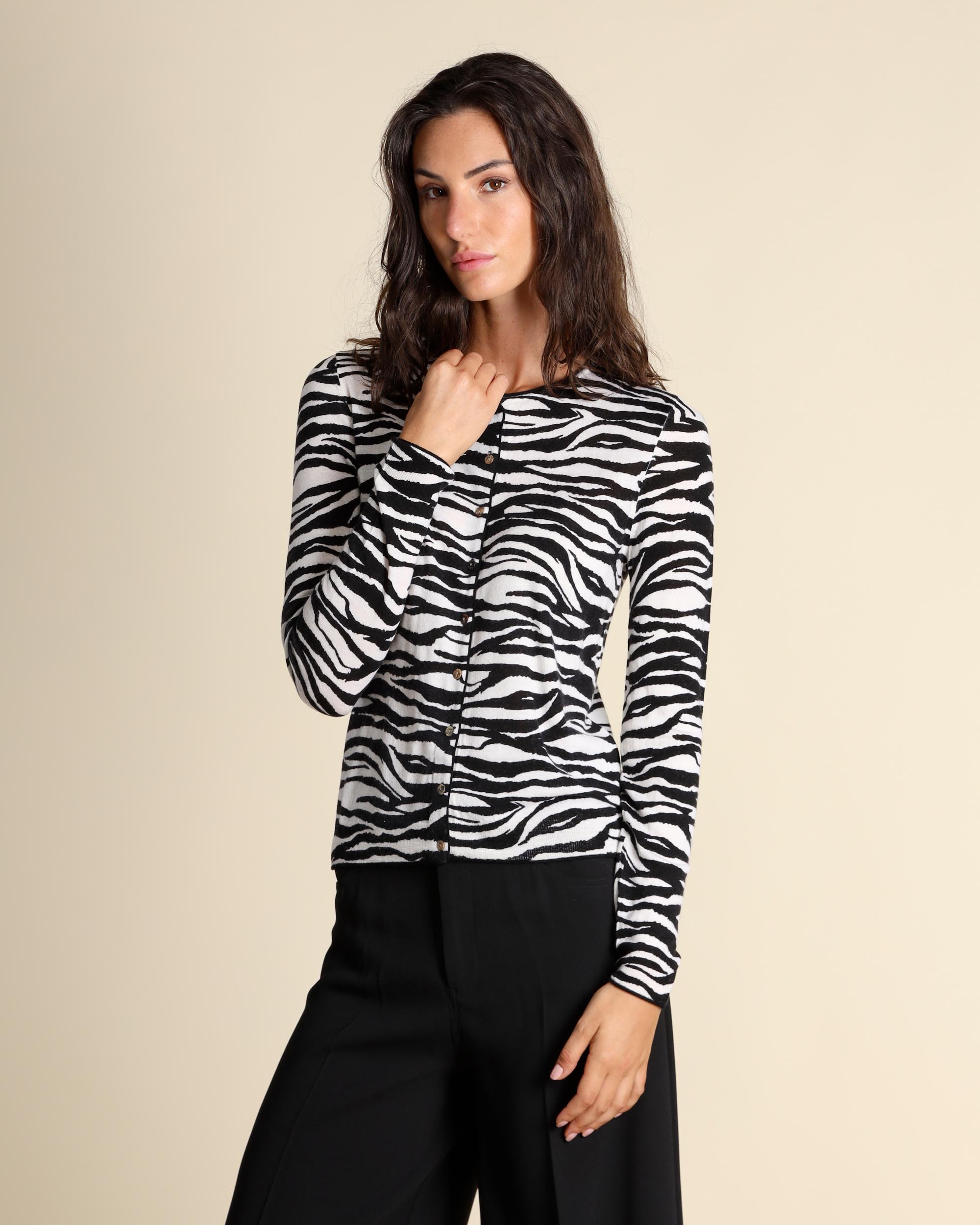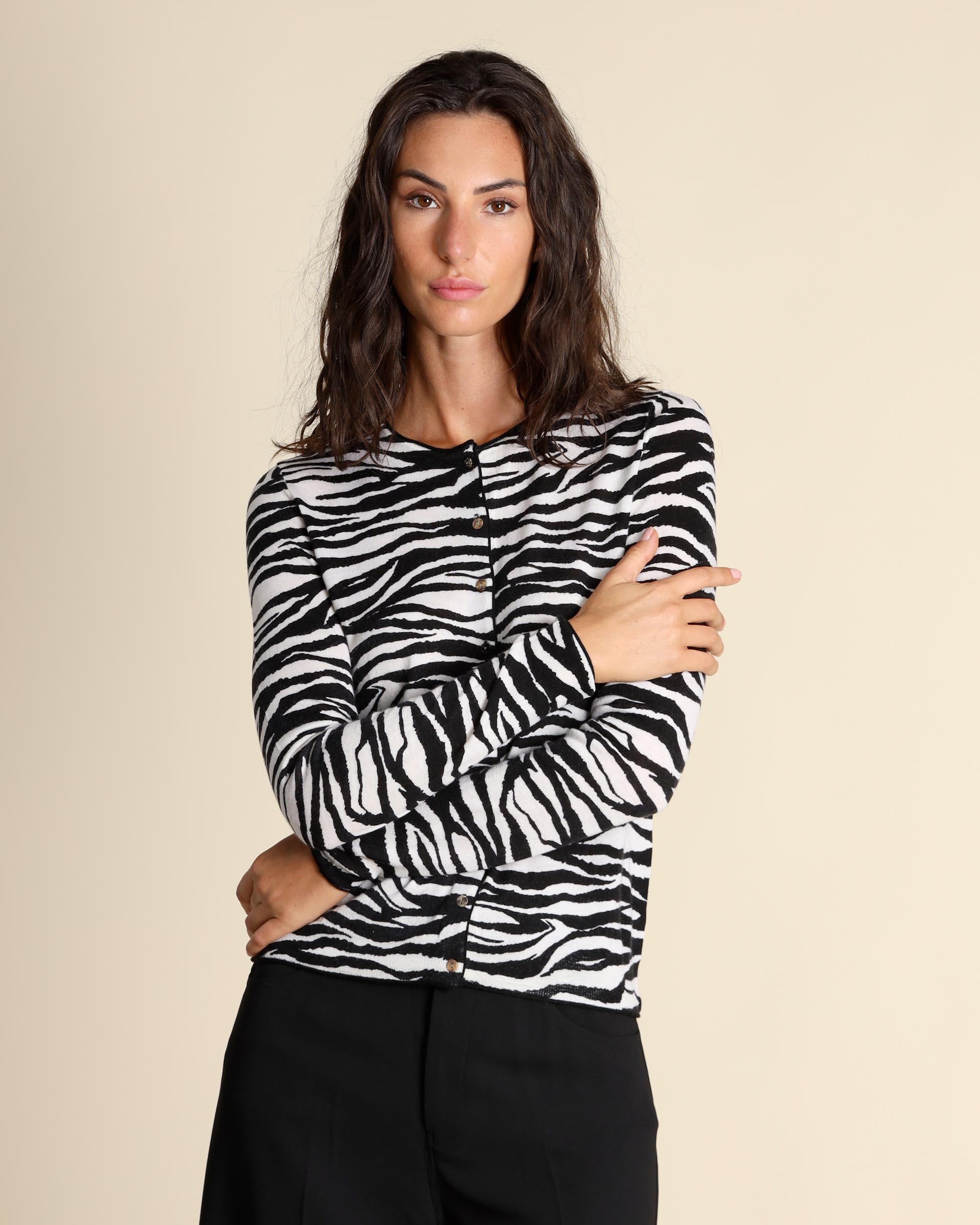 Cardigan jacquard bianco e nero in lana rasata, scollo tondo, maniche lunghe, chiusura con bottoni, linea dritta, la modella indossa una tg.S, la modella ha le seguenti misure: altezza 178, seno 86,vita 65, fianchi 93, collezione donna Maliparmi Autunno Inverno 2025/26