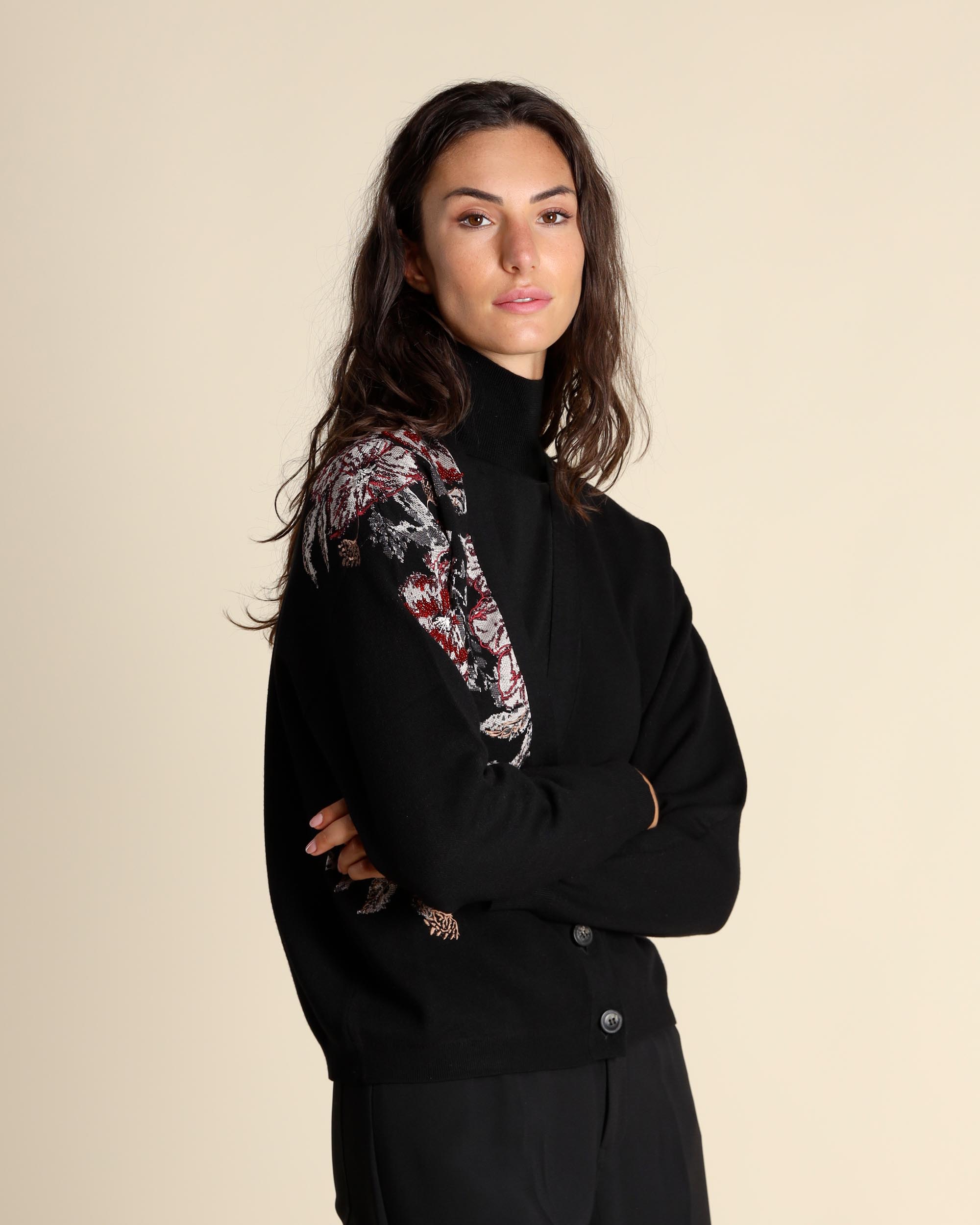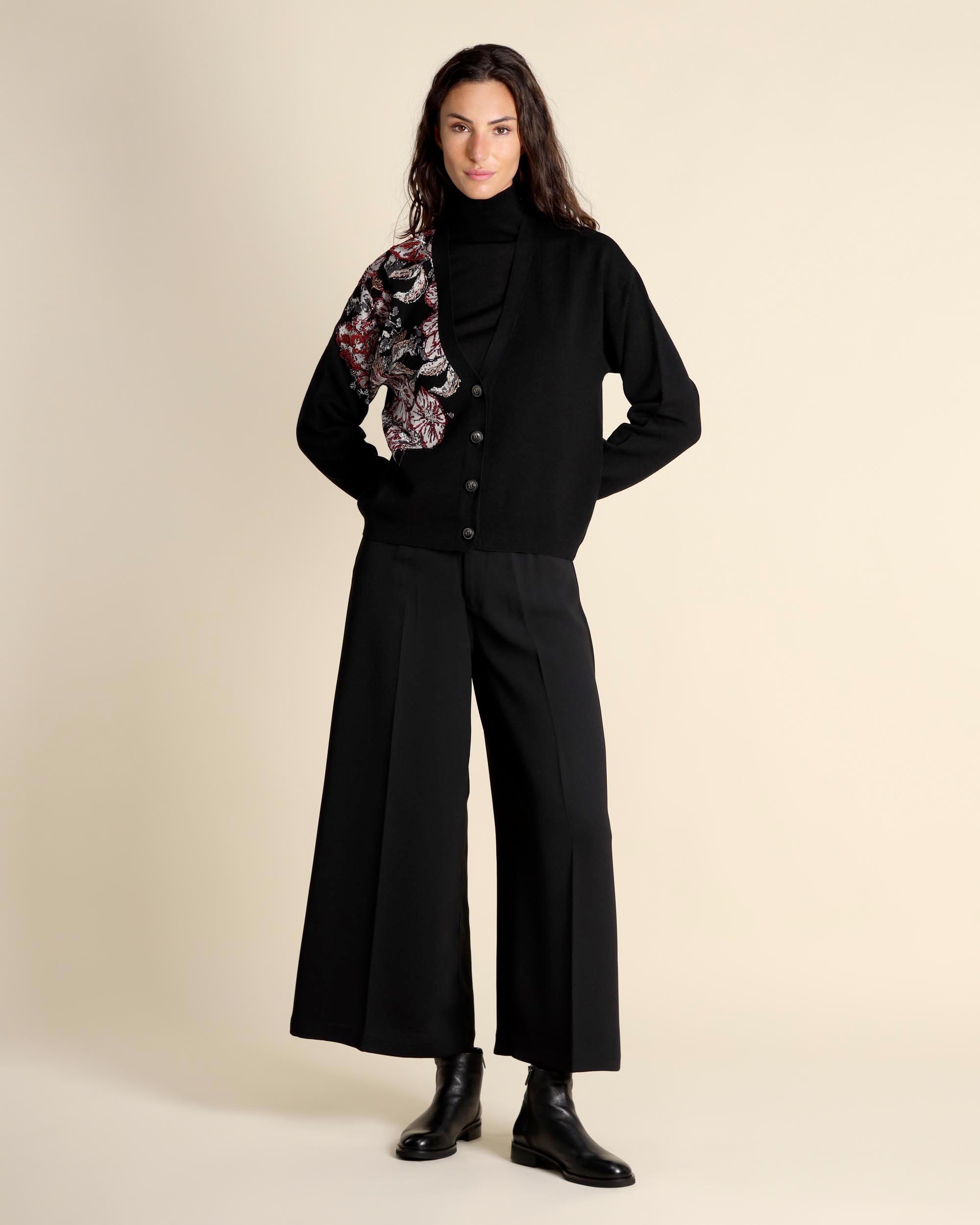 Cardigan nero jacquard in misto viscosa con ricami floreali, scollo a V, maniche lunghe, chiusura con bottoni, giro sceso, linea morbida, la modella indossa una tg.S, la modella ha le seguenti misure: altezza 178, seno 86,vita 65, fianchi 93, collezione donna Maliparmi Autunno Inverno 2025/26