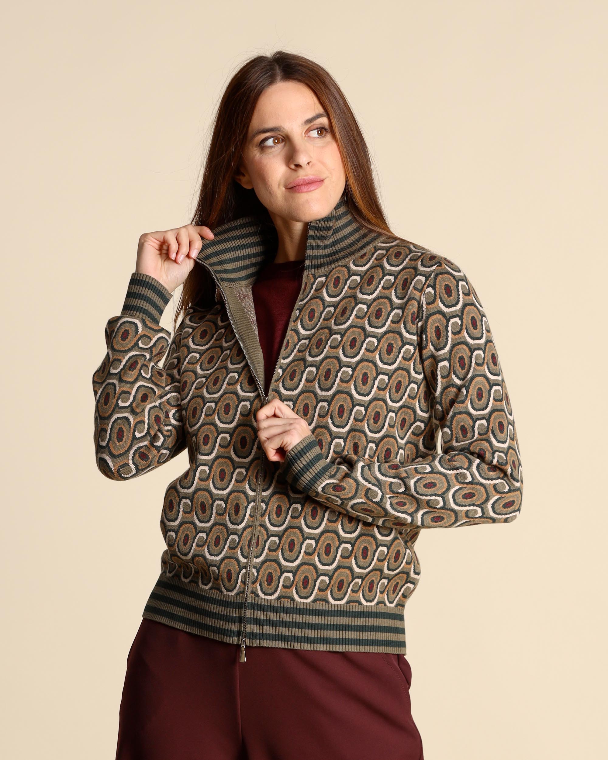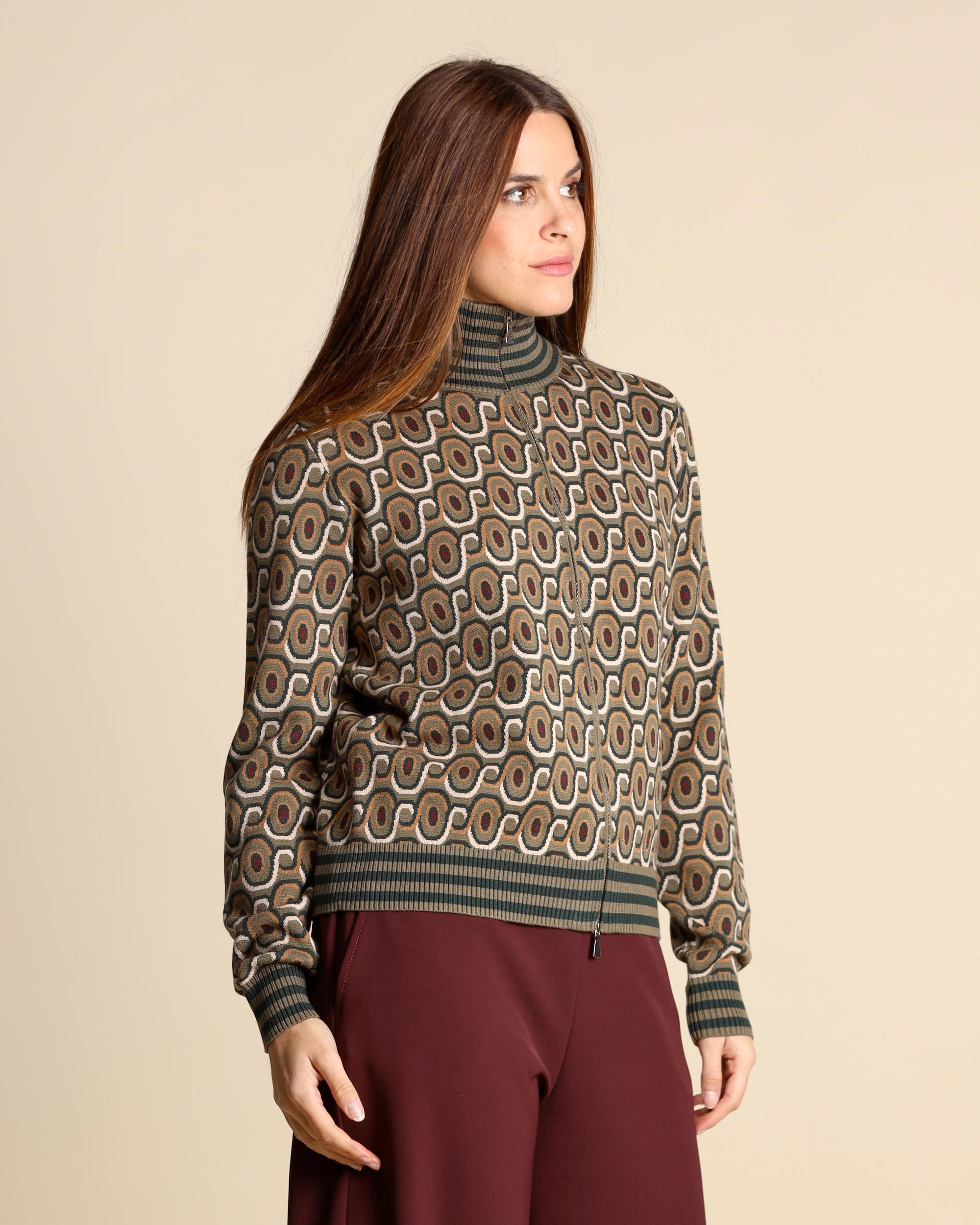 Cardigan jacquard in misto viscosa verde, crema e rosso, collo alto, maniche lunghe, chiusura con zip a doppio cursore, linea dritta, la modella indossa una tg.S, la modella ha le seguenti misure: altezza 178, seno 86,vita 65, fianchi 93, collezione donna Maliparmi Autunno Inverno 2025/26