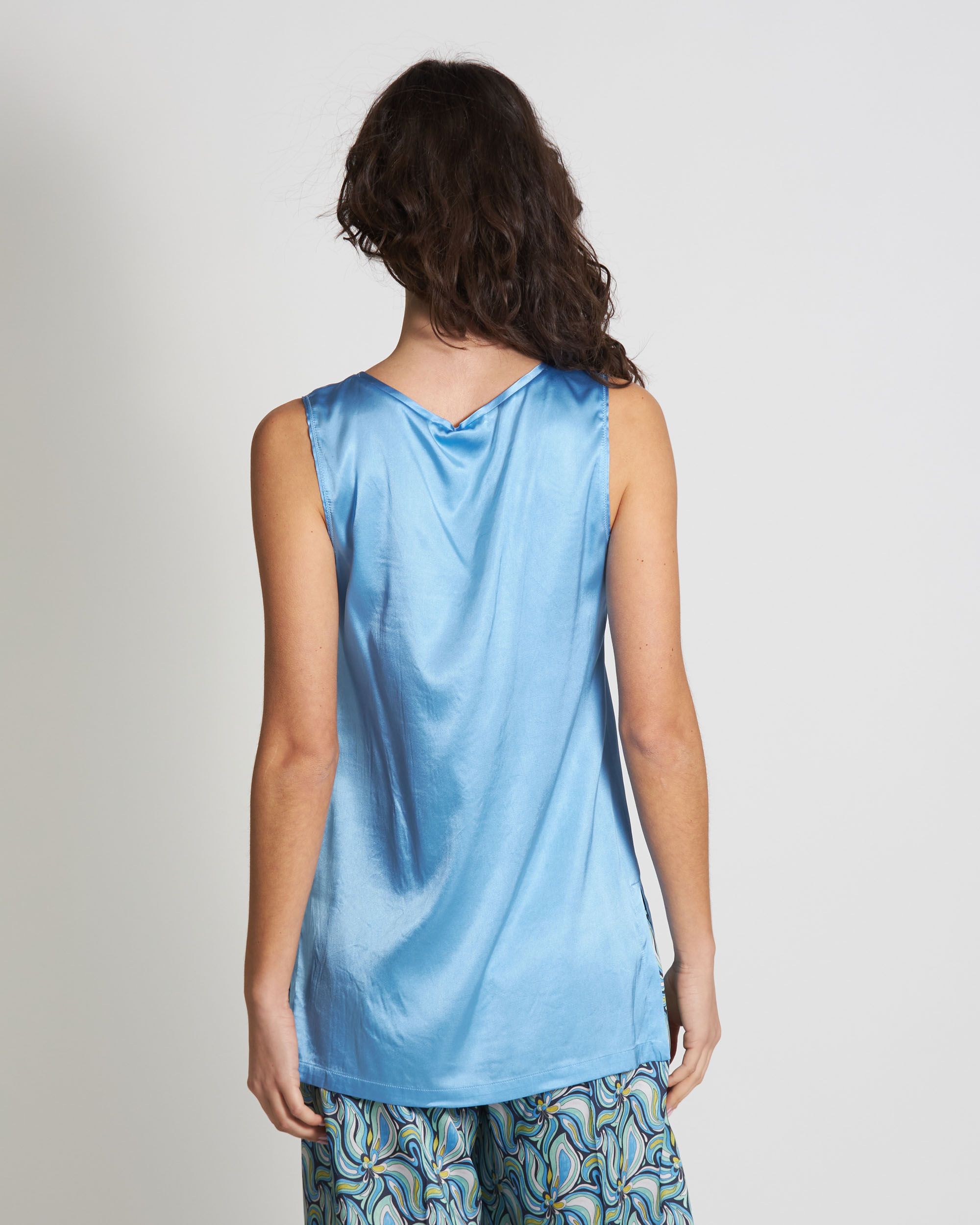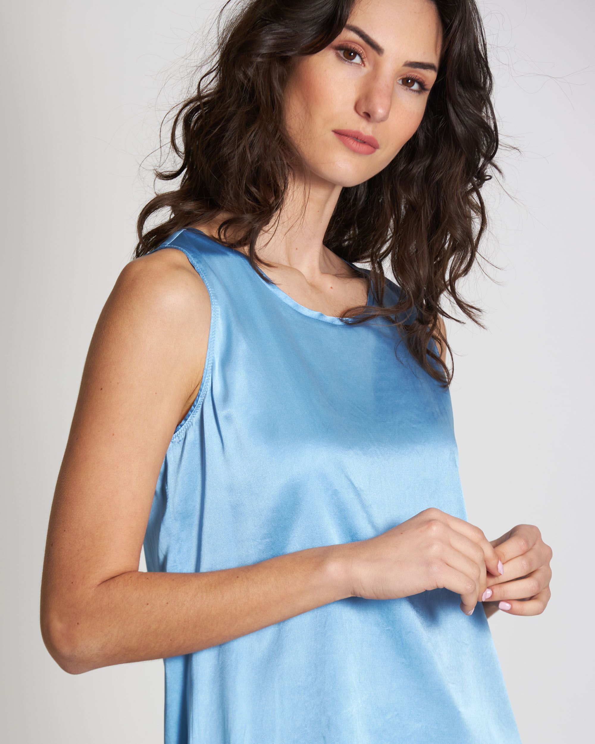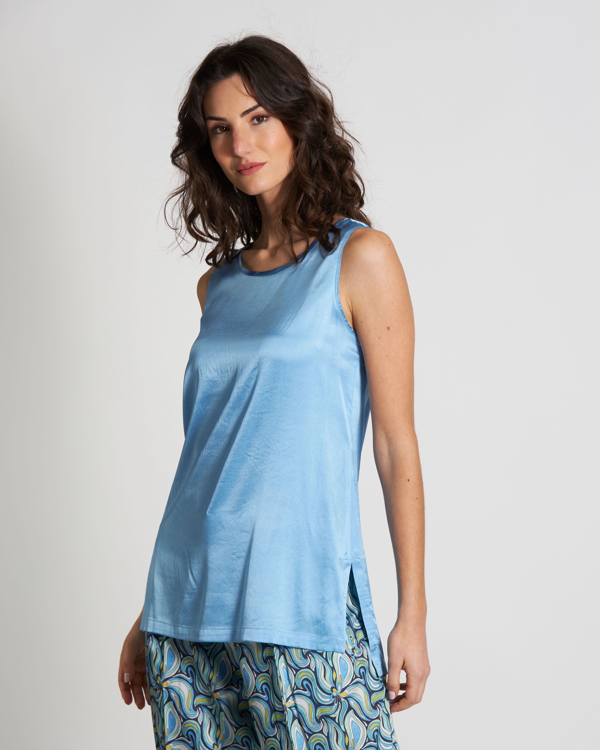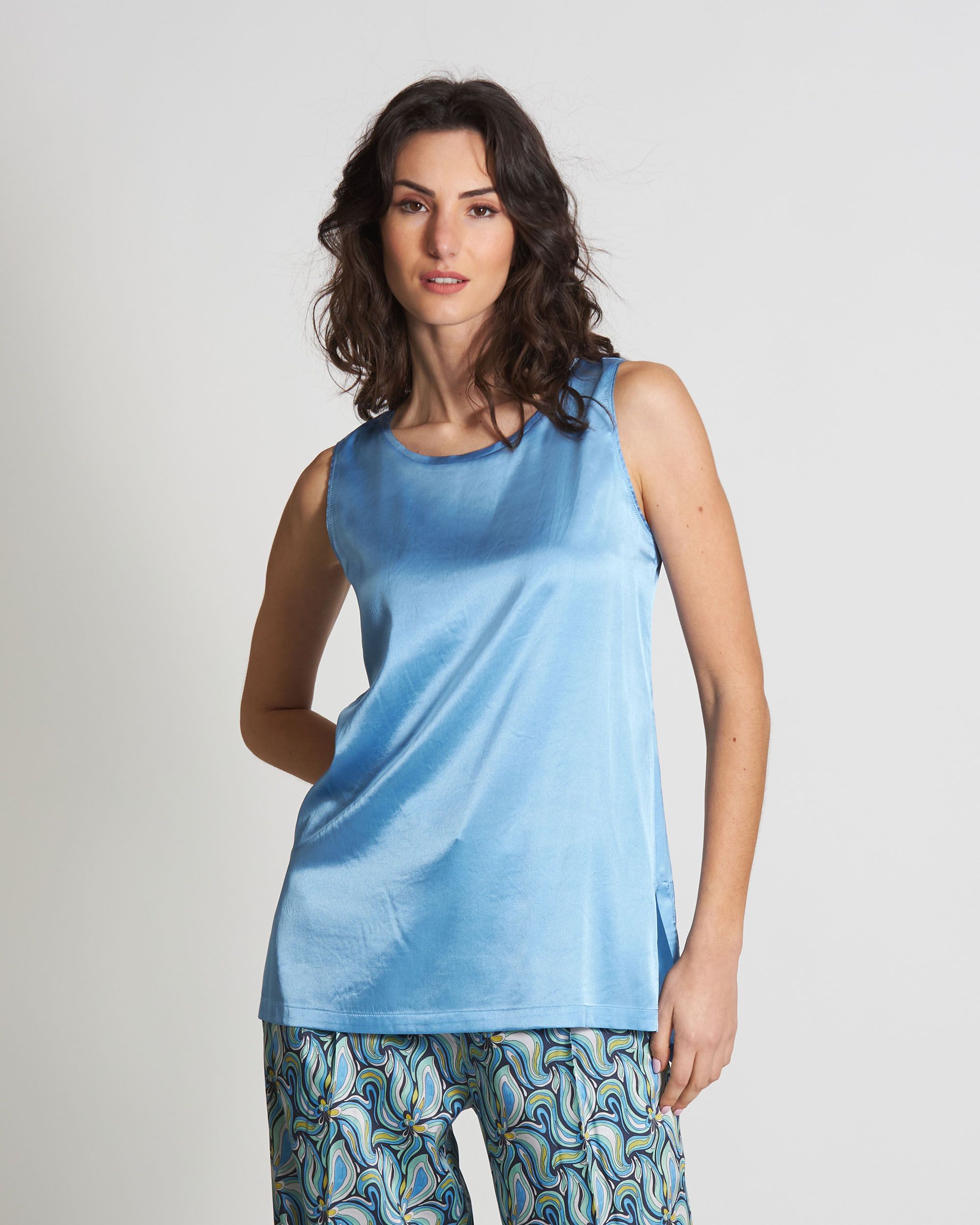 Top in raso di seta stretch azzurro, scollo tondo, senza maniche, linea morbida, spacchi laterali, Elisa indossa una tg.42, Elisa ha le seguenti misure: altezza 179, seno 84, vita 63, fianchi 94, collezione donna Maliparmi Primavera Estate 2024