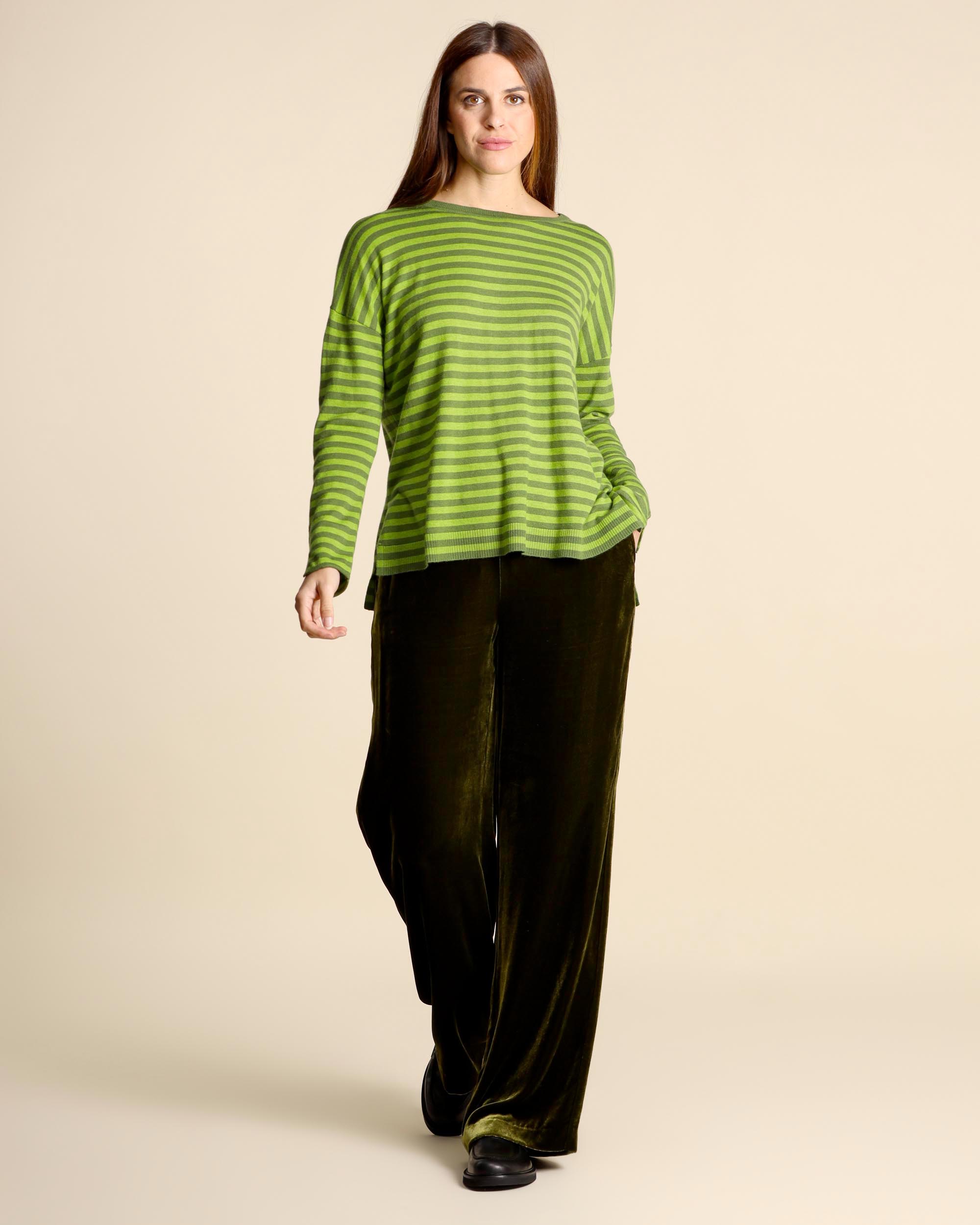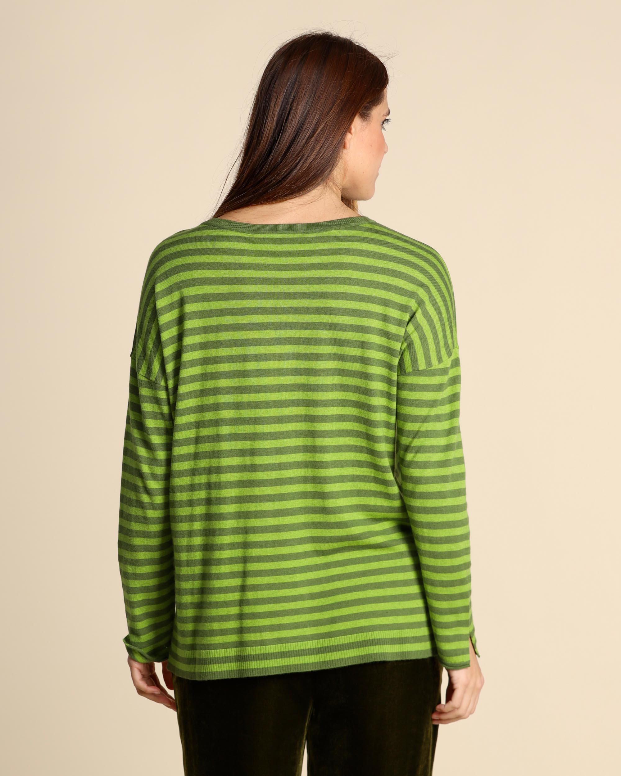 Maglia a righe verdi in misto lana, viscosa e cashmere, scollo a barchetta, maniche lunghe, giro sceso, linea morbida, spacchi laterali, fondo più lungo dietro, la modella indossa una tg.S, la modella ha le seguenti misure: altezza 179, seno 84, vita 63, fianchi 94, collezione donna Maliparmi Autunno Inverno 2025/26