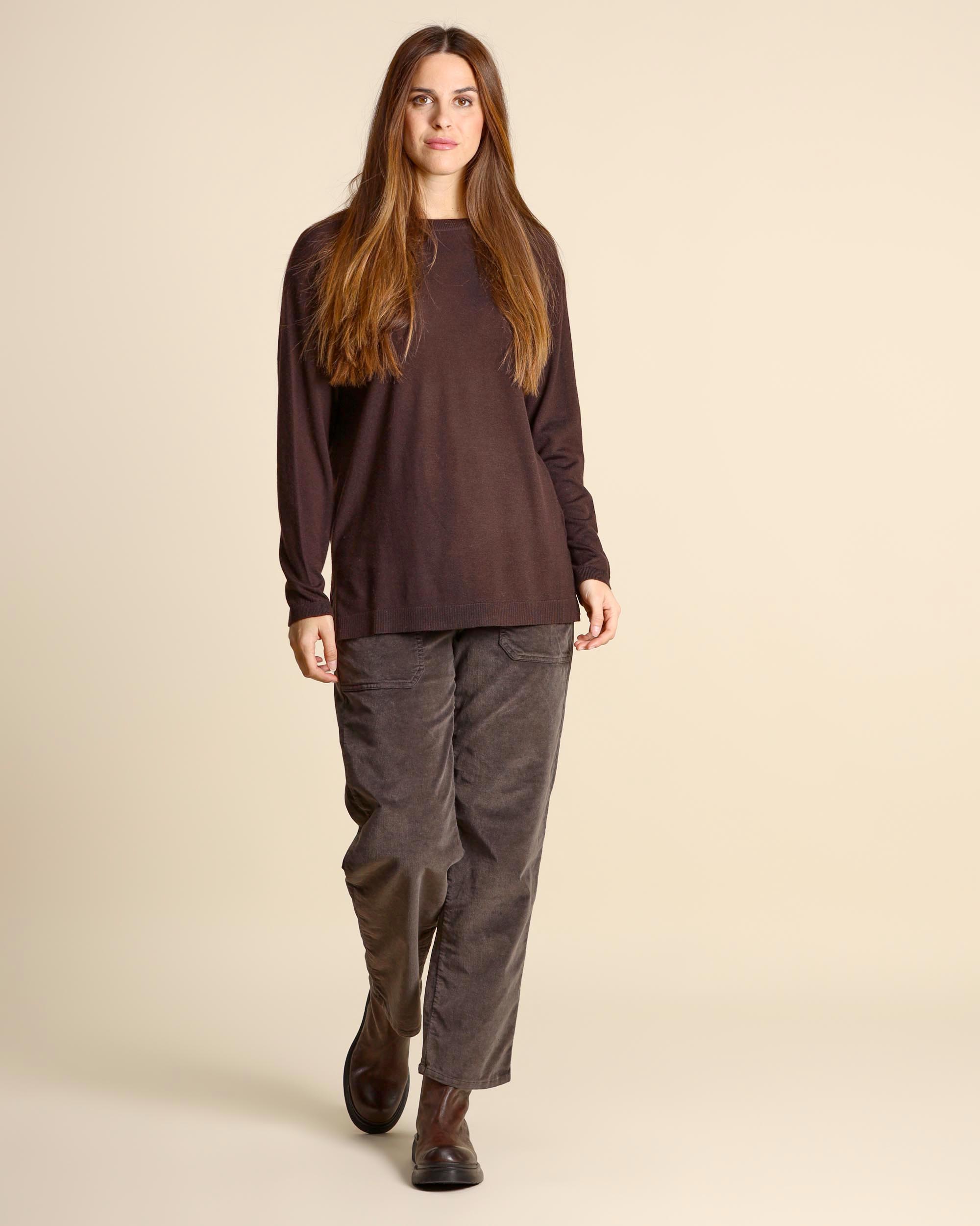 Maglia testa moro in lana rasata, scollo a barchetta, maniche lunghe raglan, linea morbida, spacchi laterali, la modella indossa una tg.S, la modella ha le seguenti misure: altezza 179, seno 84, vita 63, fianchi 94, collezione donna Maliparmi Autunno Inverno 2025/26