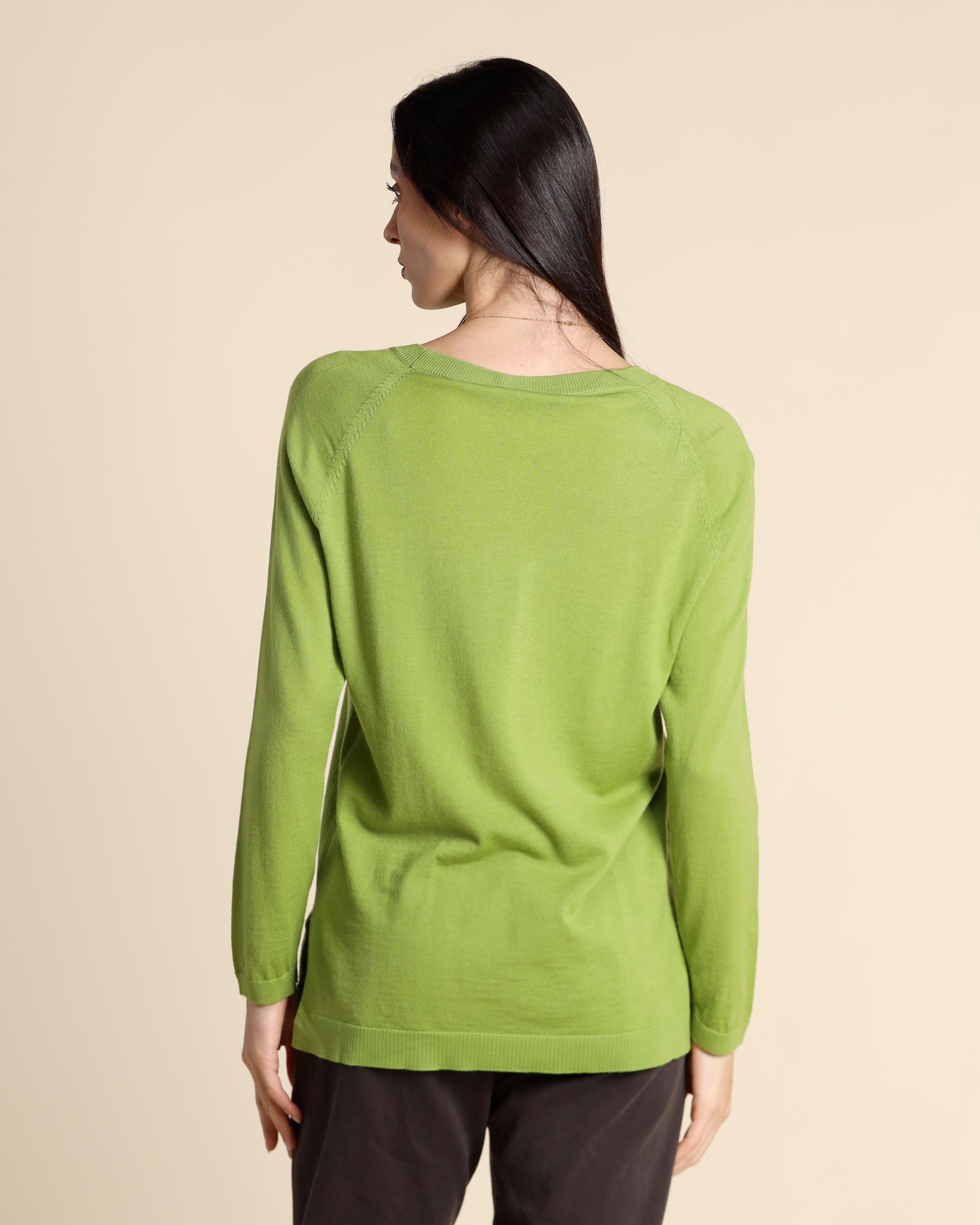 Maglia color pistacchio in lana rasata, scollo a barchetta, maniche lunghe raglan, linea morbida, spacchi laterali, la modella indossa una tg.S, la modella ha le seguenti misure: altezza 179, seno 84, vita 63, fianchi 94, collezione donna Maliparmi Autunno Inverno 2025/26
