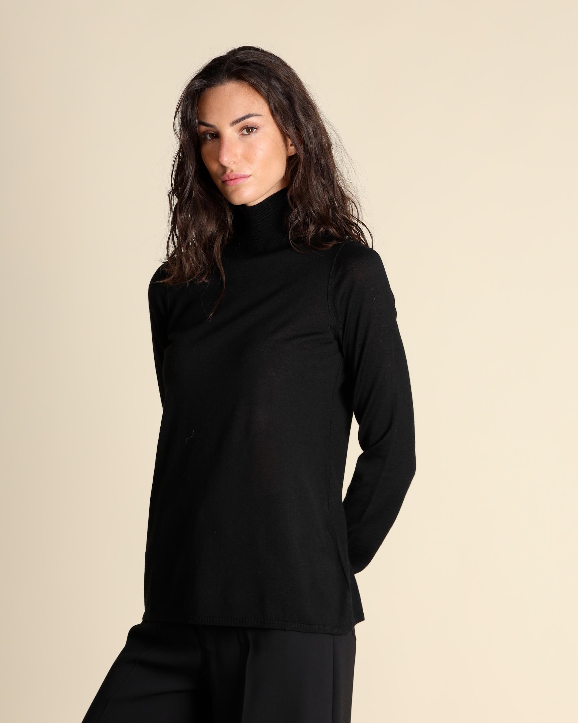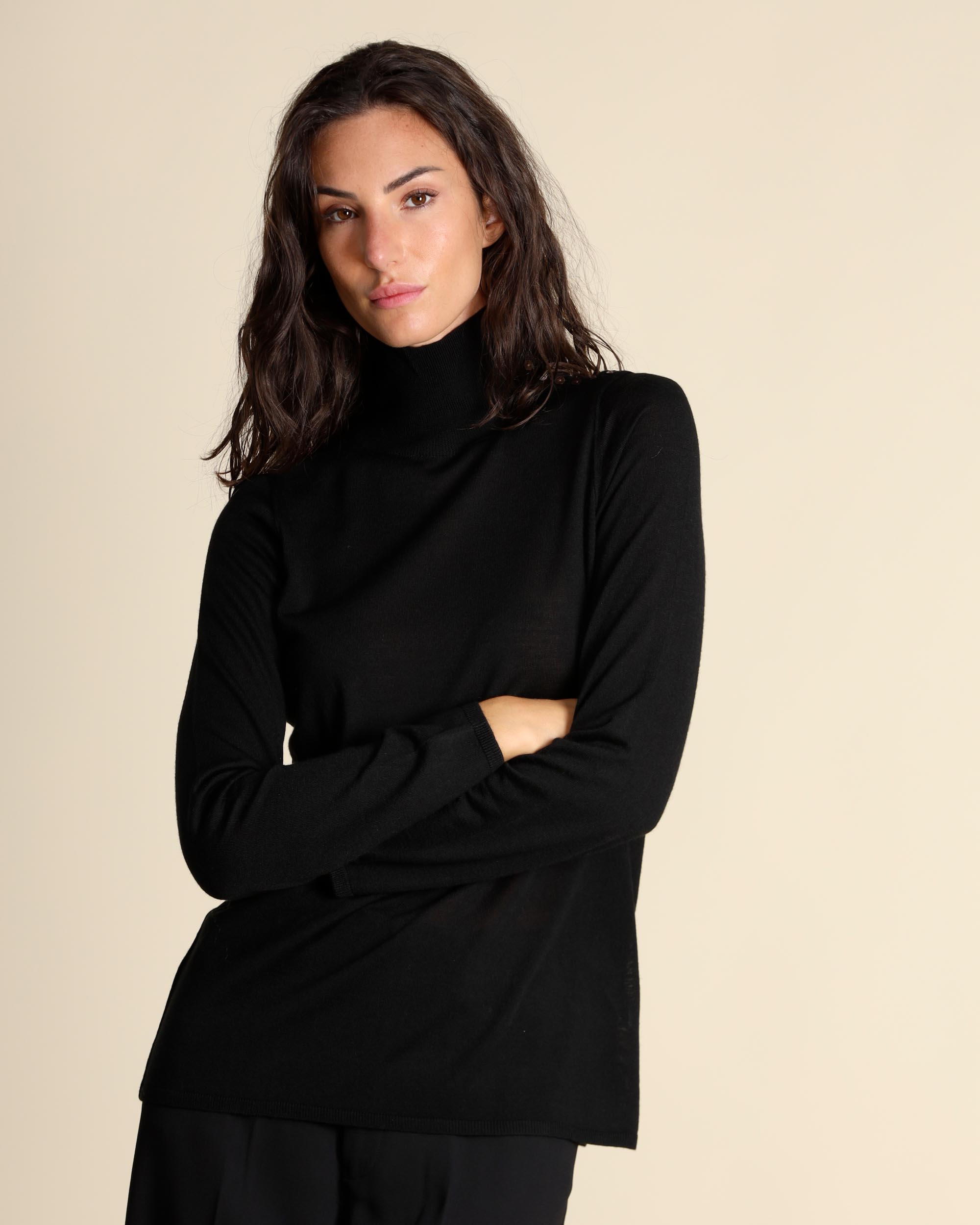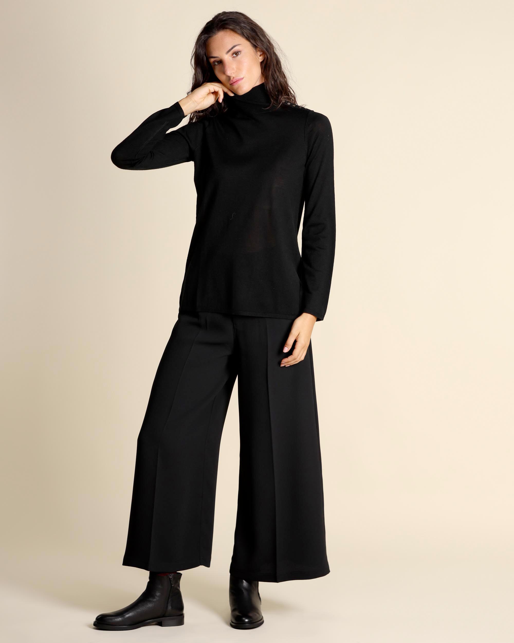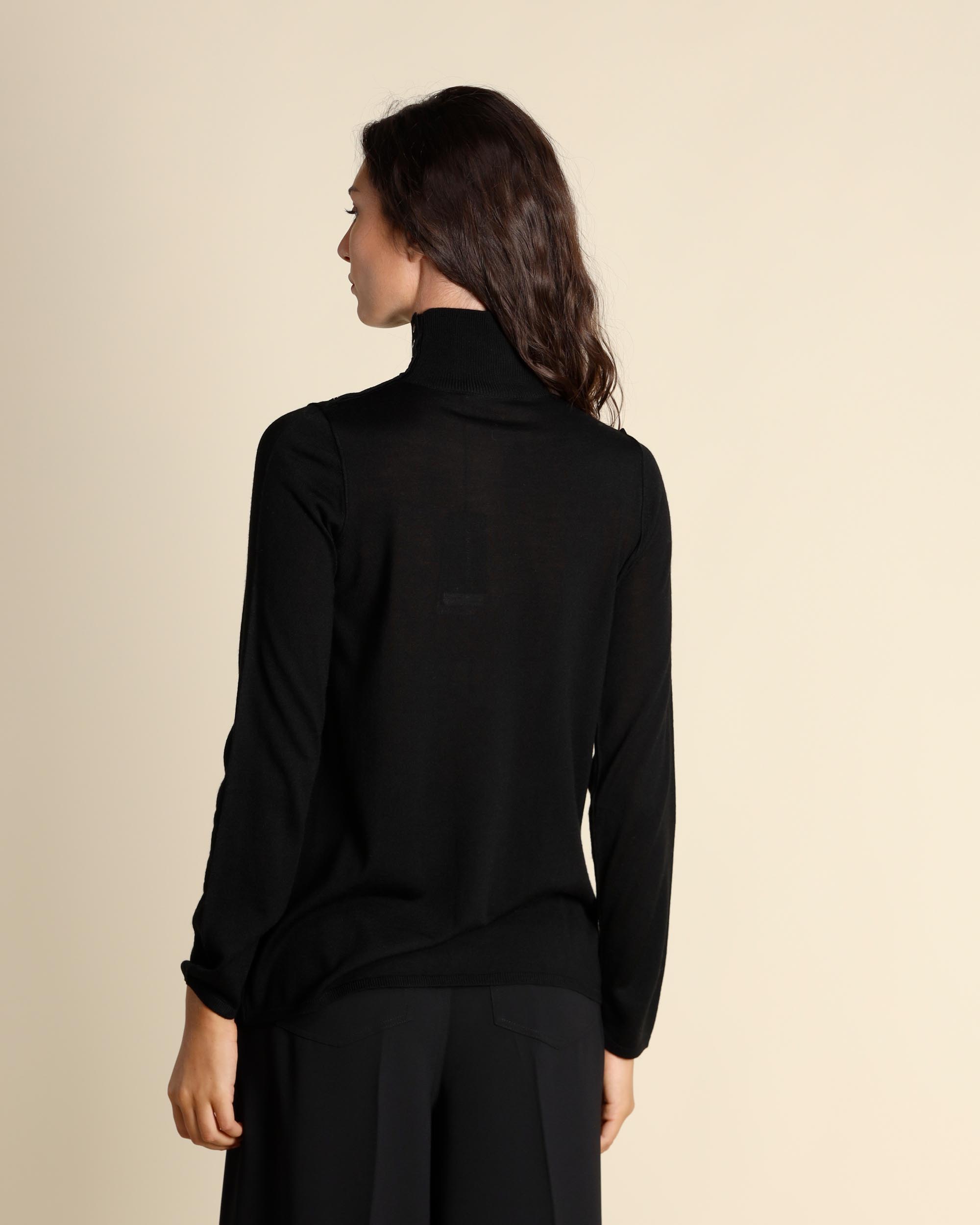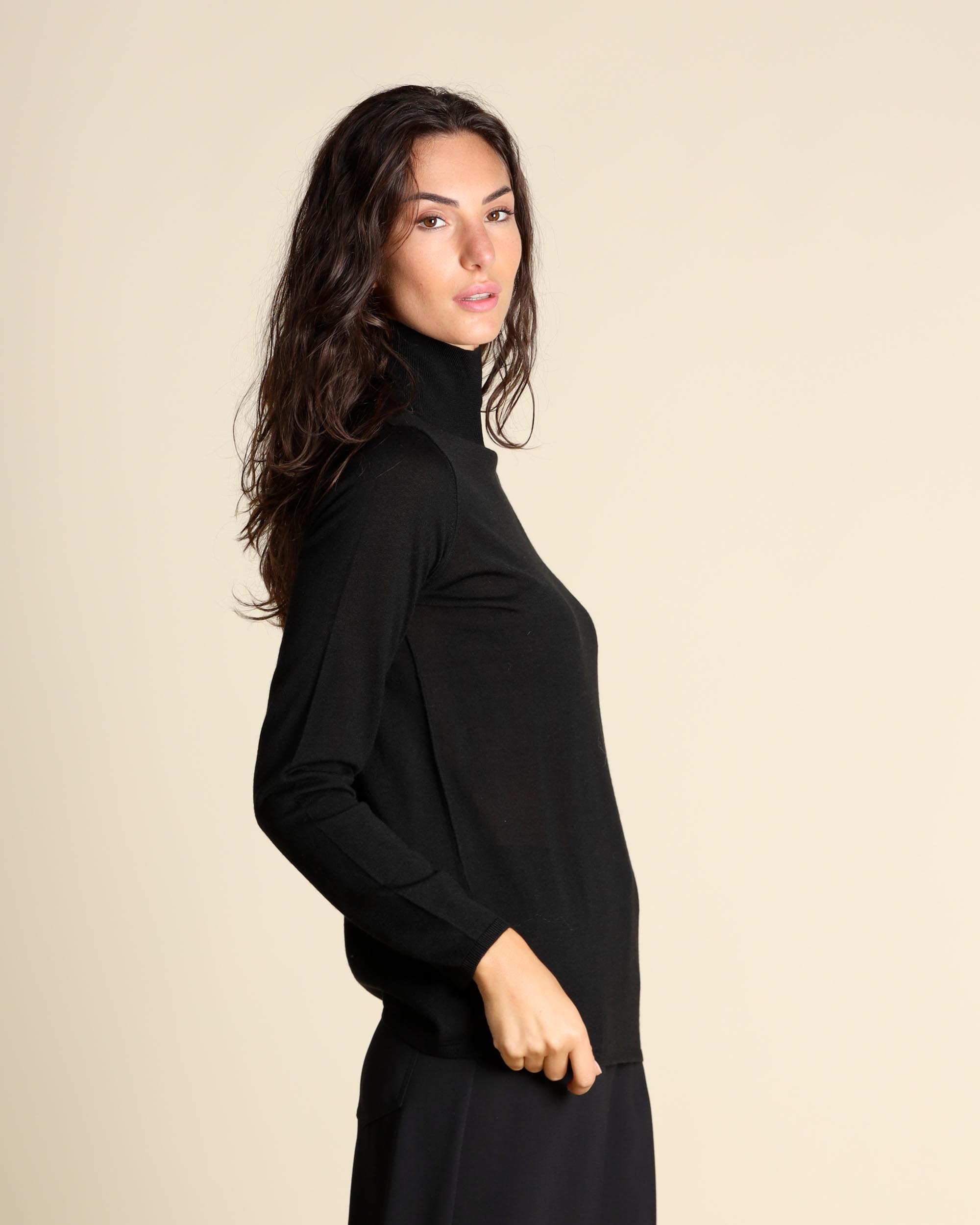 Maglia nera rasata in misto lana, collo alto, dettaglio di bottoni sulla spalla, maniche lunghe, linea dritta, la modella indossa una tg.S, la modella ha le seguenti misure: altezza 178, seno 86,vita 65, fianchi 93, collezione donna Maliparmi Autunno Inverno 2025/26