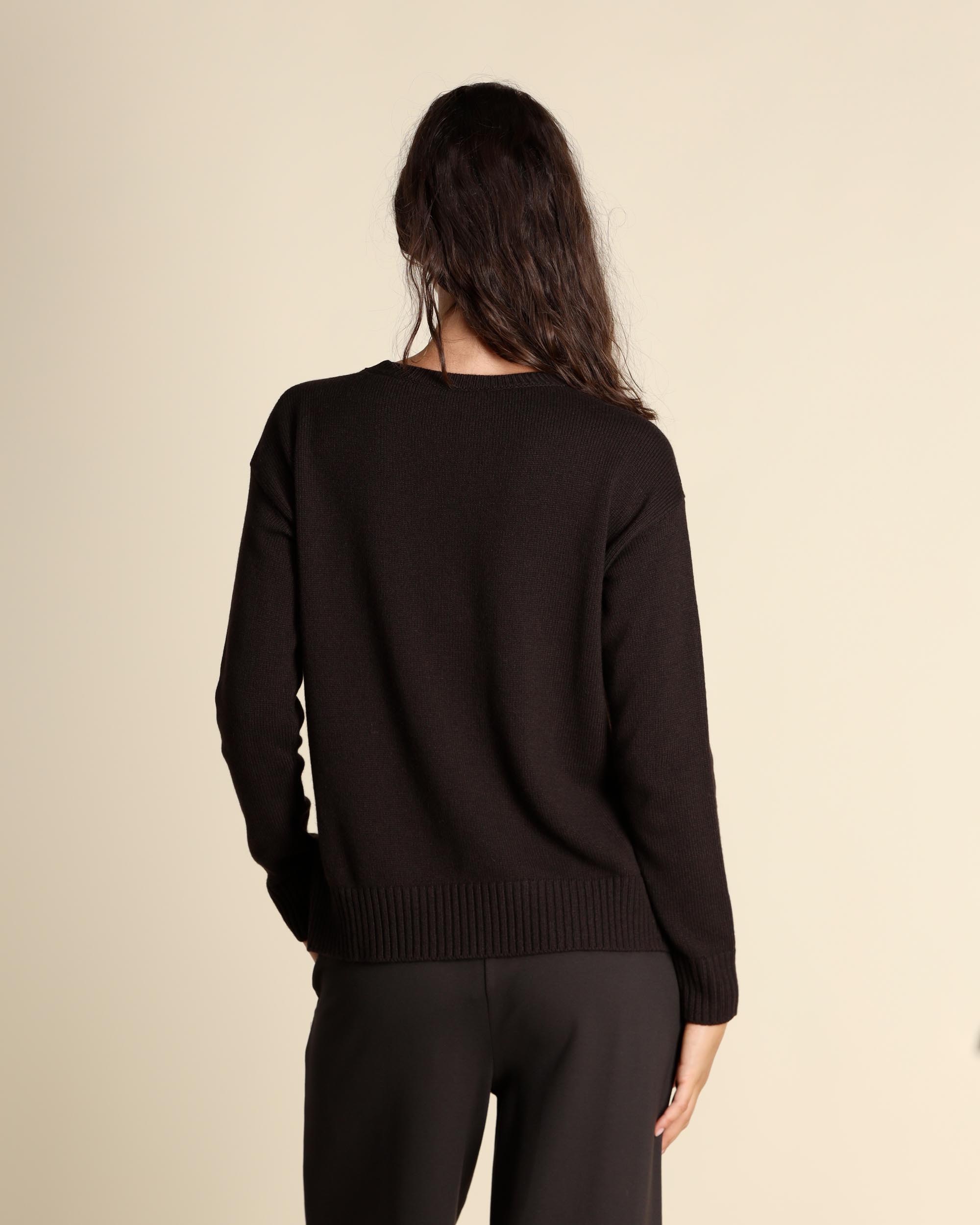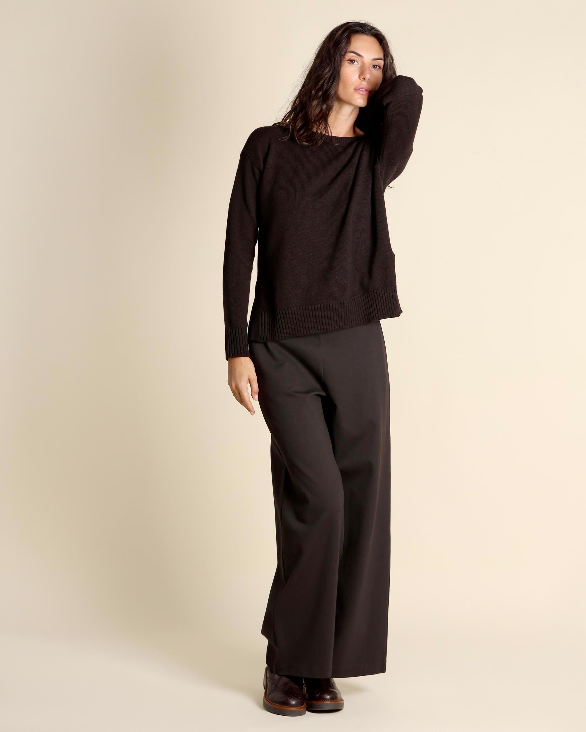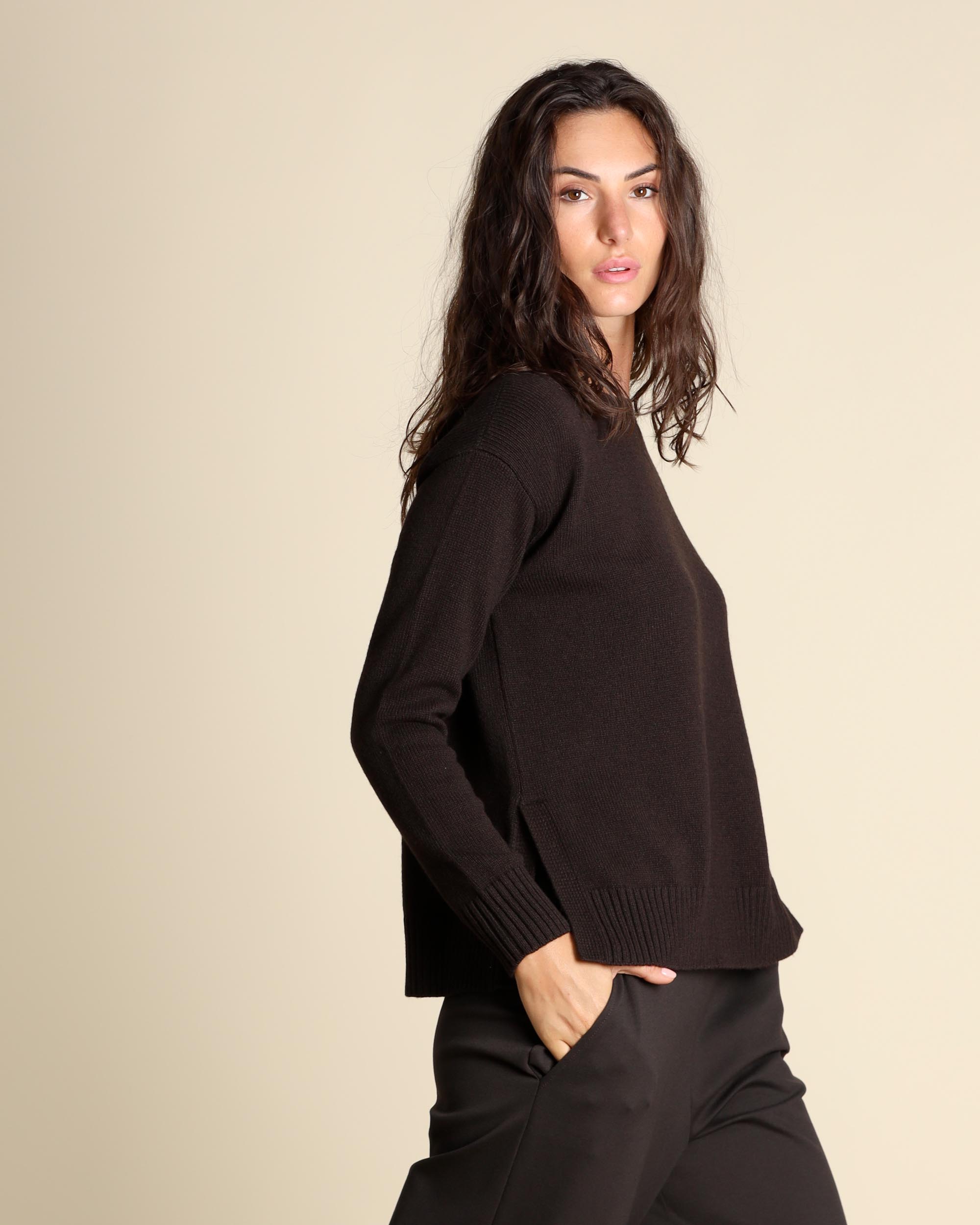Maglia testa moro in misto lana e cashmere, scollo tondo, maniche lunghe, giro sceso, linea morbida, spacchi laterali, la modella indossa una tg.S, la modella ha le seguenti misure: altezza 178, seno 86,vita 65, fianchi 93, collezione donna Maliparmi Autunno Inverno 2025/26