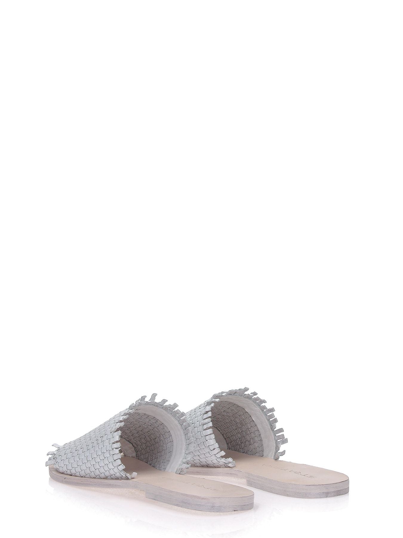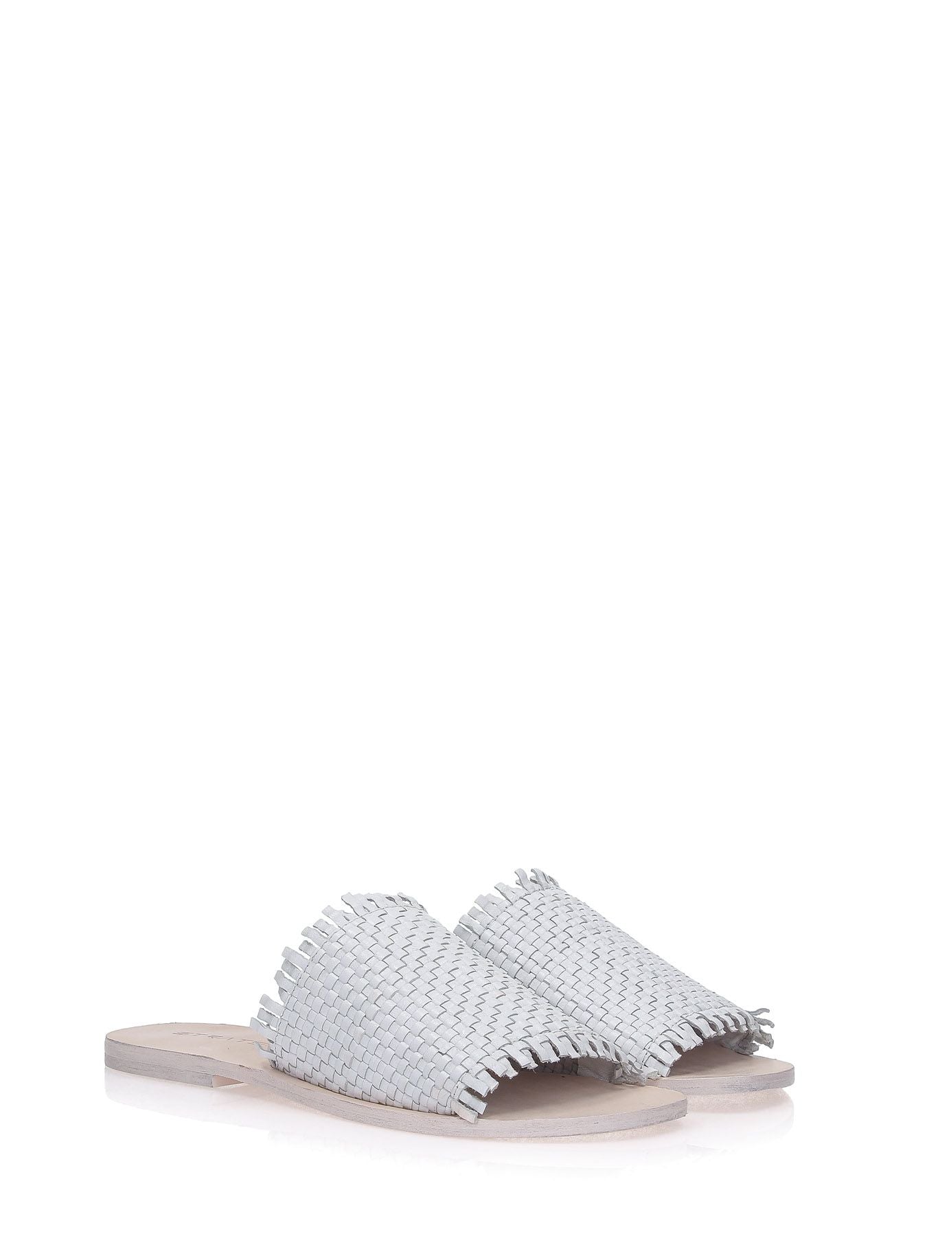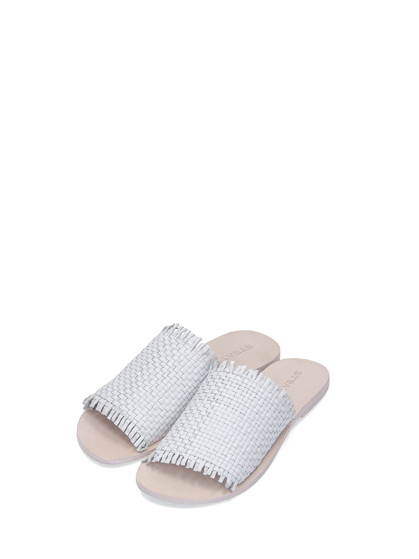 Sandali bassi bianchi con fascia in pelle intrecciata, tacco 10mm, suola in cuoio bianca, profili sfrangiati, sottopiede in pelle, punta tonda, collezione donna Strategia Primavera Estate 2019