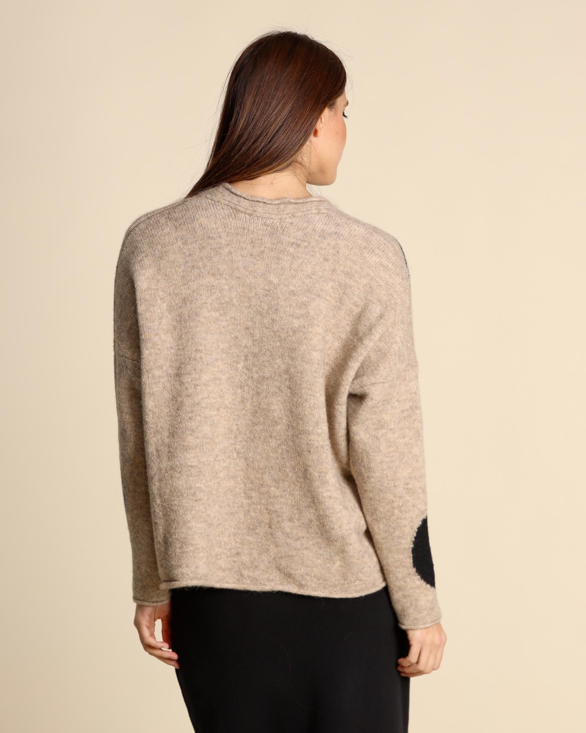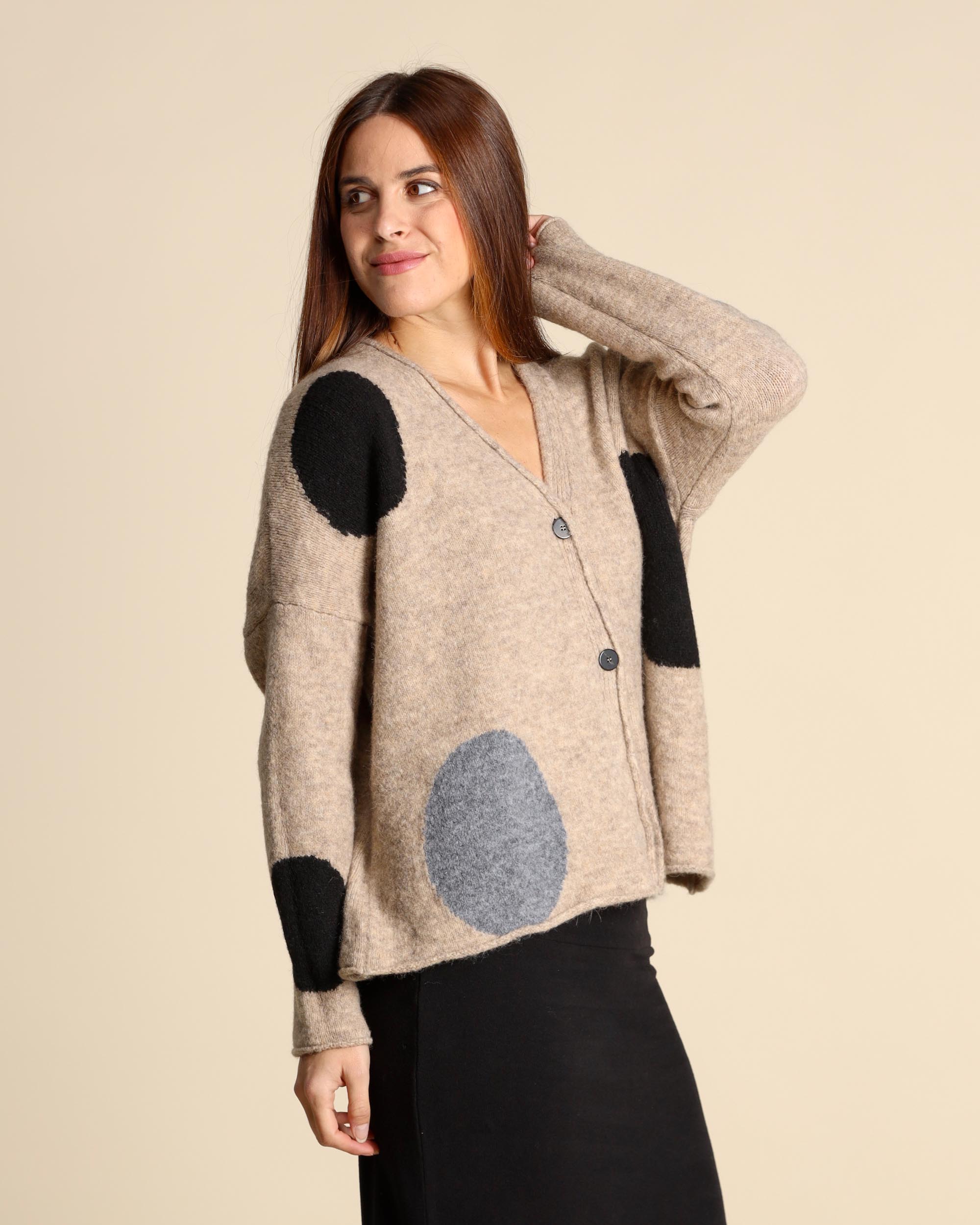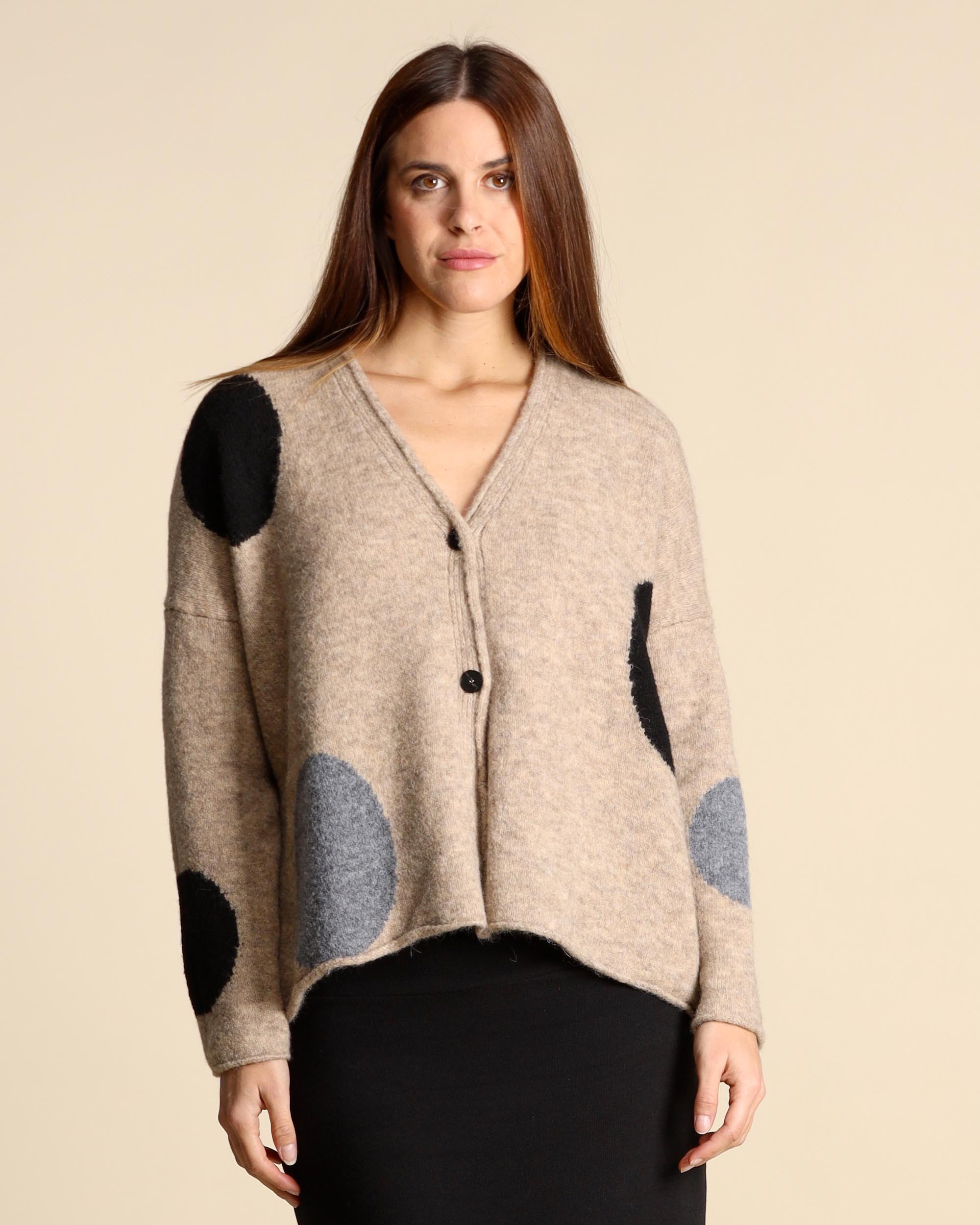 Cardigan beige ad intarsio in misto lana e alpaca stretch, scollo a V, maniche lunghe, giro sceso, linea ampia, chiusura con bottoni, made in Italy, la modella indossa una tg.S, la modella ha le seguenti misure: altezza 177, seno 87,vita 65, fianchi 93, collezione donna Neirami Autunno Inverno 2026/26