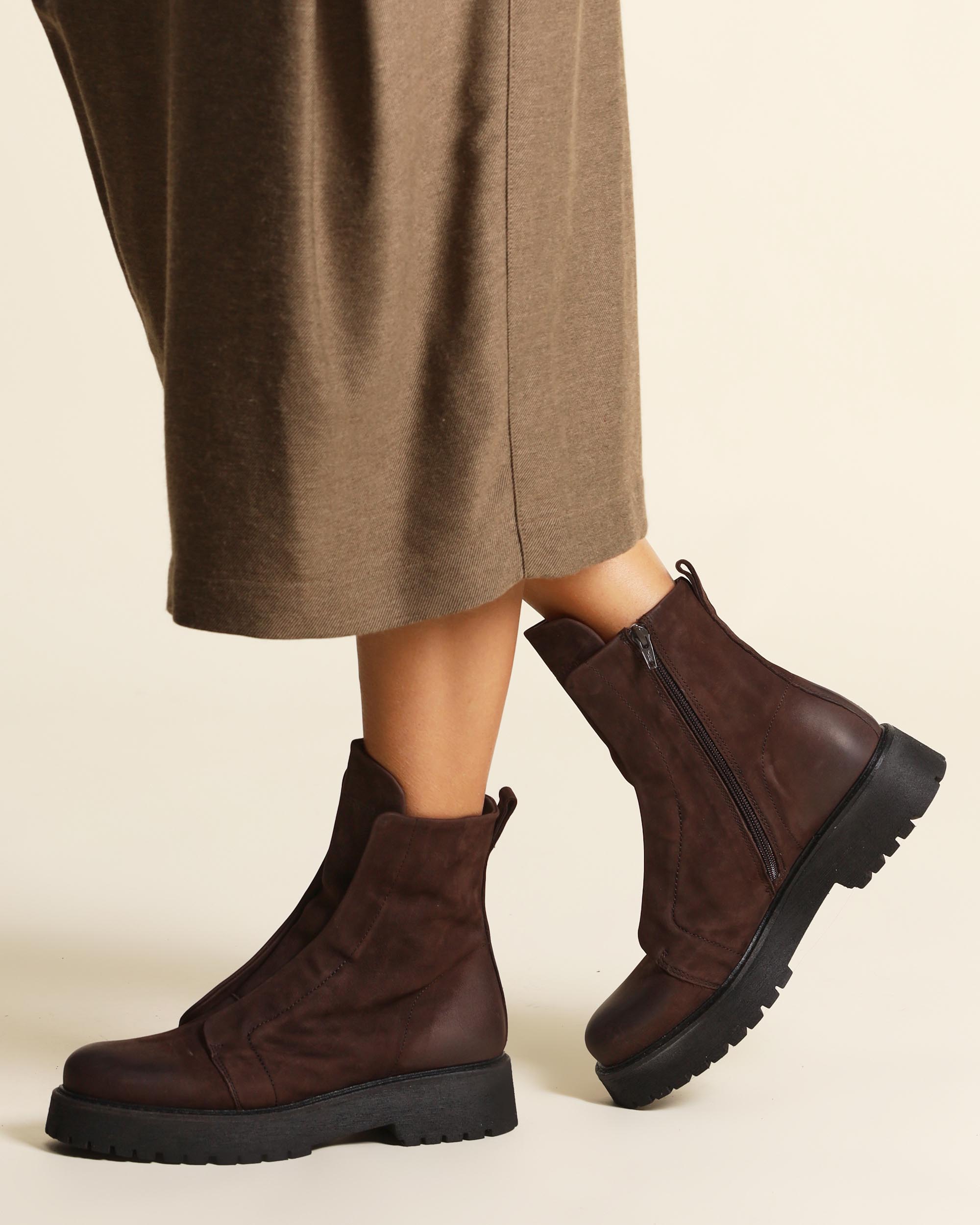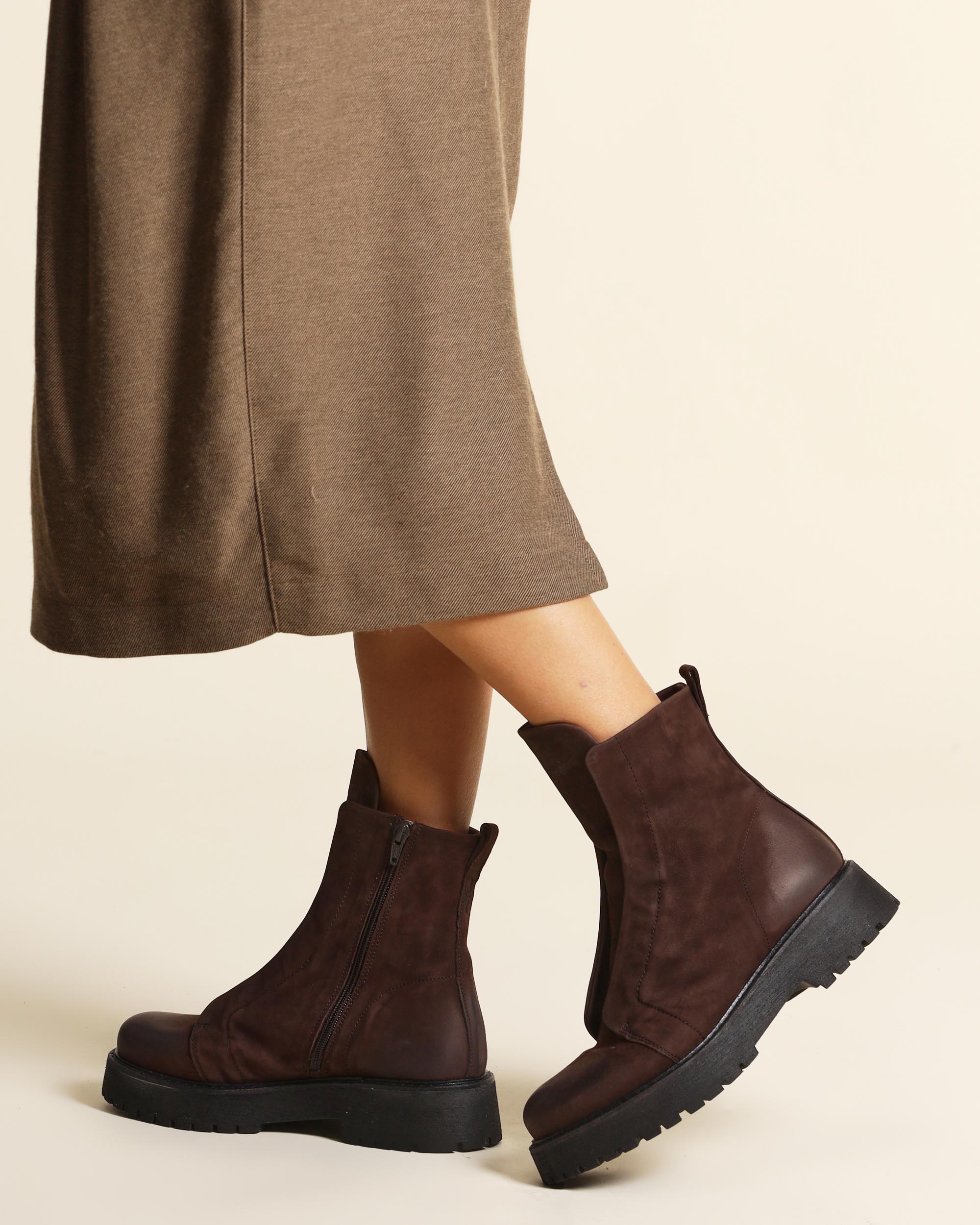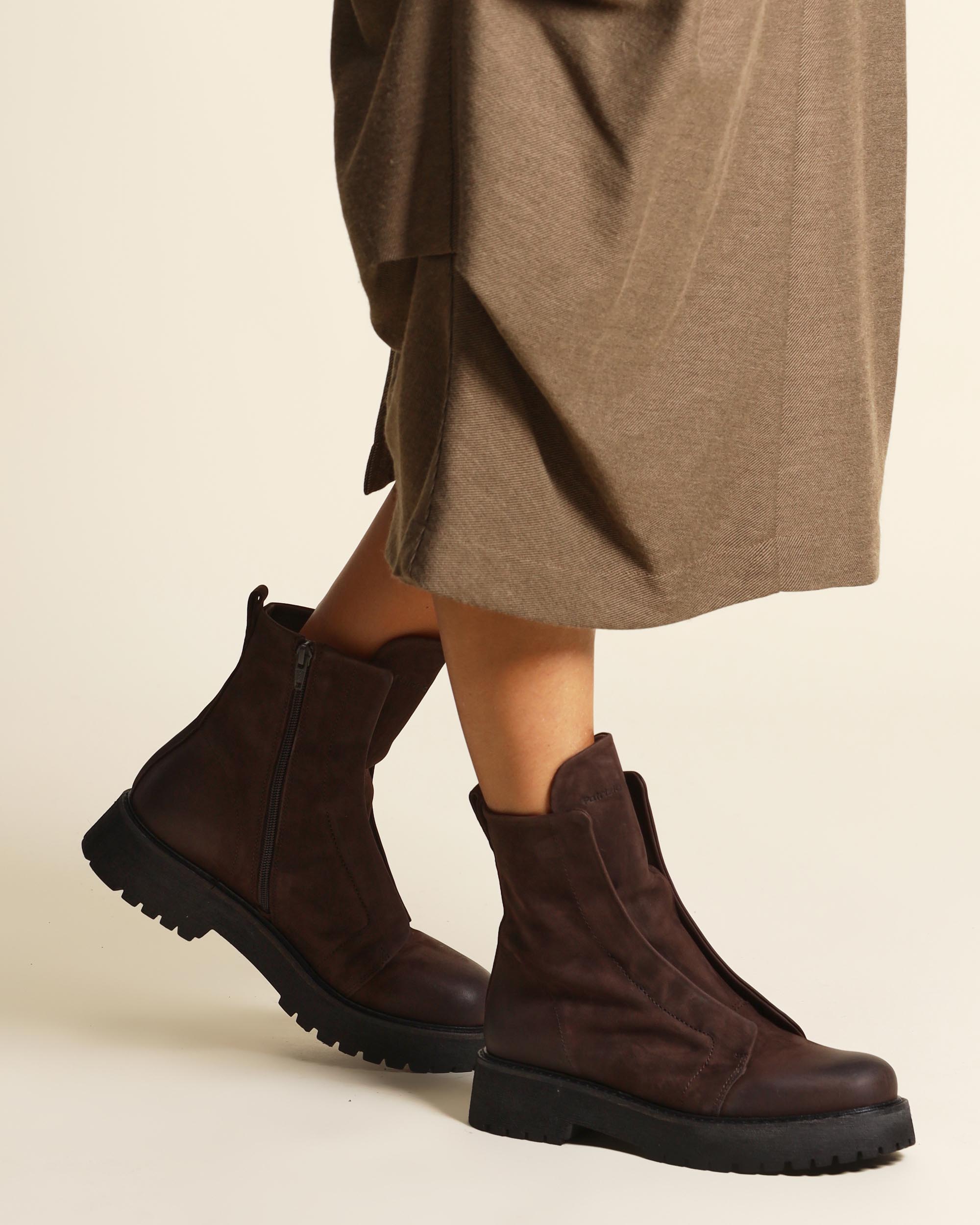 Anfibi in nabuk testa moro con elastico nascosto, senza lacci, chiusura con zip laterale, suola mart in gomma , tacco 40, battuta 15, platform 25, fodera in pelle, sottopiede in pelle, punta tonda, made in Italy, collezione donna Patrizia Bonfanti Autunno Inverno 2025/26