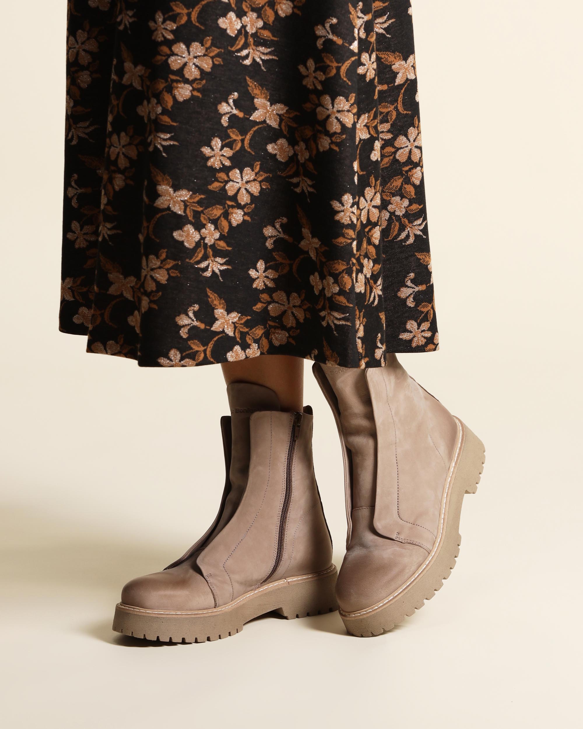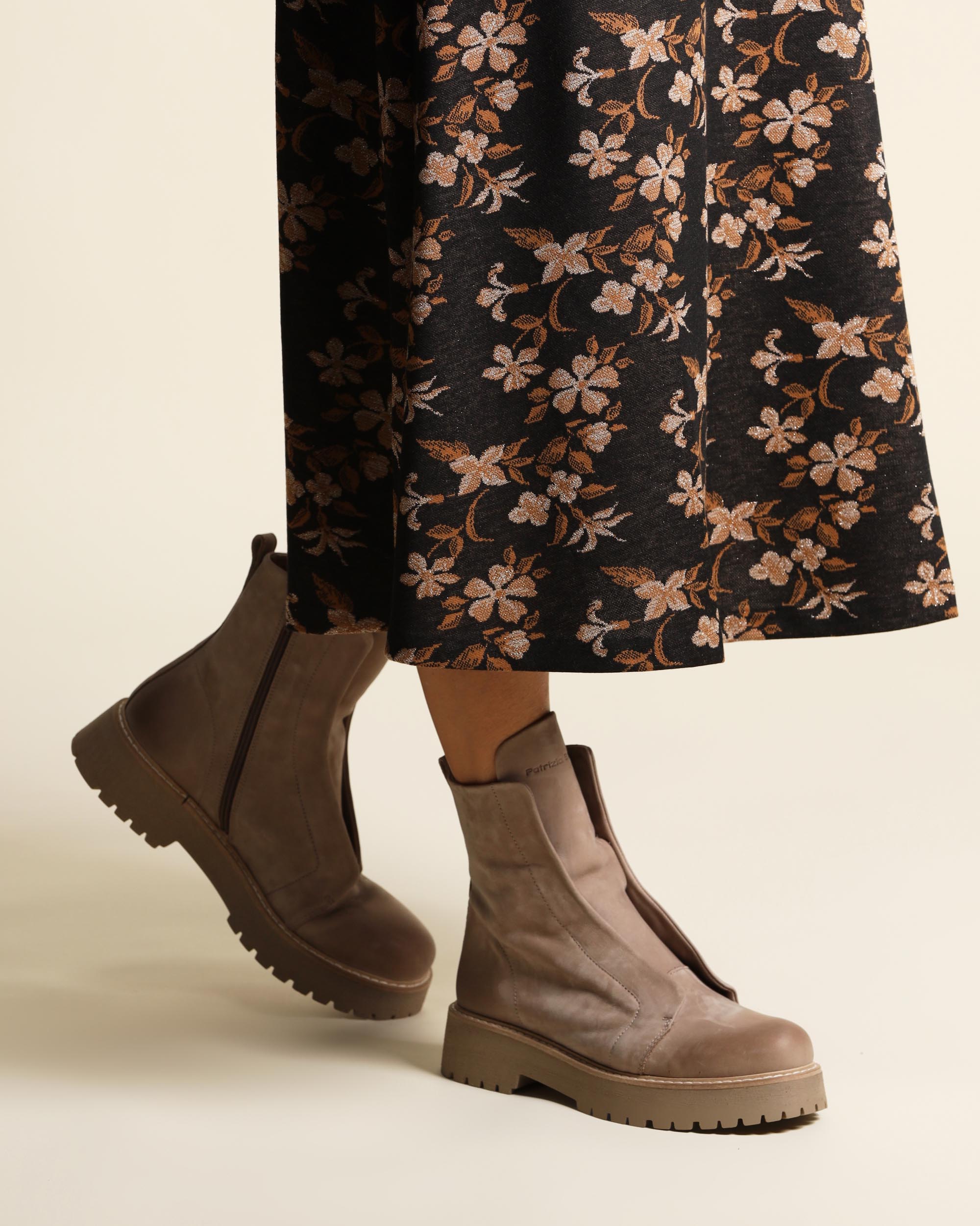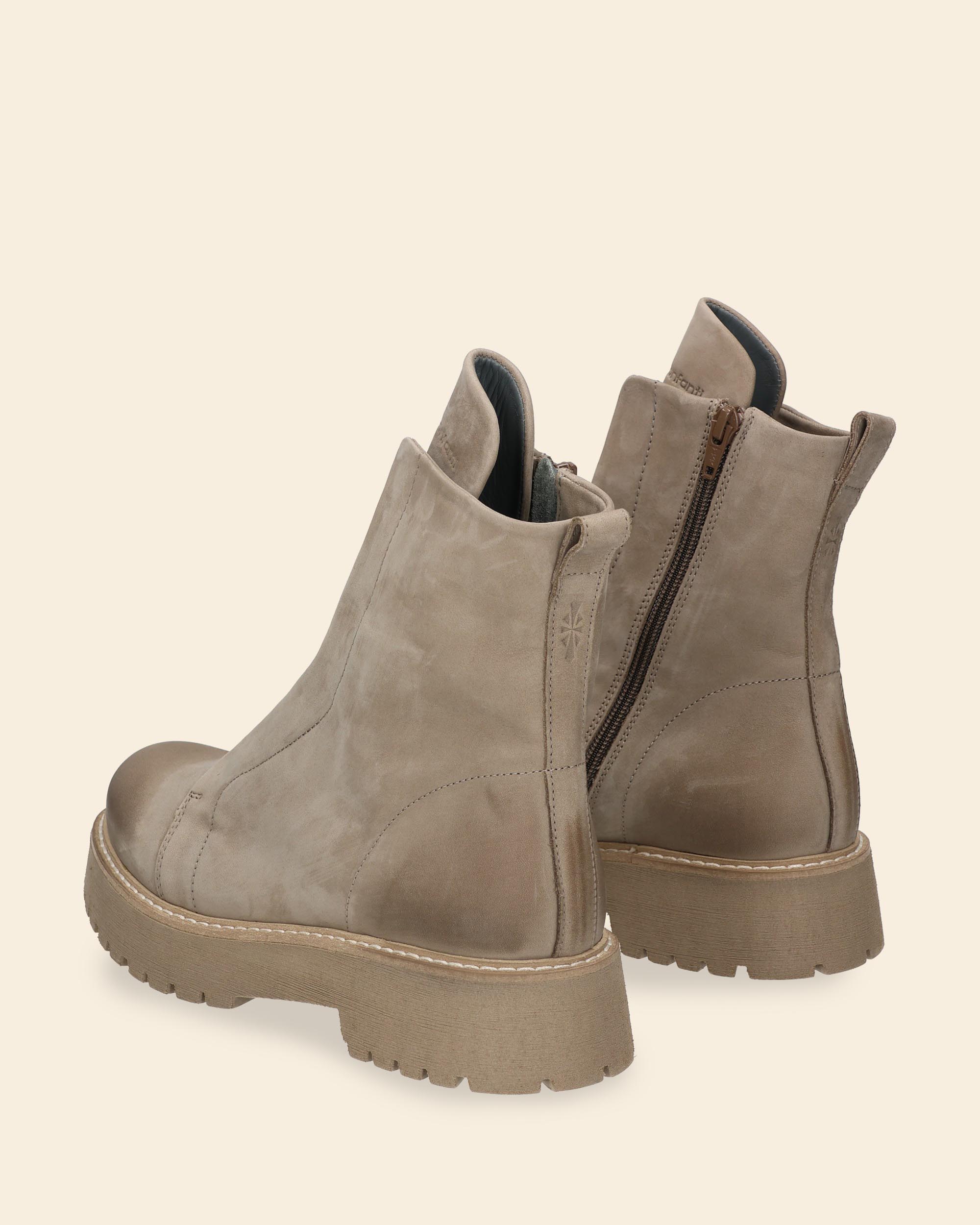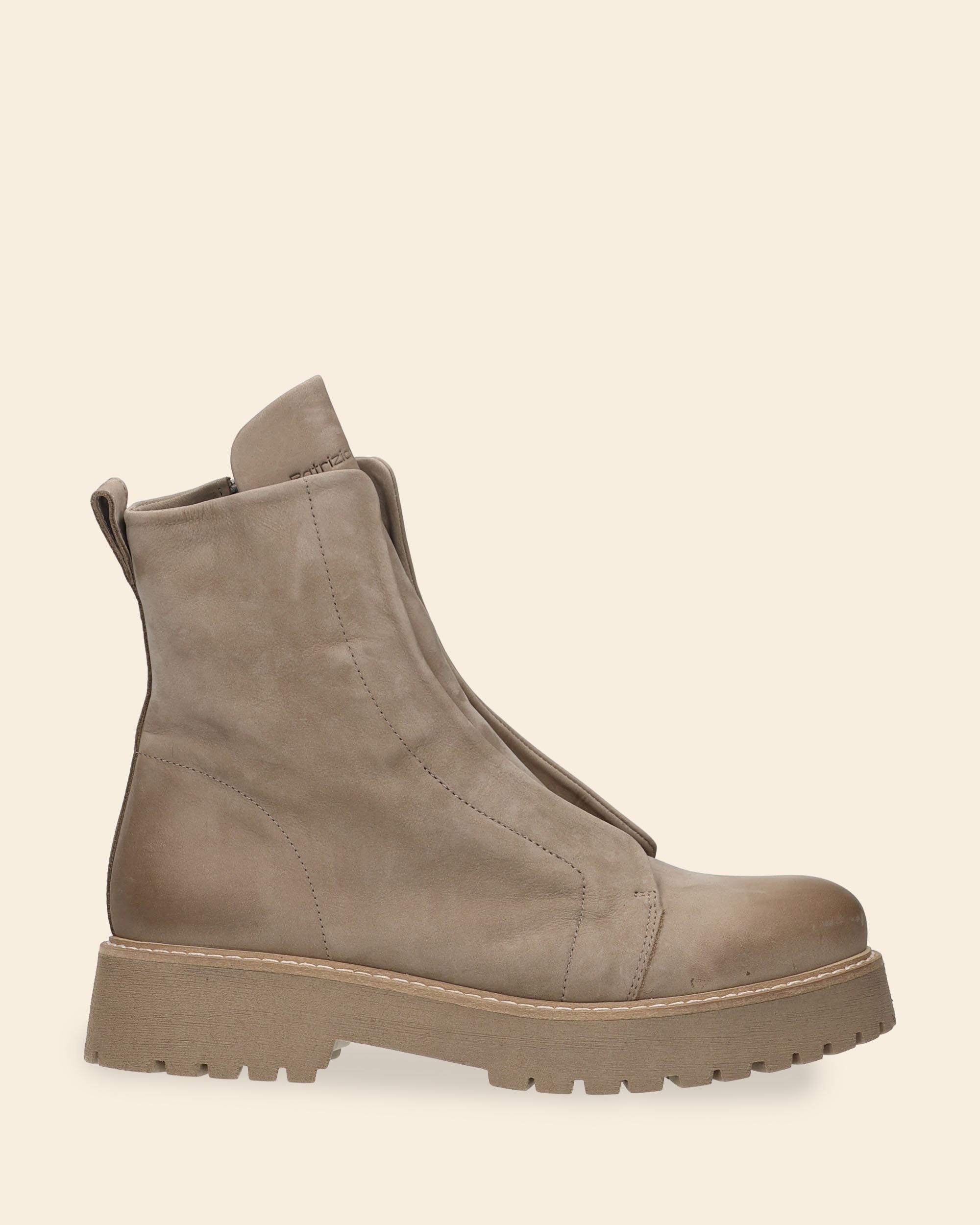 Anfibi in nabuk natural con elastico nascosto, senza lacci, chiusura con zip laterale, suola mart in gomma , tacco 40, battuta 15, platform 25, fodera in pelle, sottopiede in pelle, punta tonda, made in Italy, collezione donna Patrizia Bonfanti Autunno Inverno 2025/26