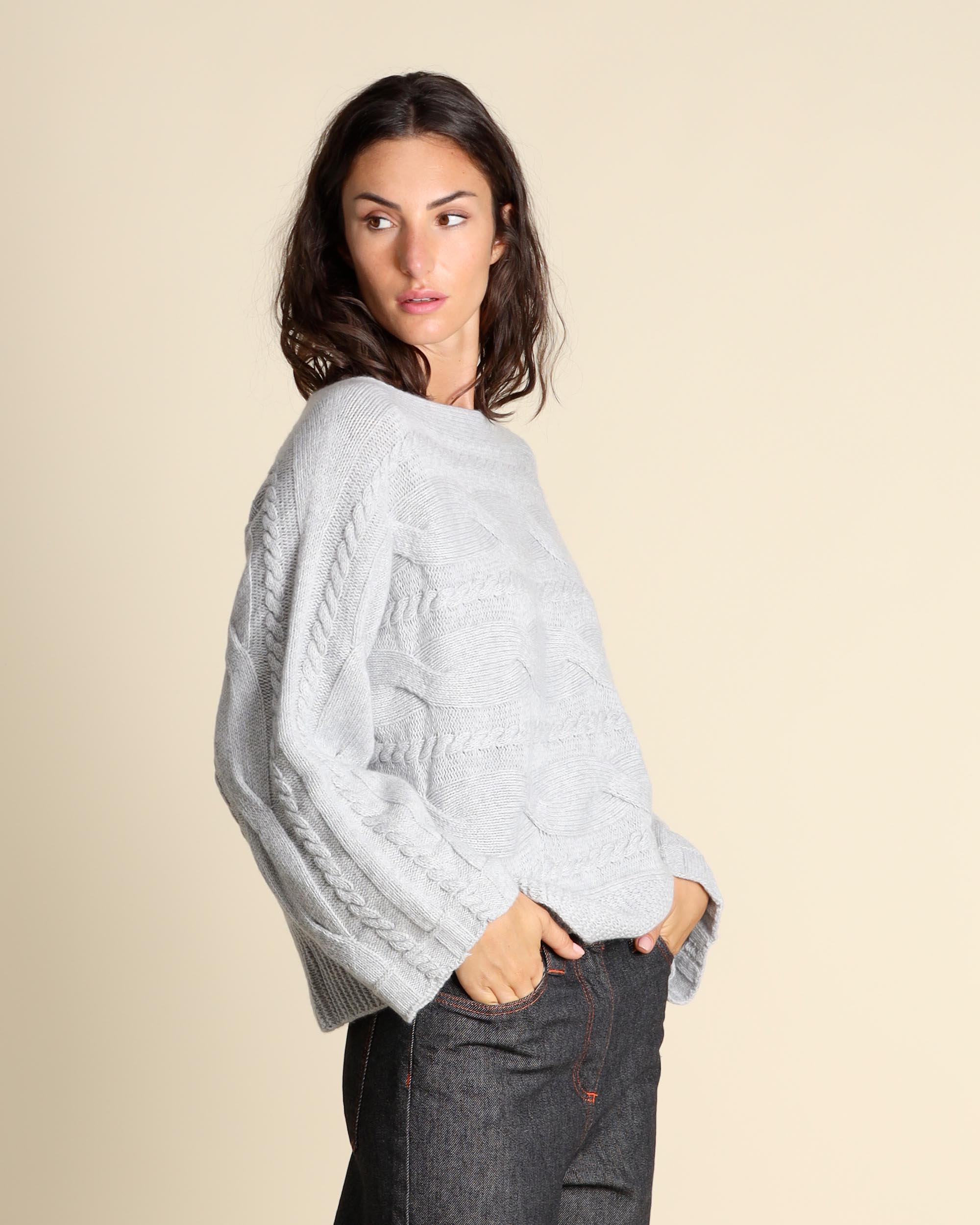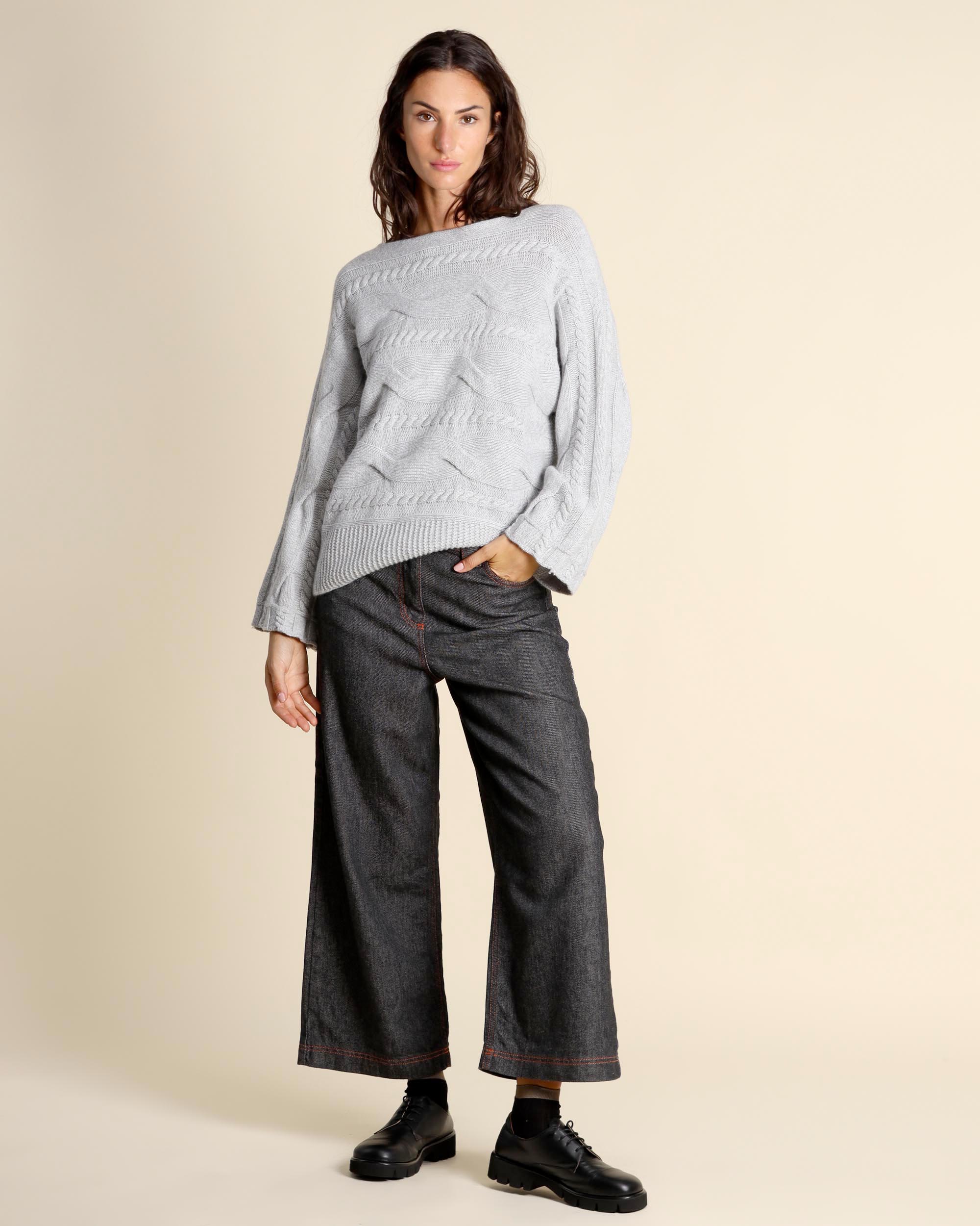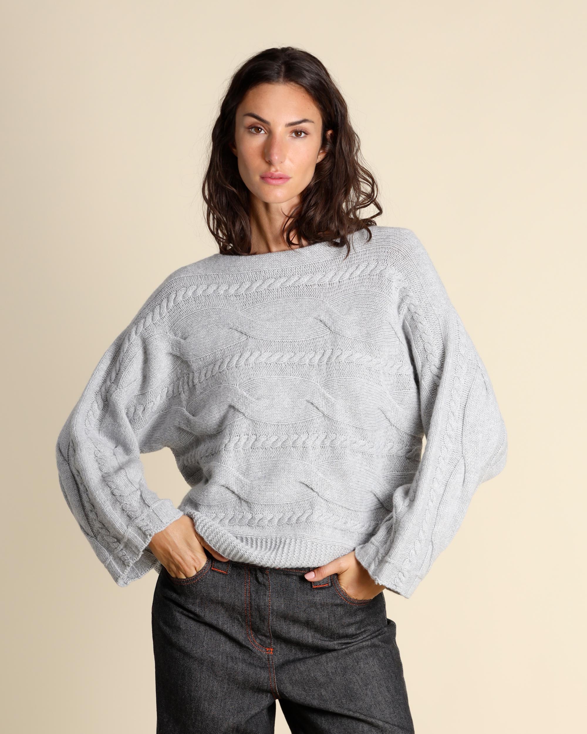 Maglia grigio chiaro in cashmere, seta e lana con lavorazione a trecce, scollo a barchetta, maniche lunghe, linea morbida, made in Italy, la modella indossa una tg.S, la modella ha le seguenti misure: altezza 179, seno 84, vita 63, fianchi 94, collezione donna Liviana Conti Autunno Inverno 2025/26
