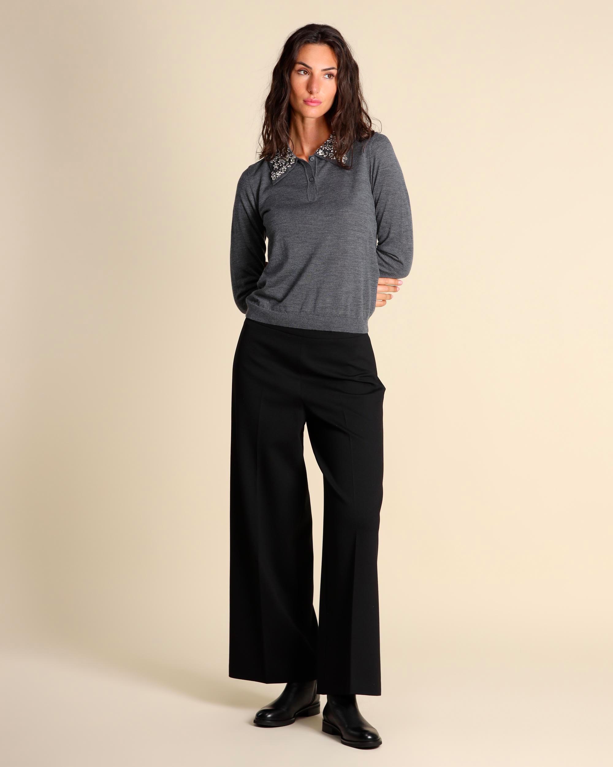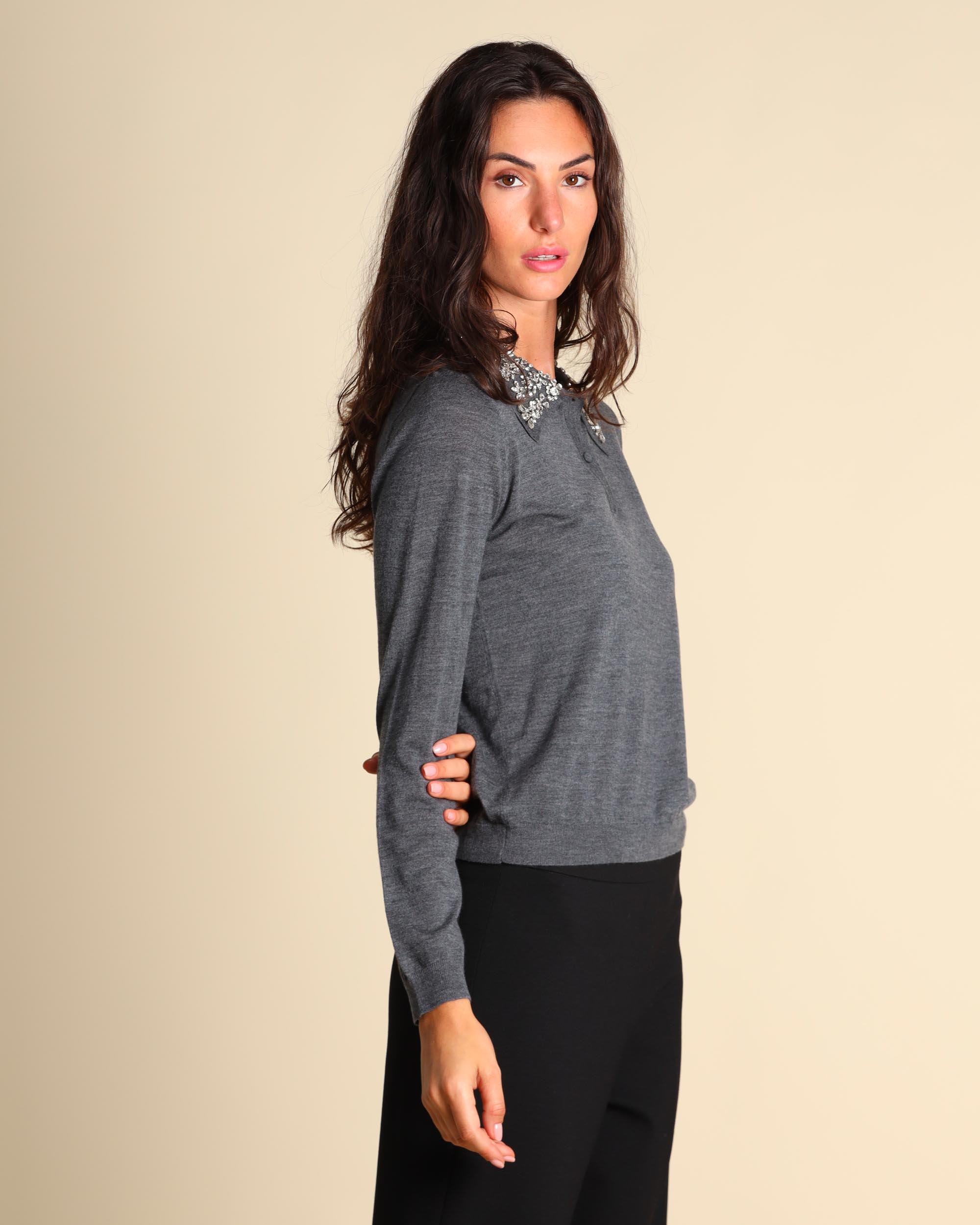 Maglia polo grigio medio melange in lana, collo con strass, maniche lunghe, linea dritta, Elisa indossa una tg.S, Elisa ha le seguenti misure: altezza 179, seno 84, vita 63, fianchi 94, collezione donna Liviana Conti Autunno Inverno 2025/26