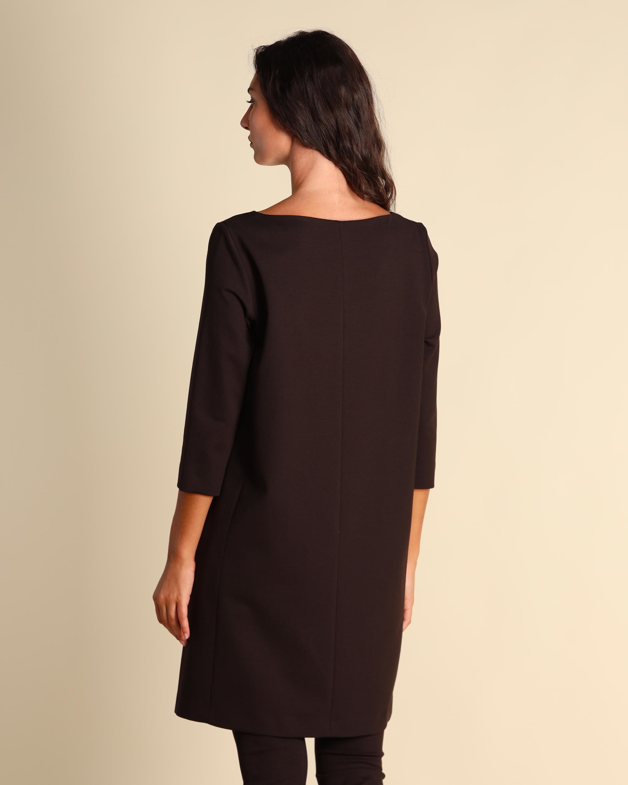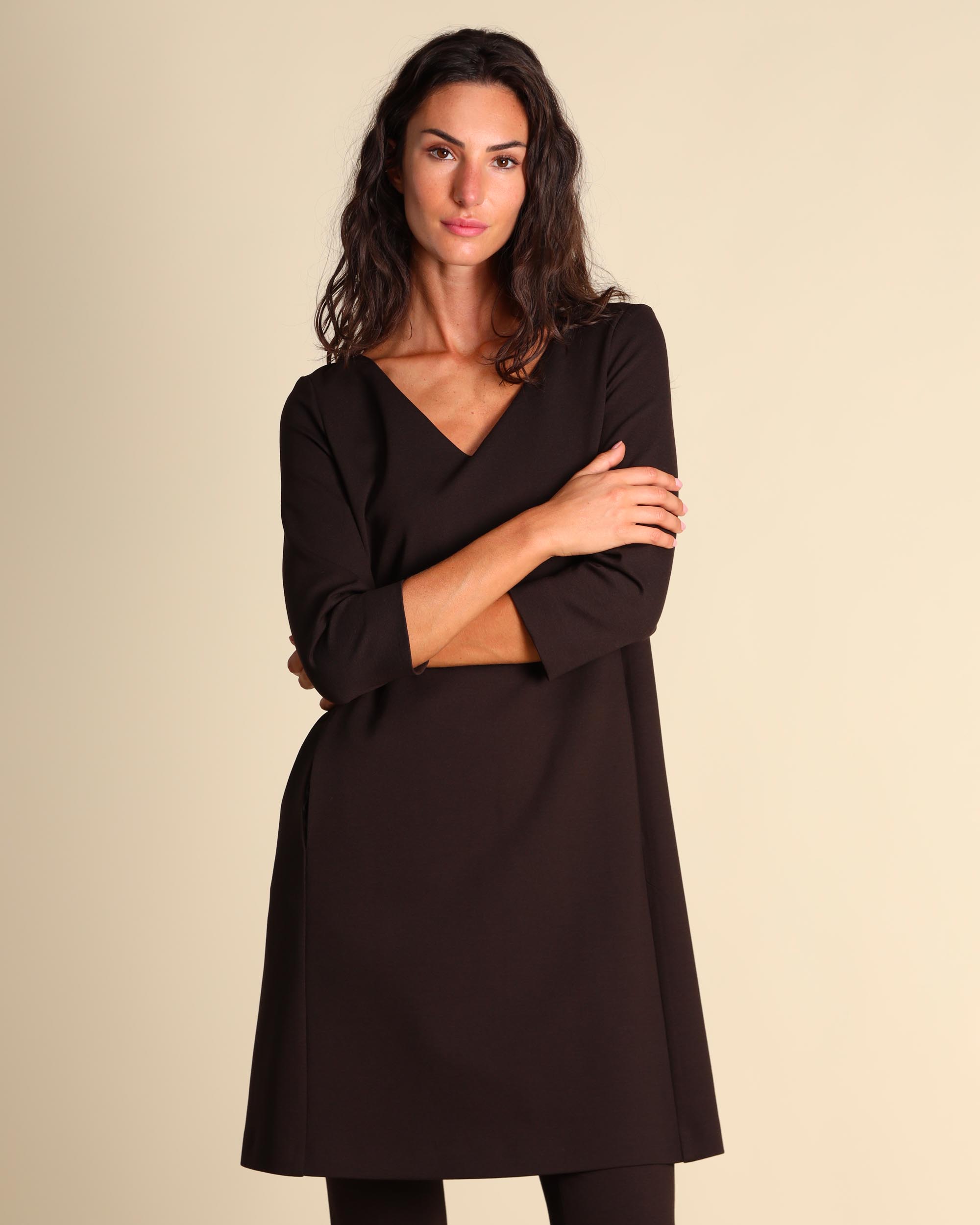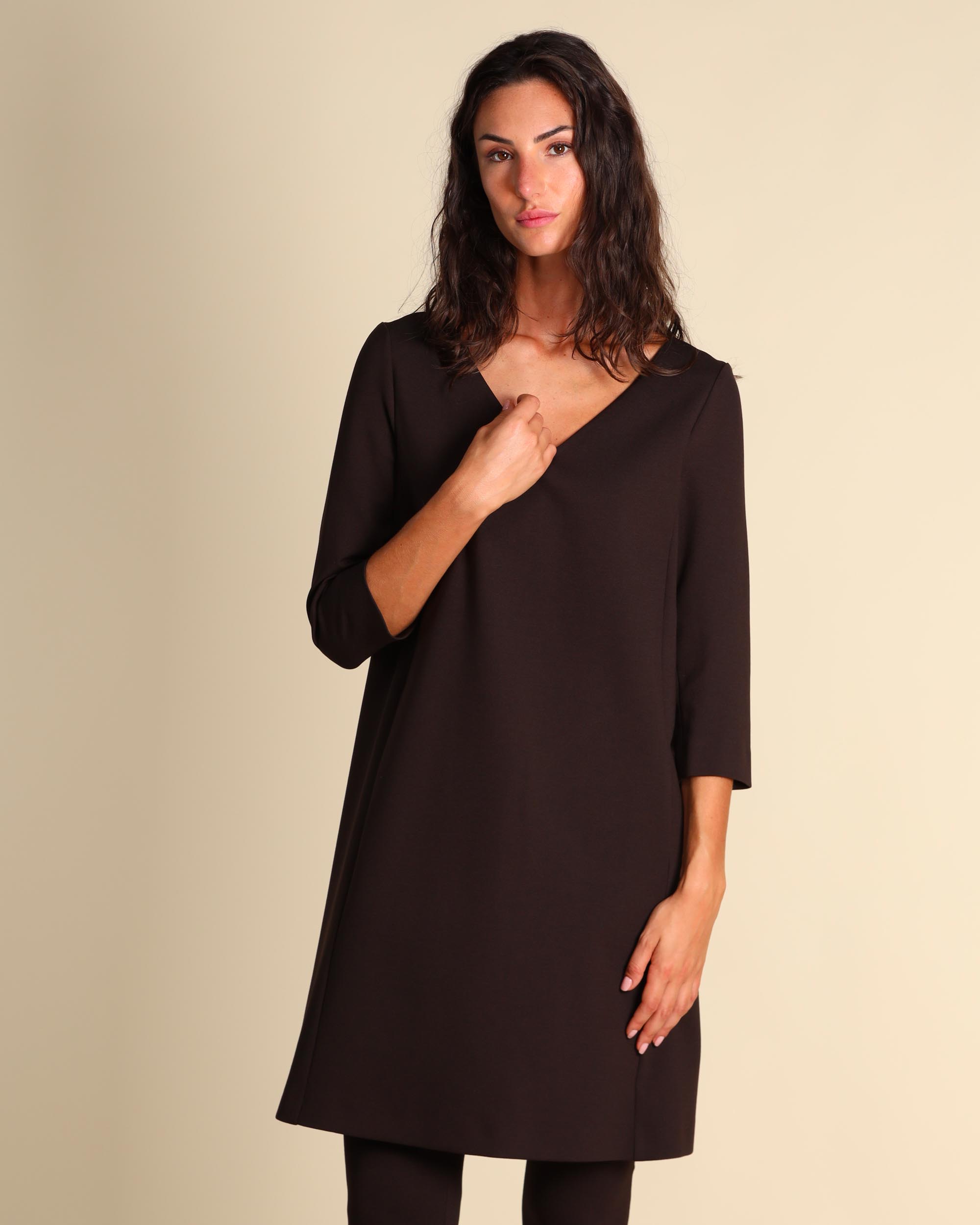 Abito testa moro in punto Milano di misto viscosa stretch, collo a V, maniche tre quarti, tasche a filetto, foderato, linea dritta, made in Italy, la modella indossa una tg.42, la modella ha le seguenti misure: altezza 179, seno 84, vita 63, fianchi 94, collezione donna Liviana Conti Autunno Inverno 2025/26