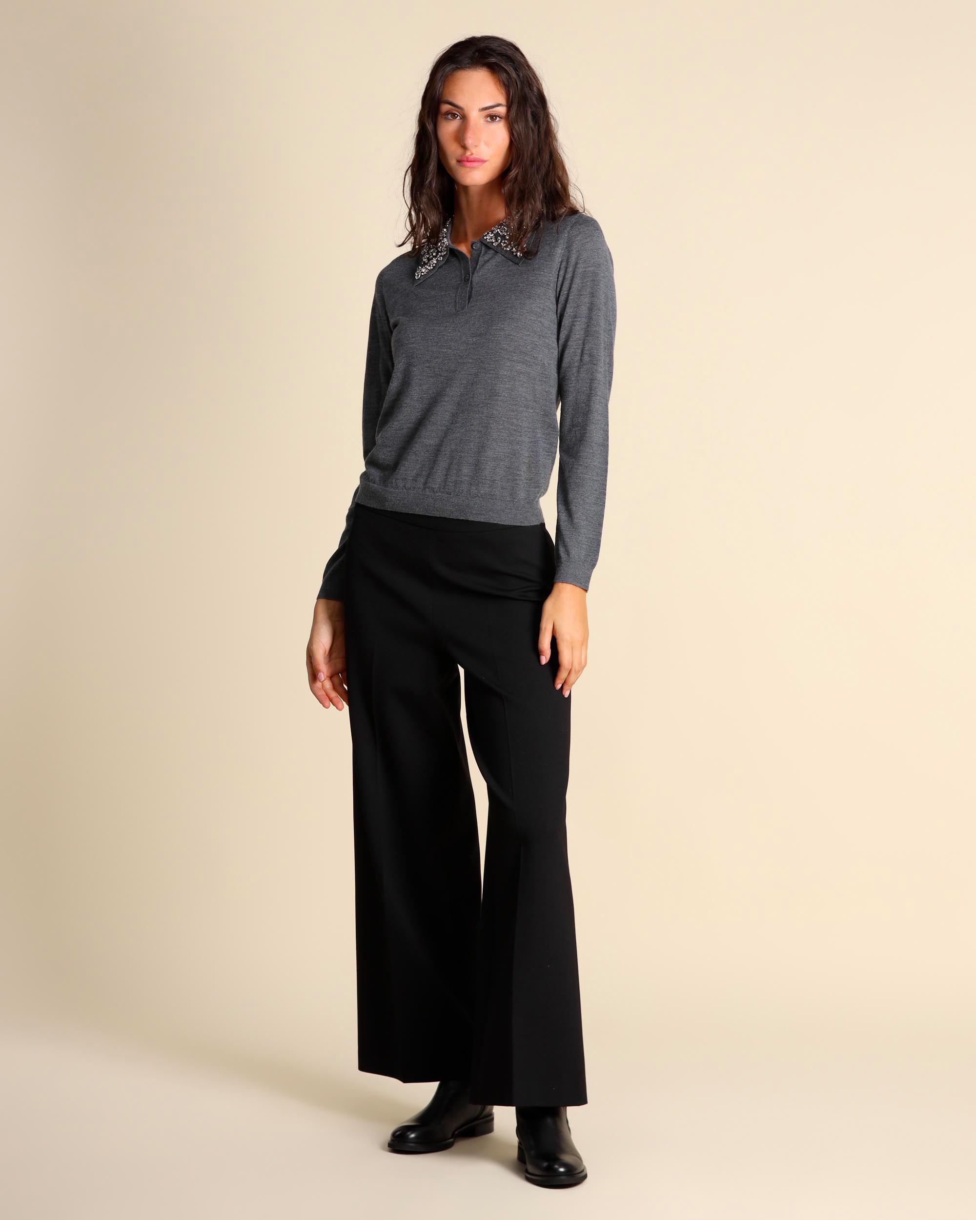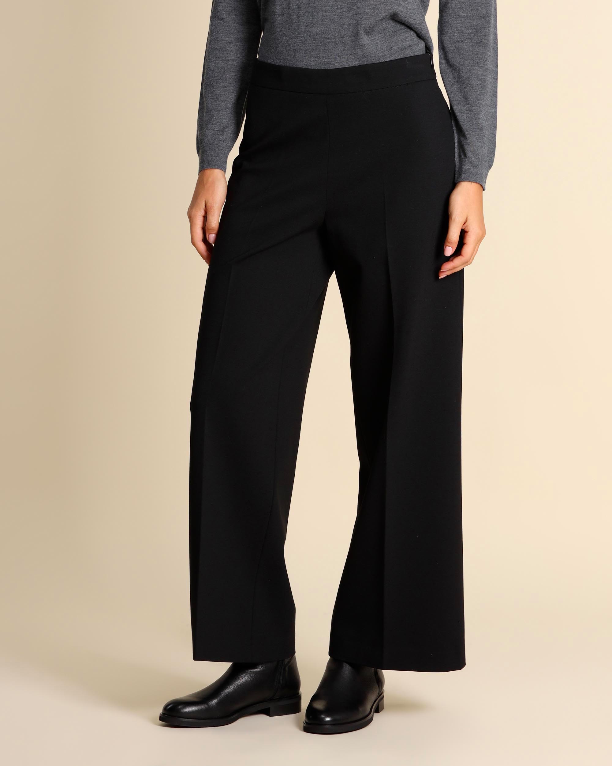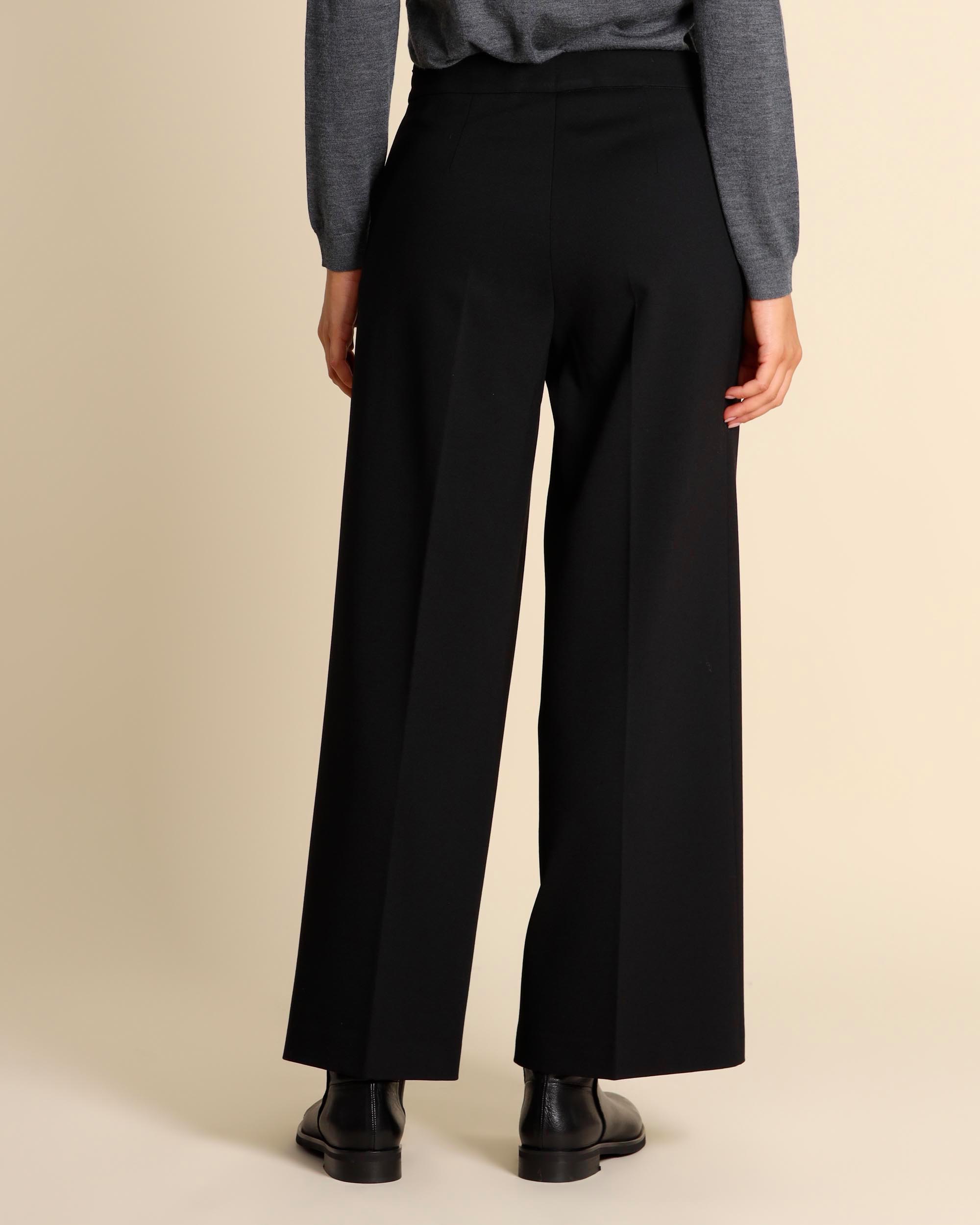 Pantaloni neri in punto Milano di misto viscosa stretch, chiusura laterale con zip invisibile, linea ampia, iega stirata, made in Italy, la modella indossa una tg.42, la modella ha le seguenti misure: altezza 179, seno 84, vita 63, fianchi 94, collezione donna Liviana Conti Autunno Inverno 2025/26