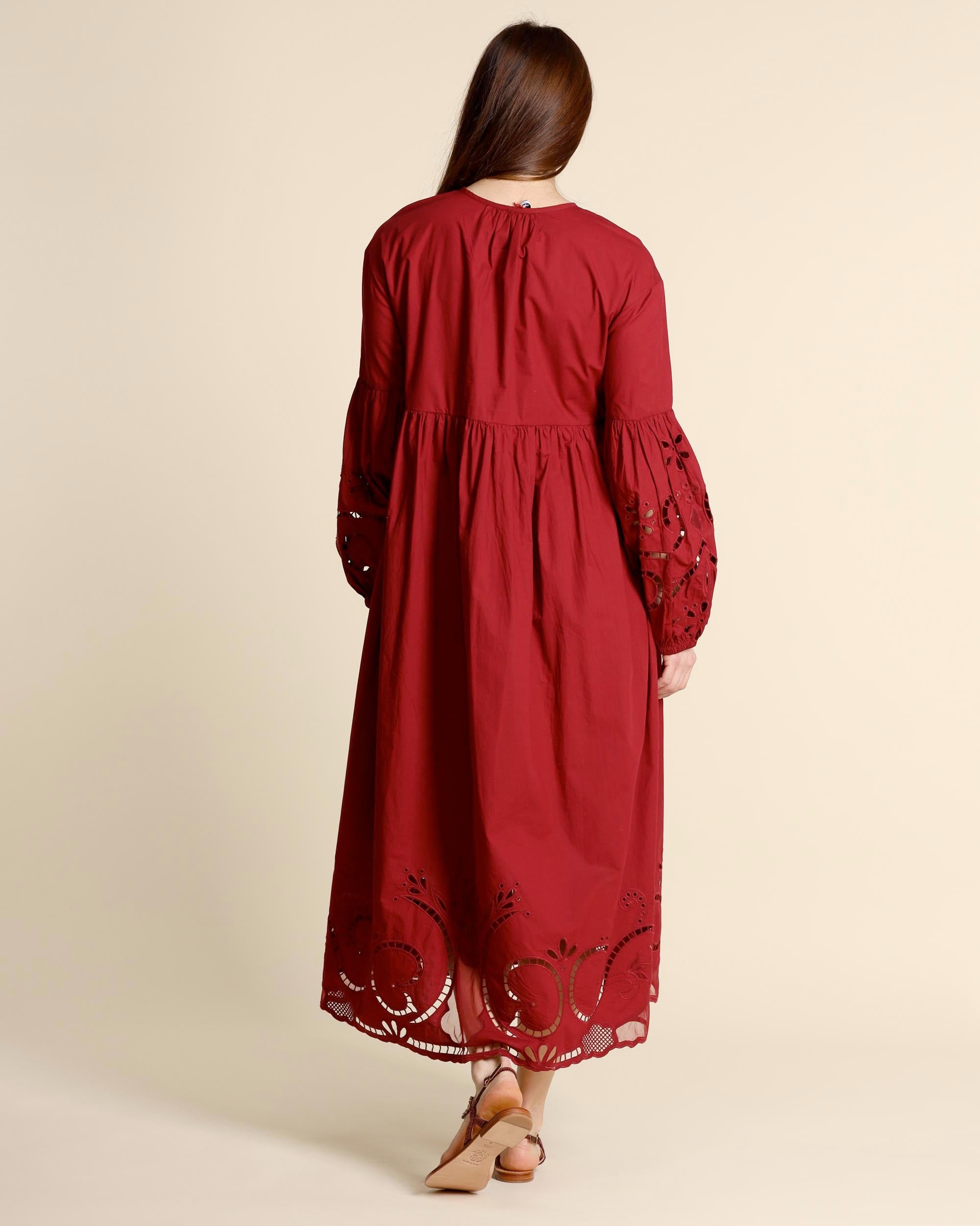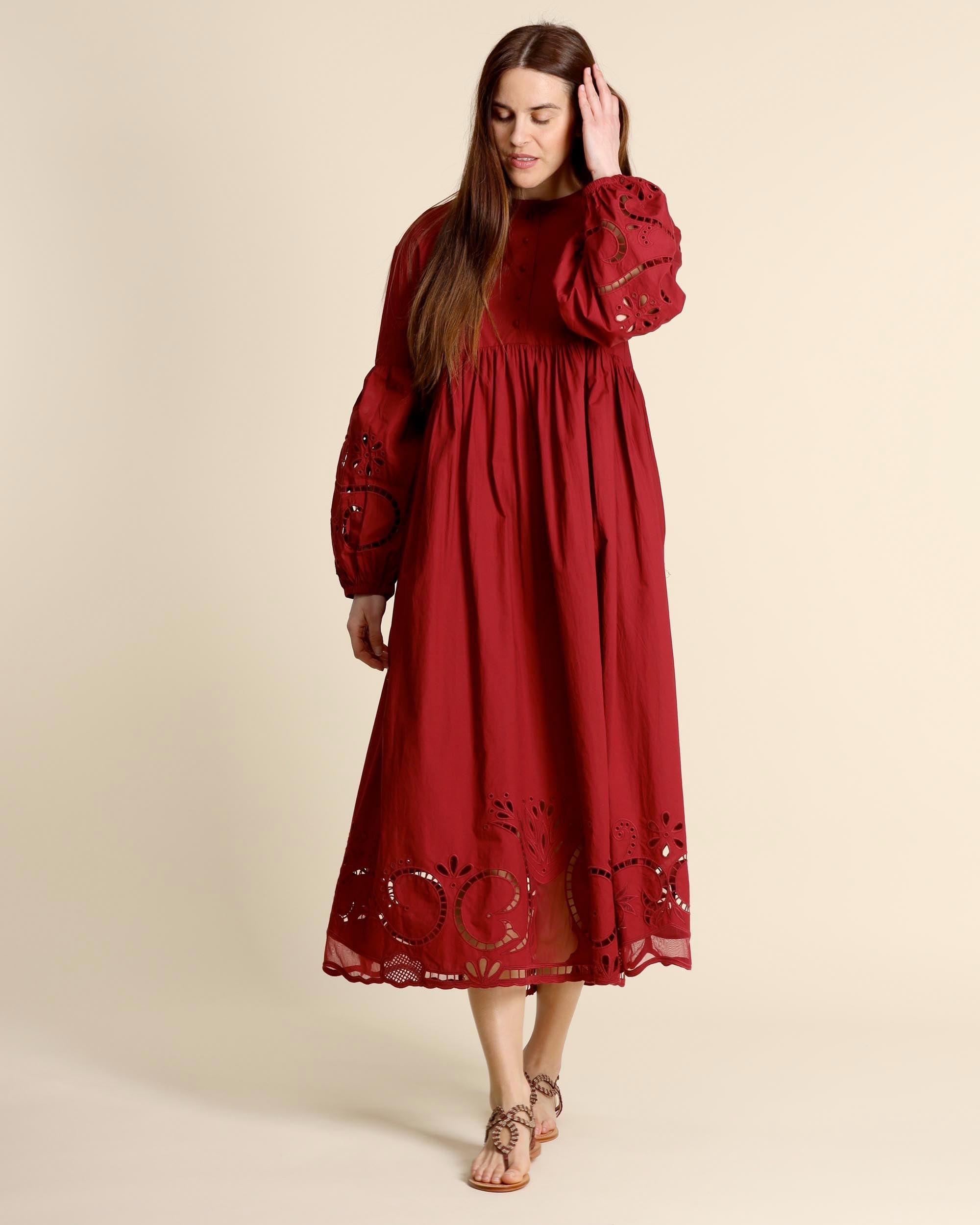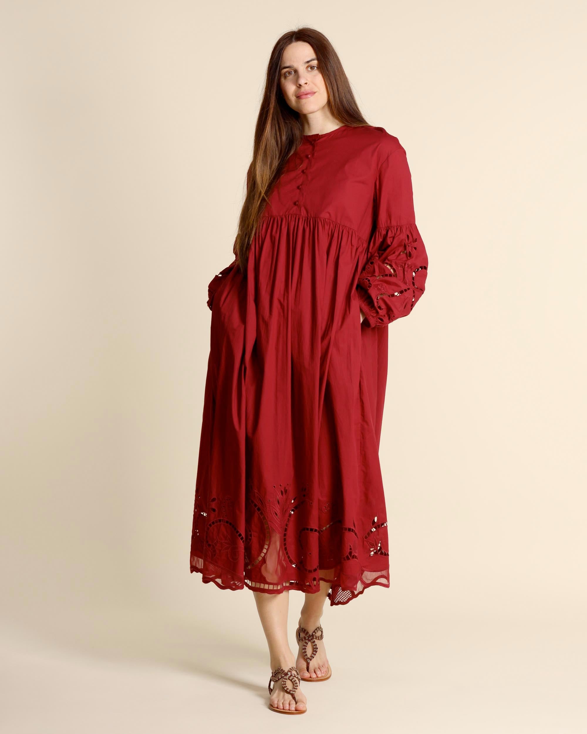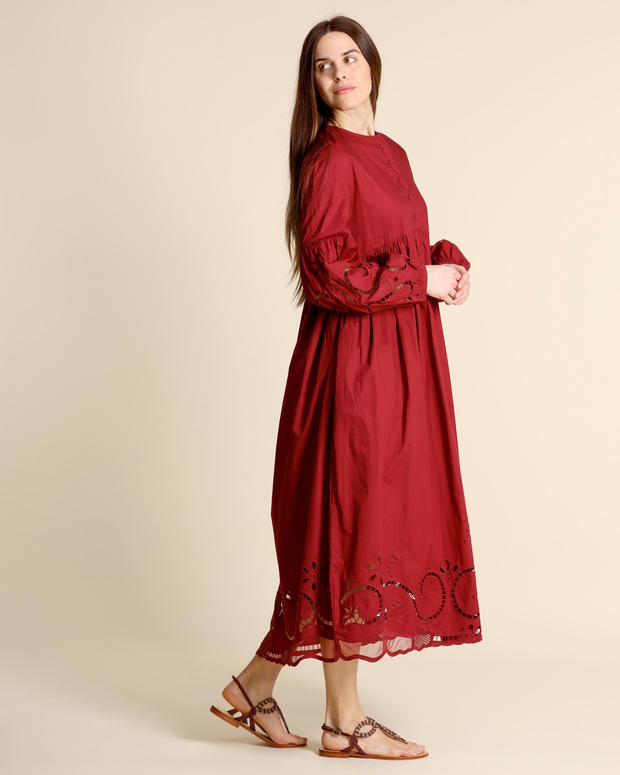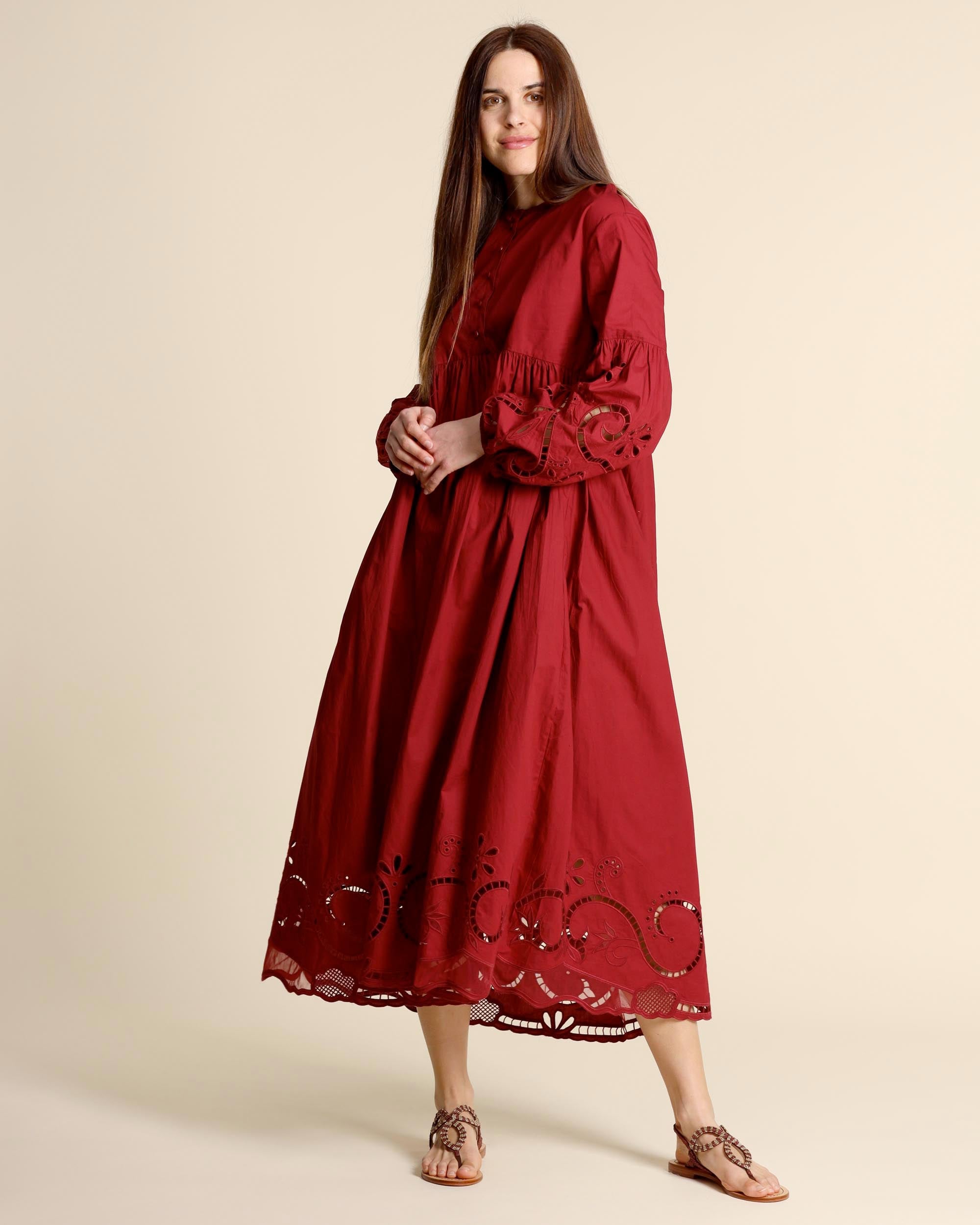 Abito lungo ricamato color terrarossa in cotone, scollo tondo, chiusura con bottoni ricoperti, linea ampia, chiusura con zip invisibile sul dietro, maniche lunghe ricamate, sfoderato, made in Italy, la modella indossa una tg.42, la modella ha le seguenti misure: altezza 178, seno 86,vita 65, fianchi 93, collezione donna Liviana Conti Primavera Estate 2026