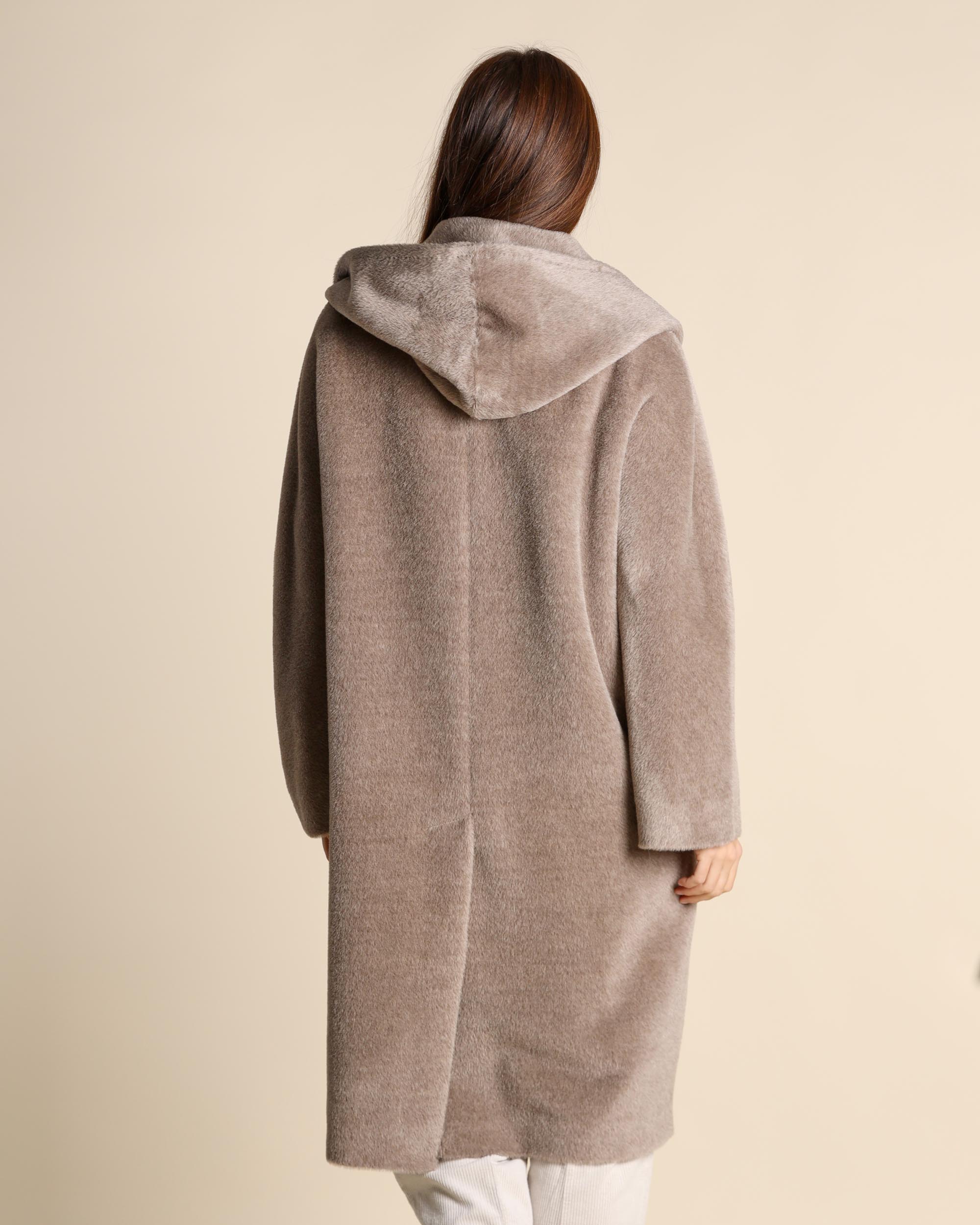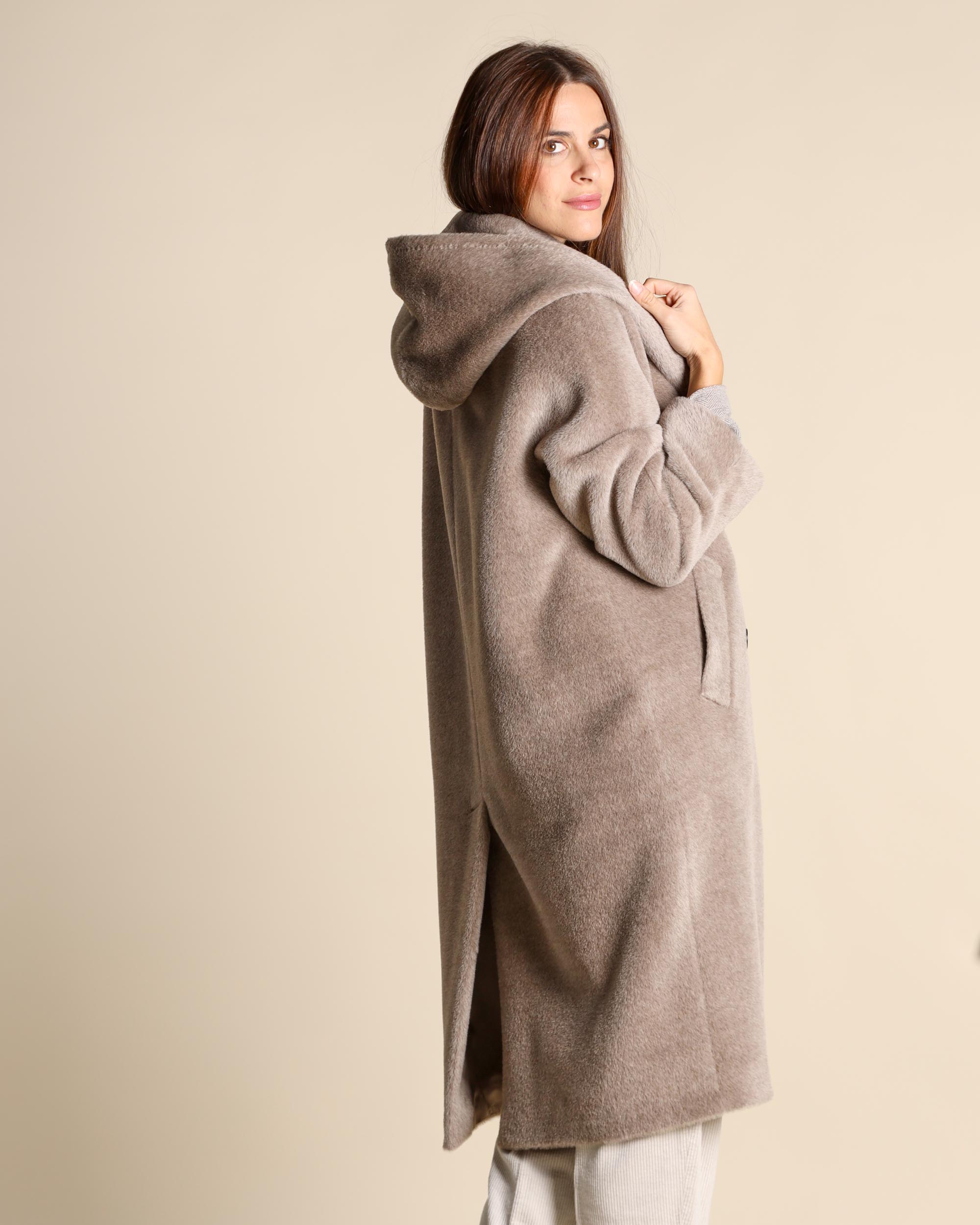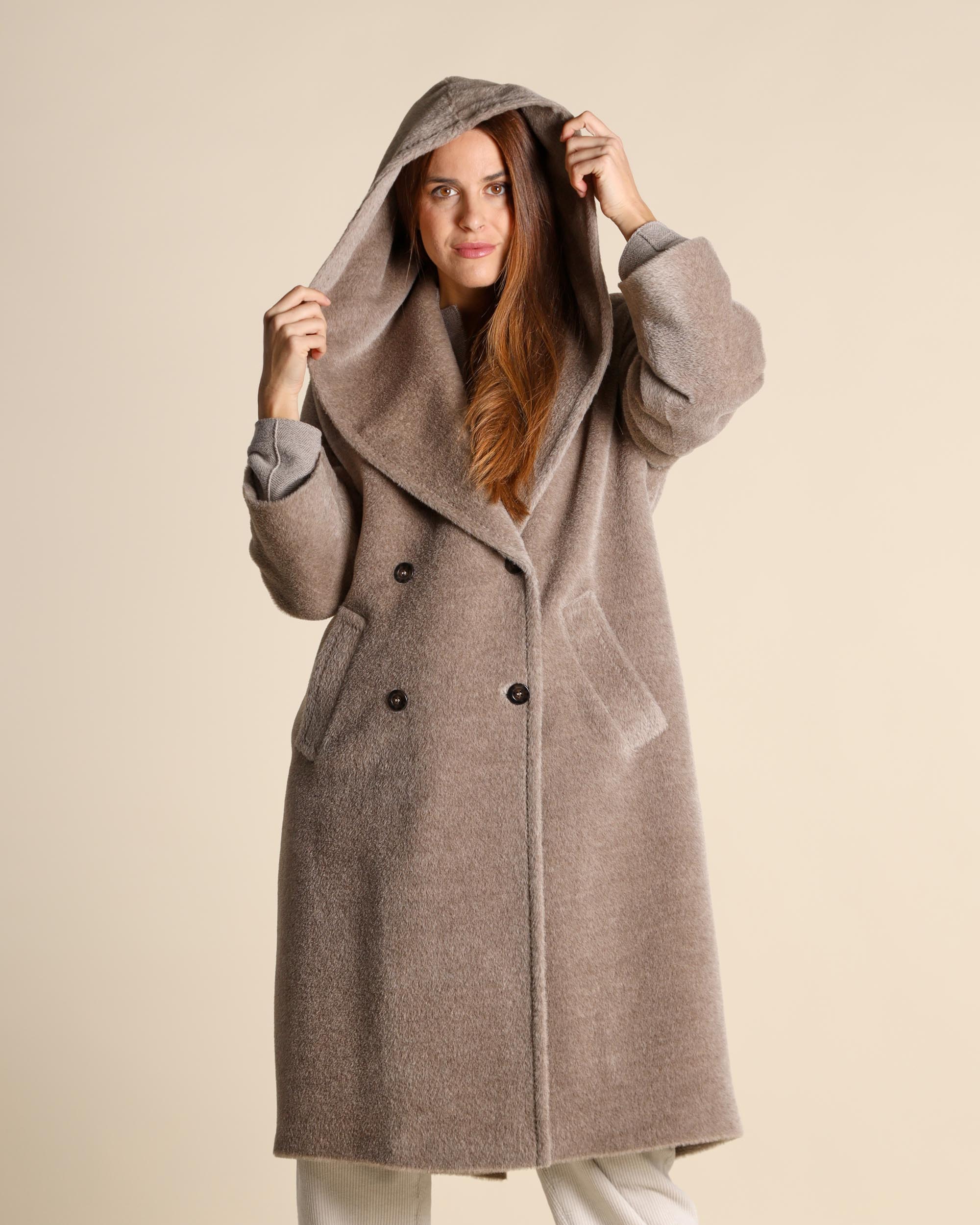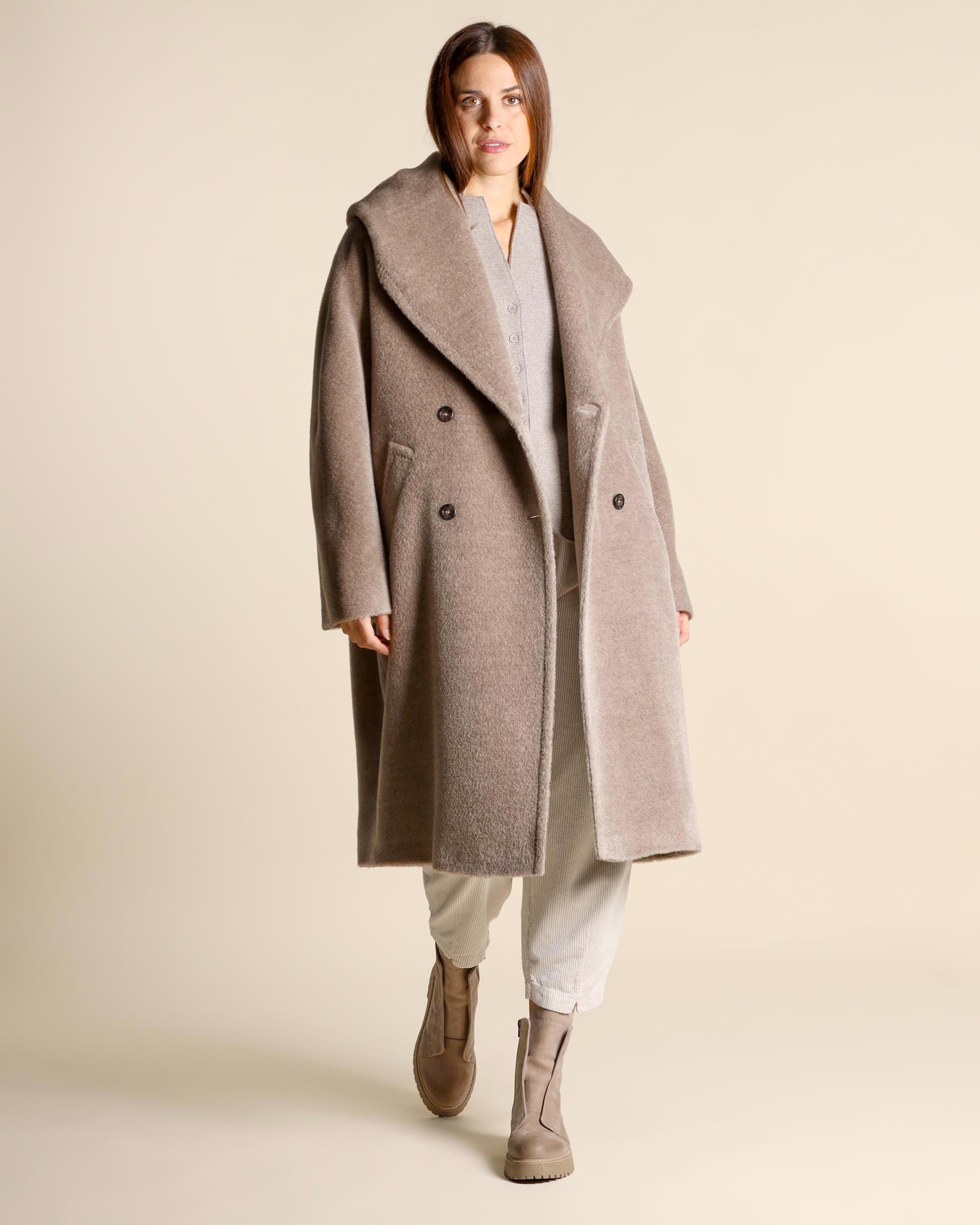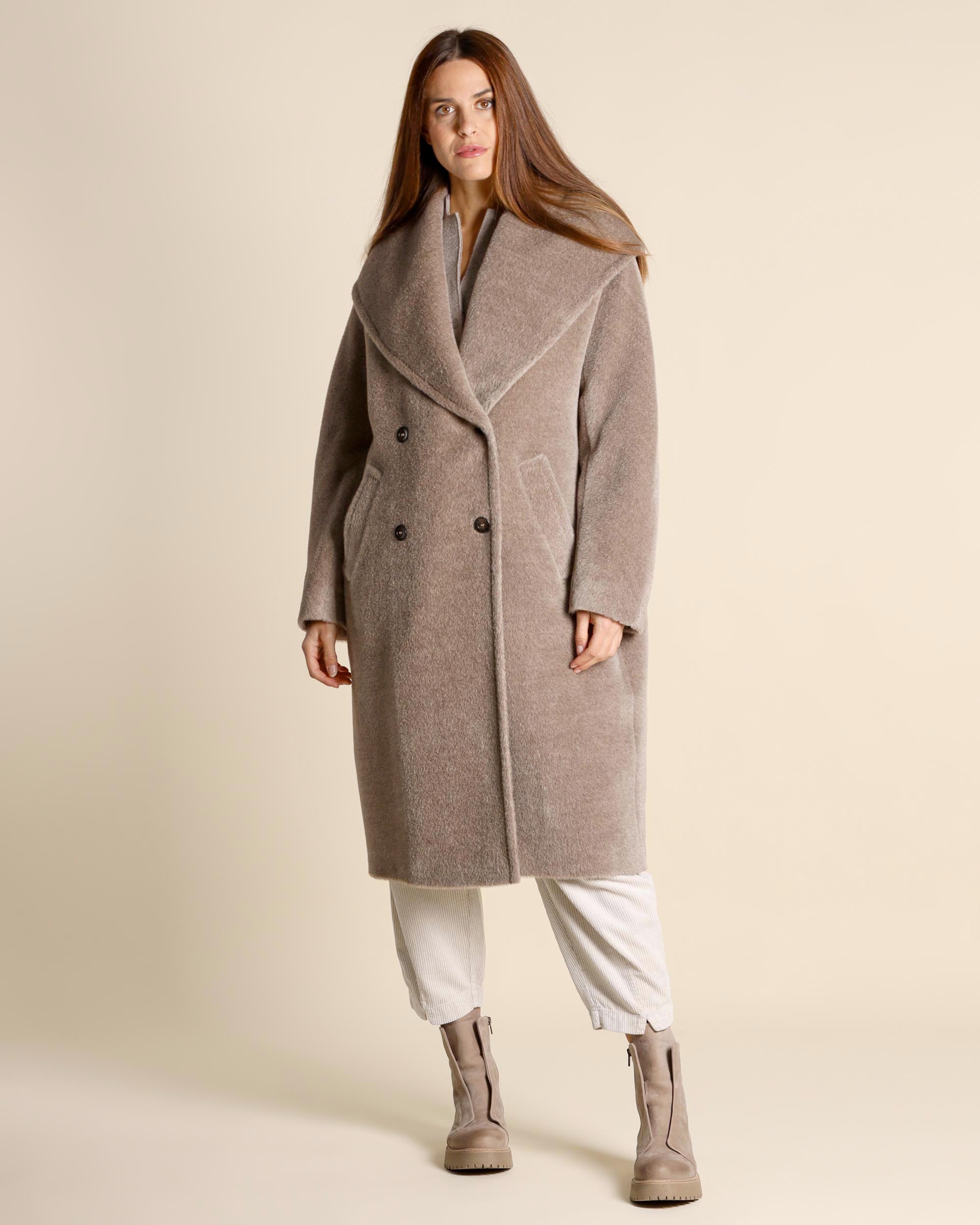 Cappotto tortora doppiopetto in suri alpaca e lana vergine, collo sciallato, maniche lunghe, chiusura con bottoni, linea ampia, tasche a filetto, foderato, spacco centrale, made in Italy, la modella indossa una tg.42, la modella ha le seguenti misure: altezza 179, seno 86,vita 65, fianchi 93, collezione donna Normeet Autunno Inverno 2025/26