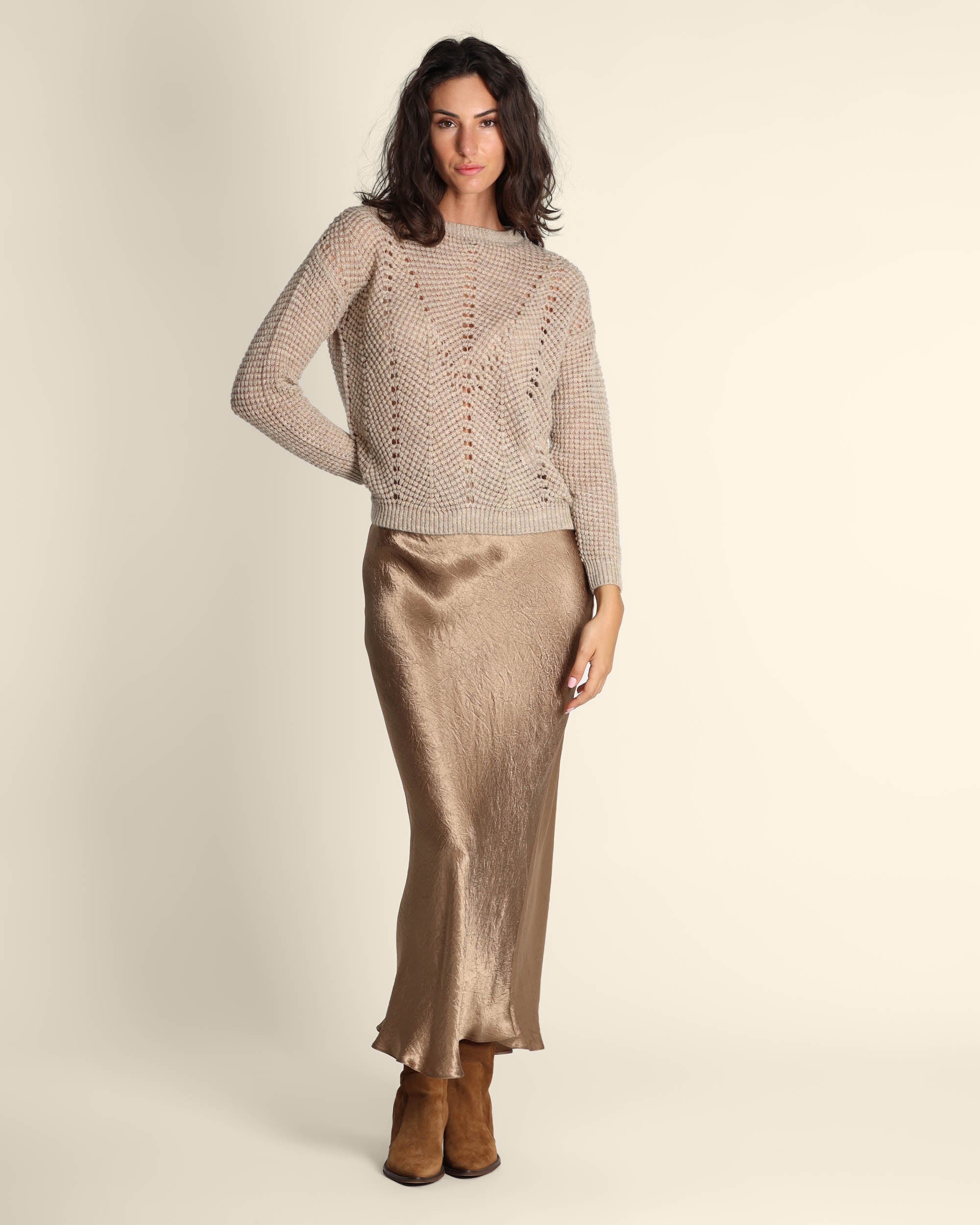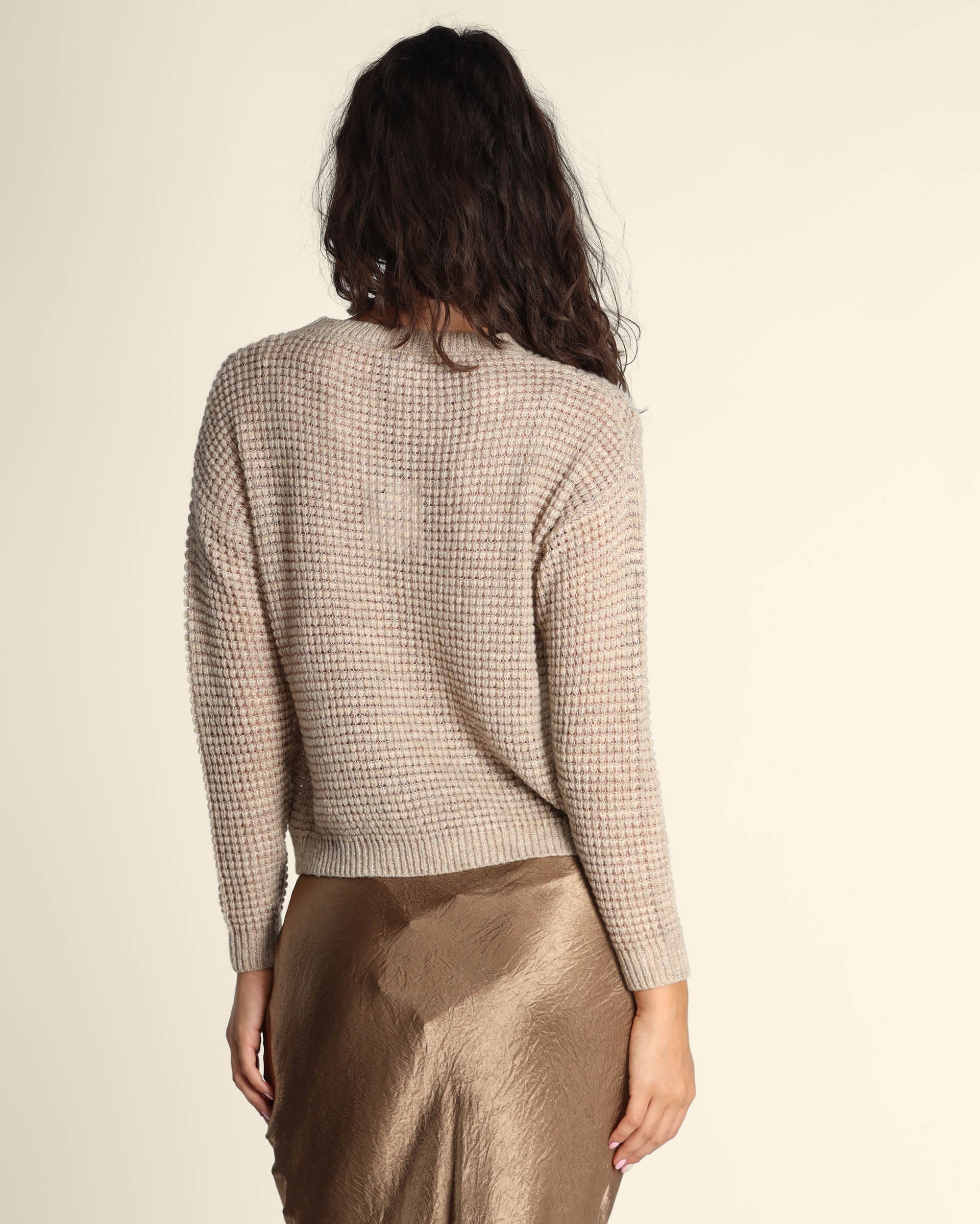 Maglia color cacha in misto lana, viscosa con filo in lurex rosa, scollo tondo, maniche lunghe, linea dritta, made in Italy, Elisa indossa una tg.S, Elisa ha le seguenti misure: altezza 179, seno 84, vita 63, fianchi 94, collezione donna Emme by Marella Autunno Inverno 2025/26