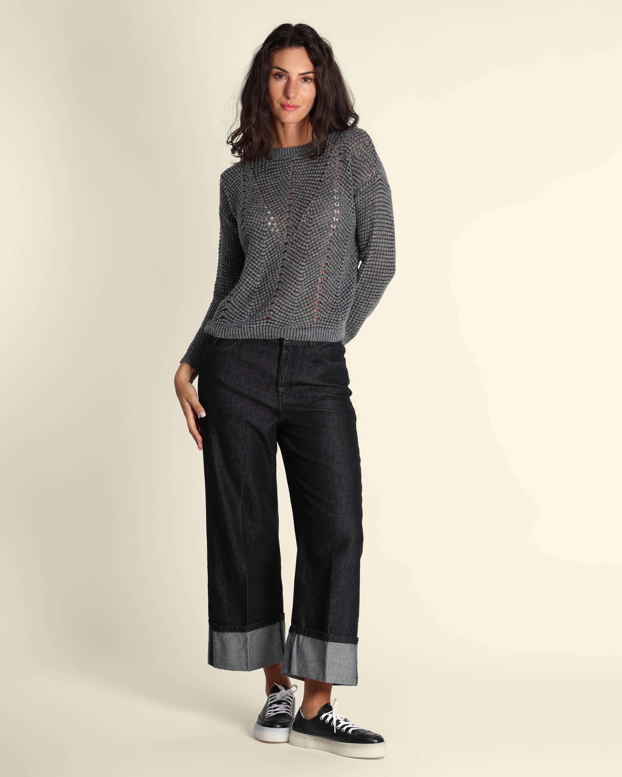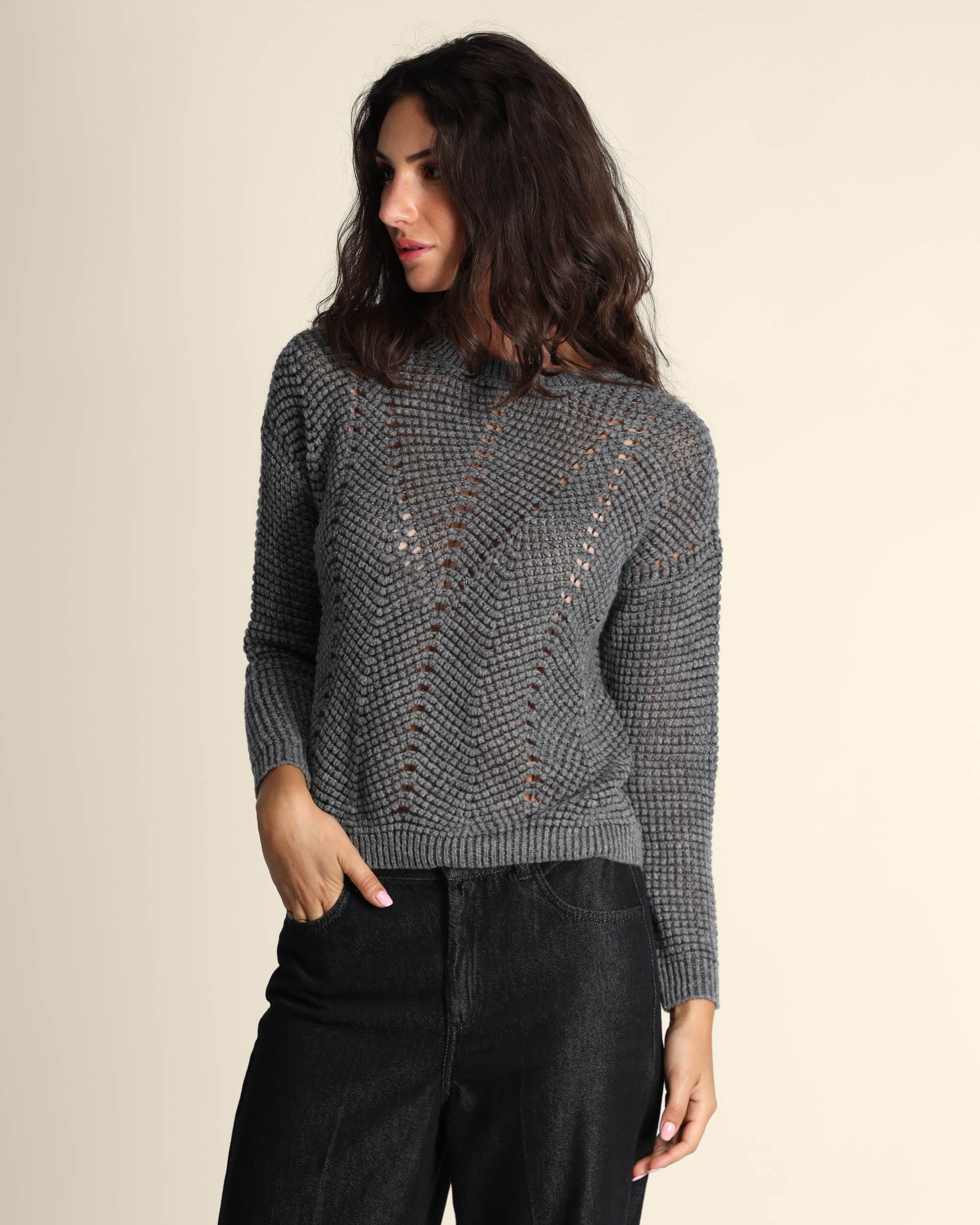 Maglia grigia in misto lana, viscosa con filo in lurex nero, scollo tondo, maniche lunghe, linea dritta, made in Italy, Elisa indossa una tg.S, Elisa ha le seguenti misure: altezza 179, seno 84, vita 63, fianchi 94, collezione donna Emme by Marella Autunno Inverno 2025/26