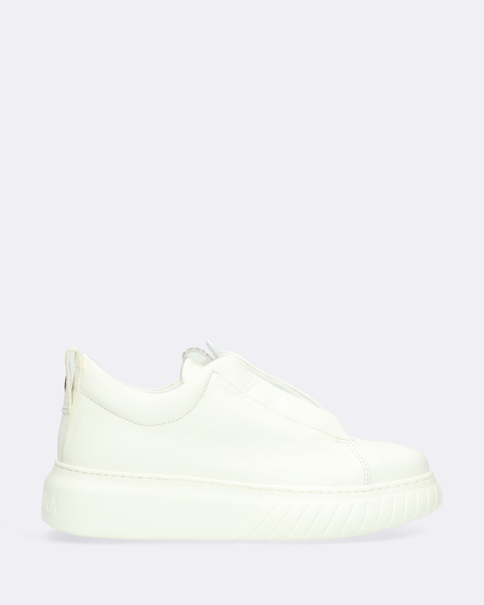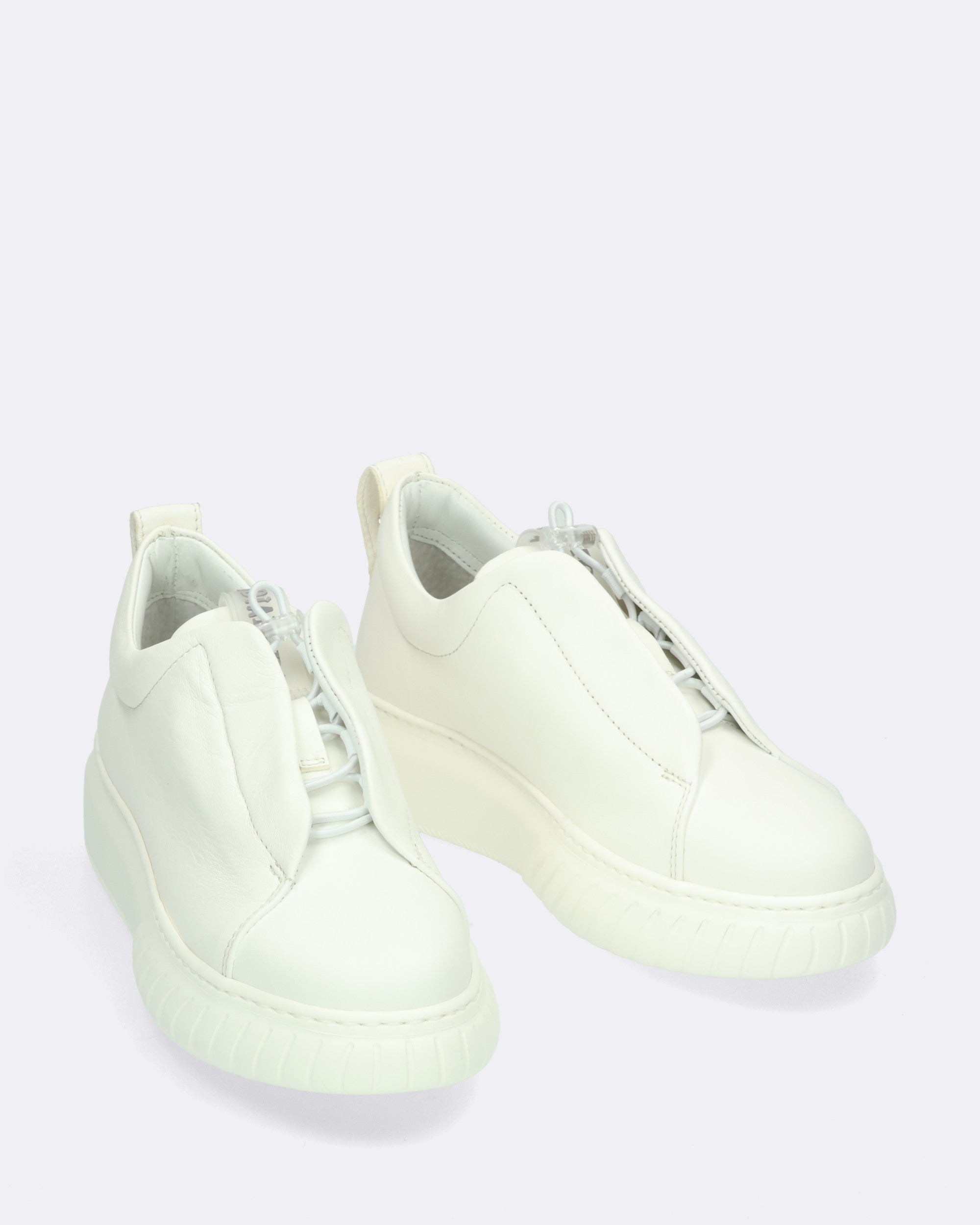 Sneakers in pelle bianca, senza lacci, chiusura con elastico, suola in gomma extralight cucita , tacco 45, battuta 35, platform10, sottopiede antishock estraibile, made in Italy, prodotto artigianale, collezione donna Andiafora Primavera Estate 2025