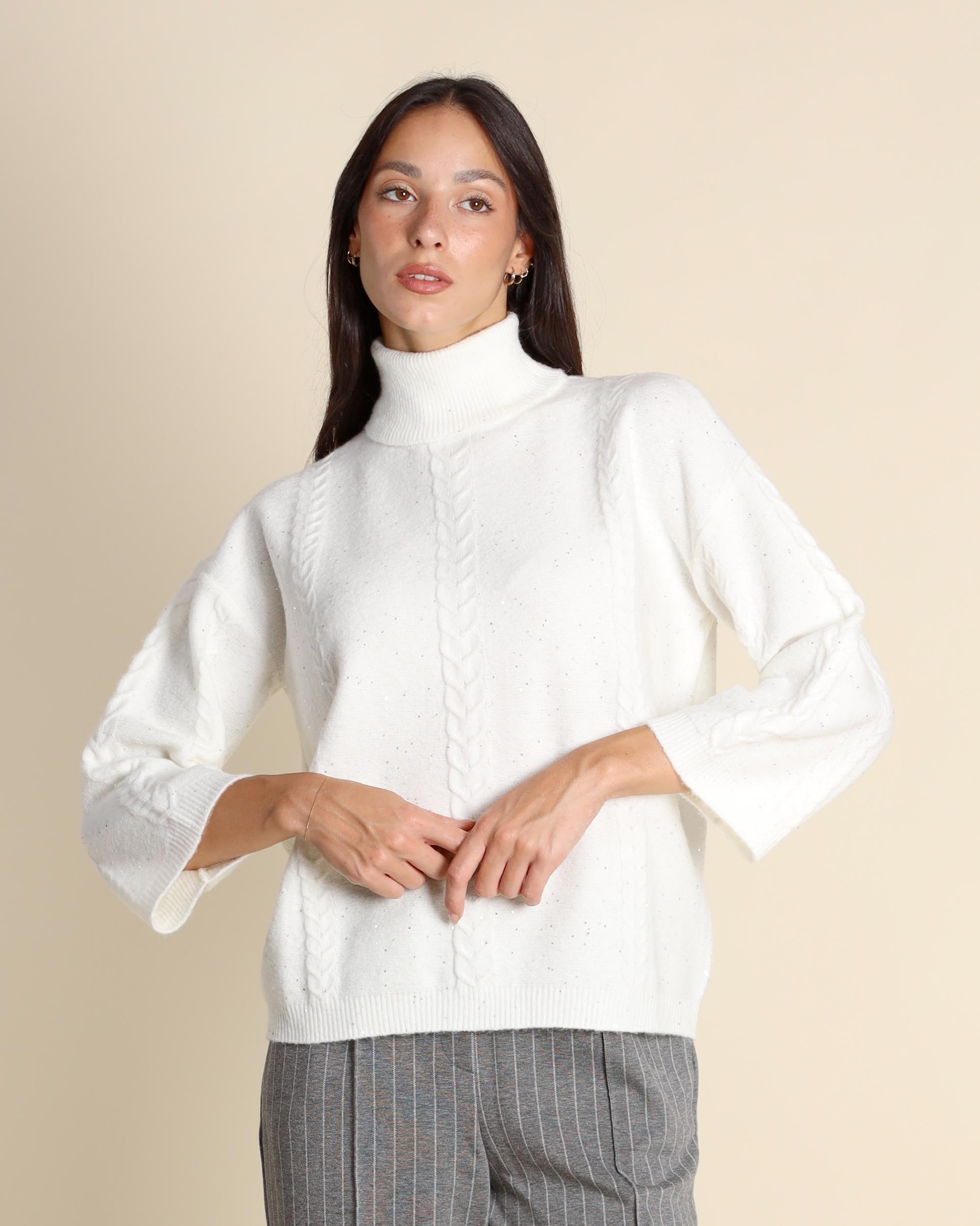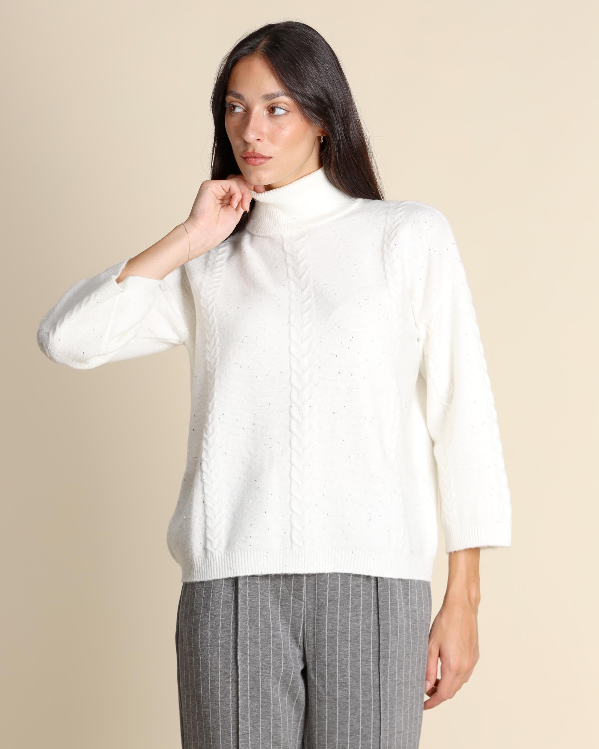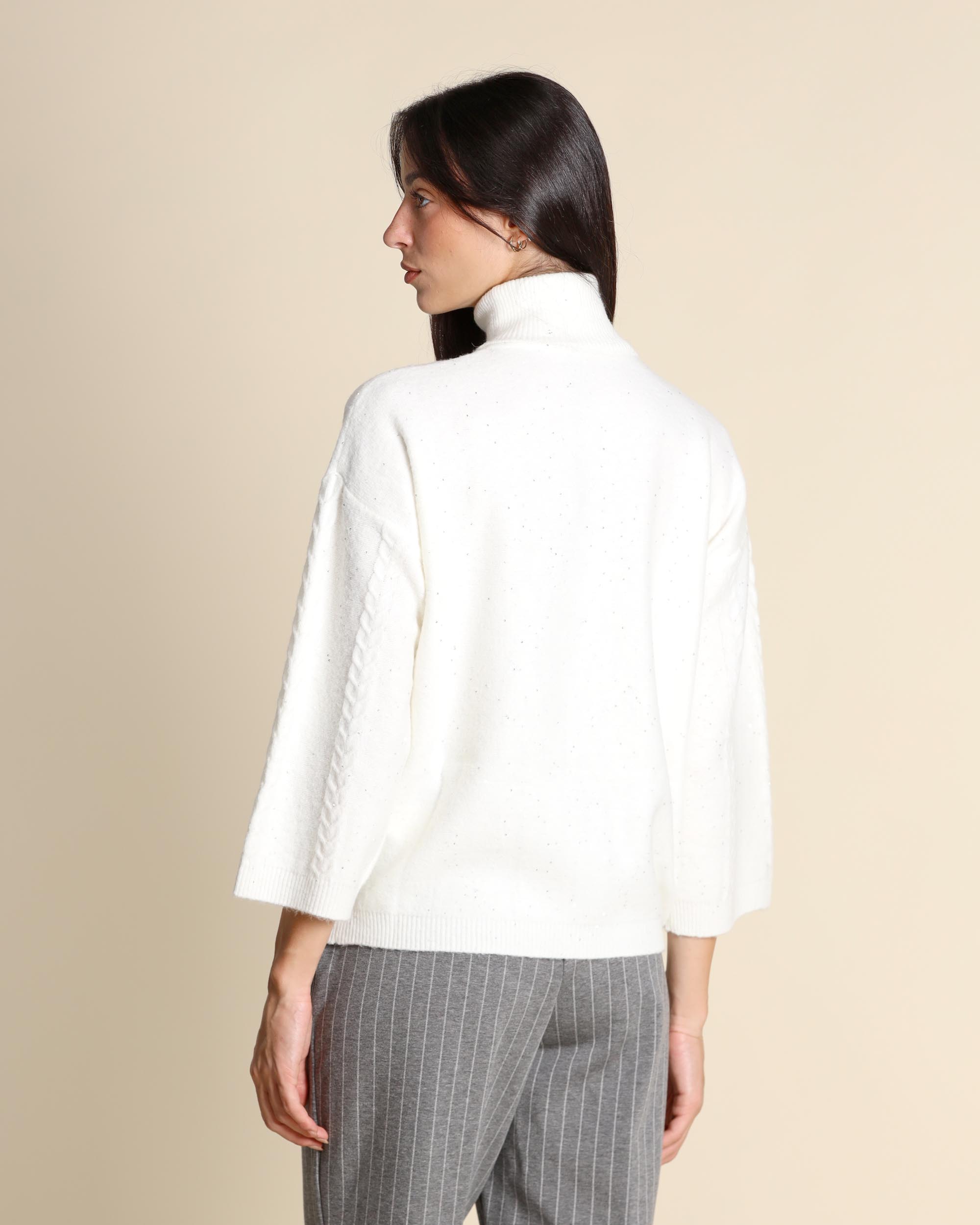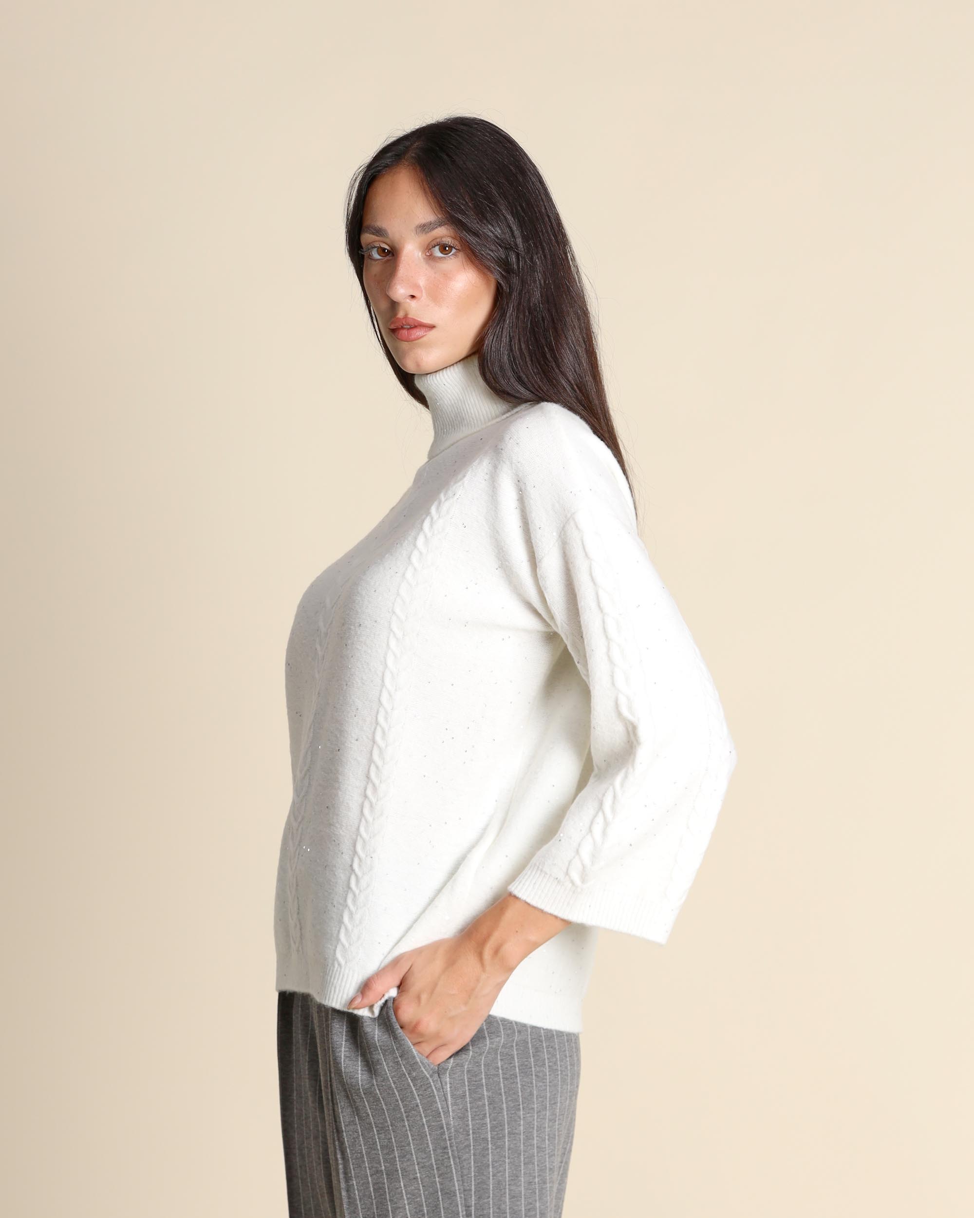 Maglia dolcevita bianca in filato comfy con micro paillettes in tinta, collo alto, maniche lunghe, giro sceso, dettaglio di trecce, linea morbida, la modella indossa una tg.S, la modella ha le seguenti misure: altezza 177, seno 87, vita 65, fianchi 93, collezione donna Emme by Marella Autunno Inverno 2025/26