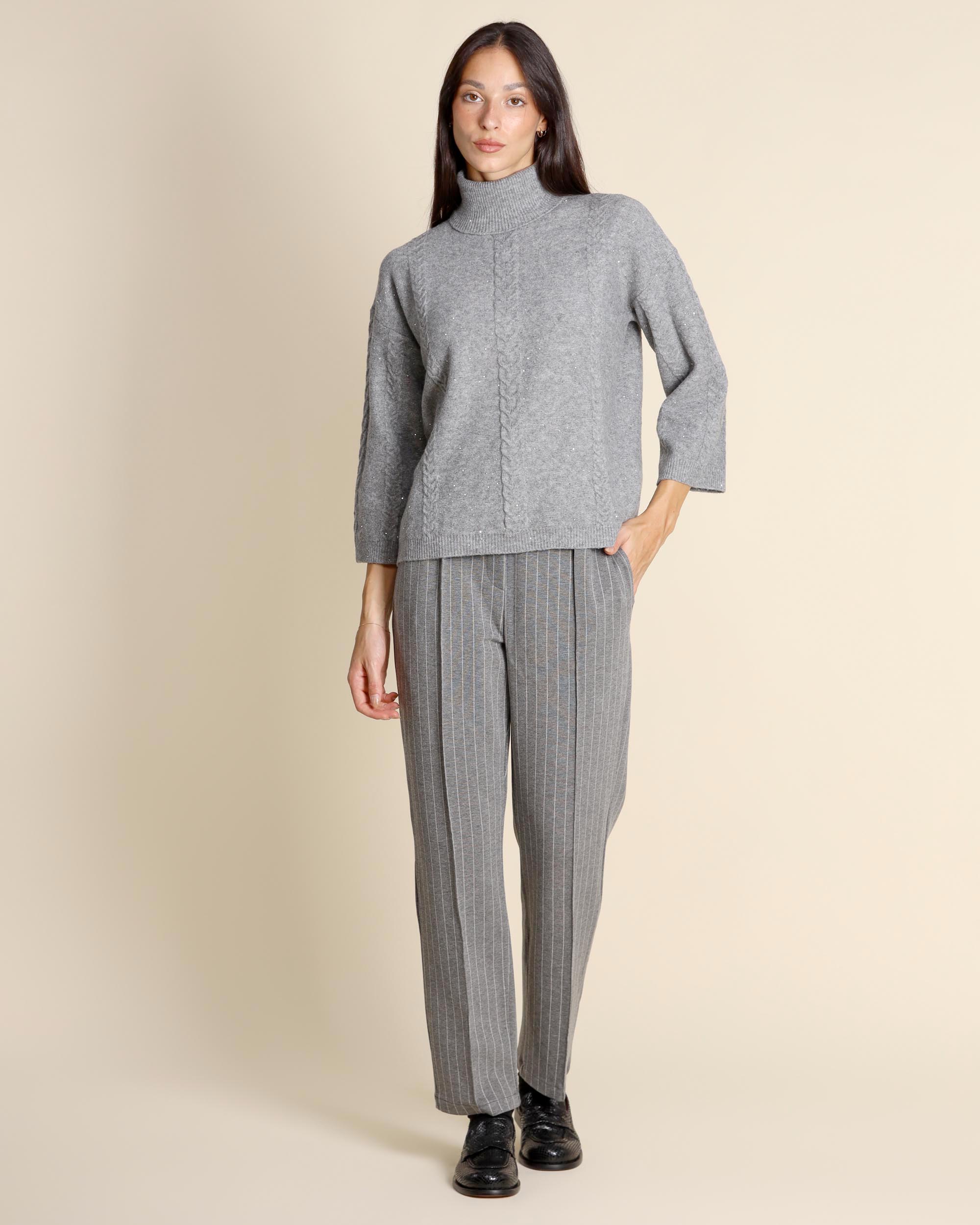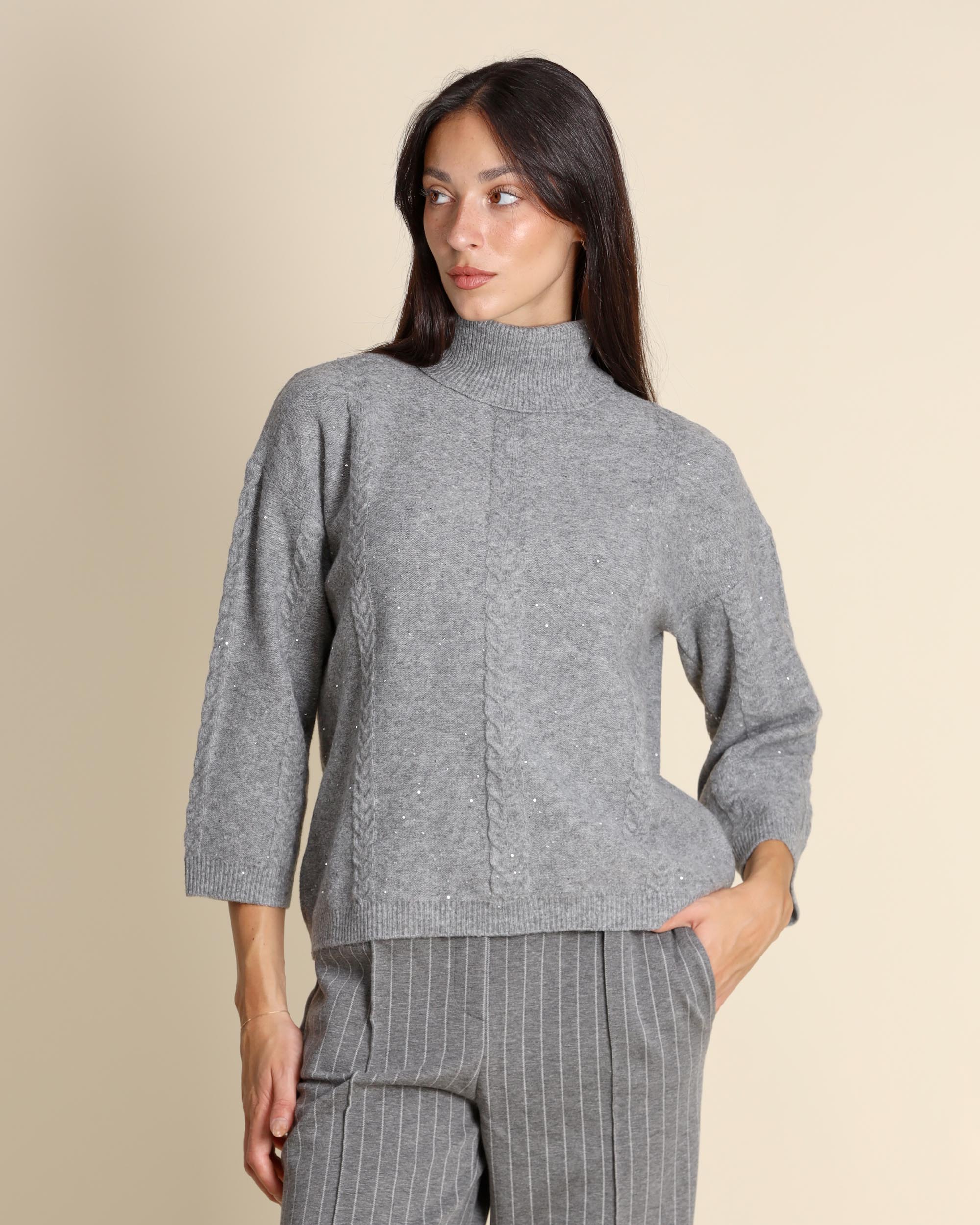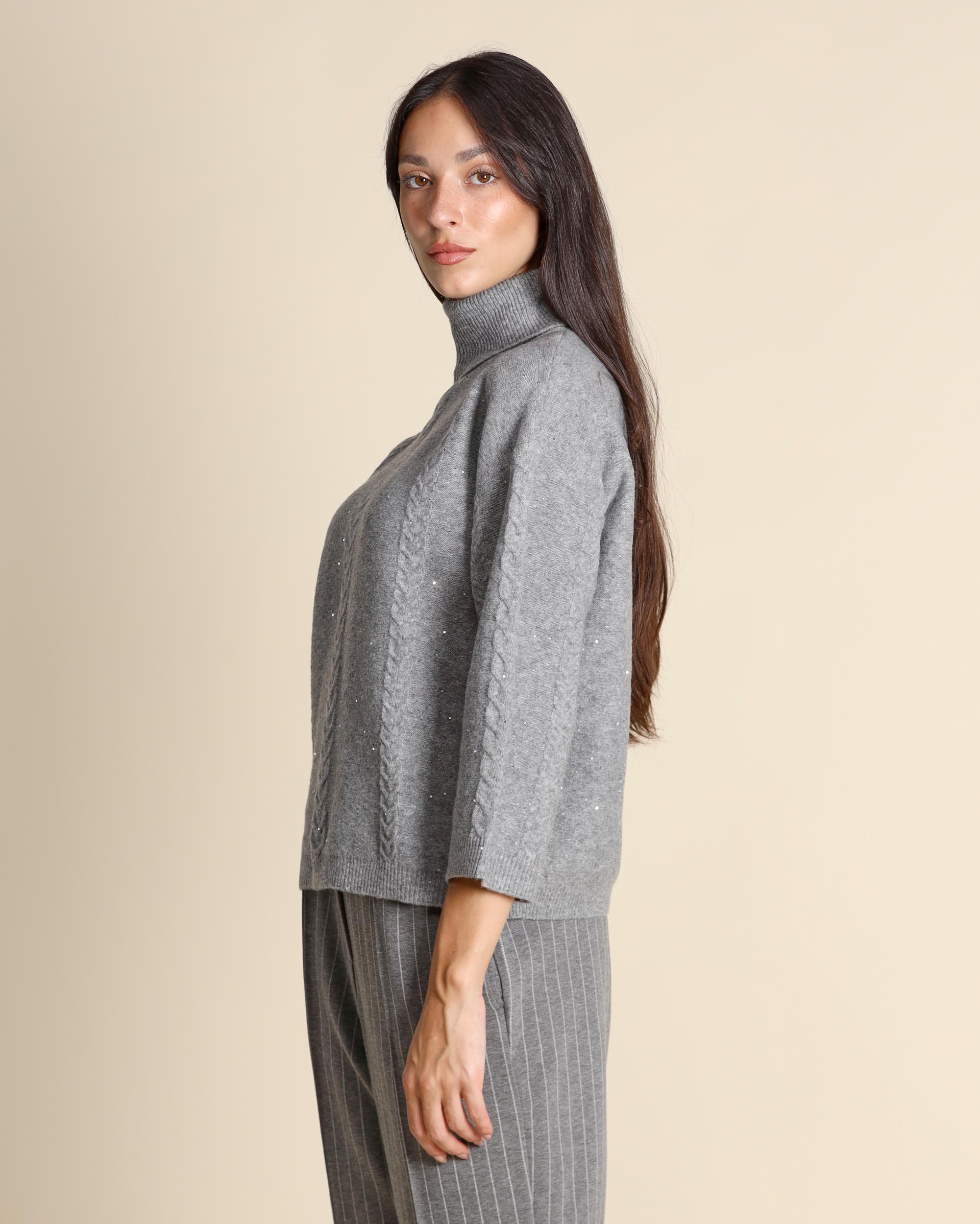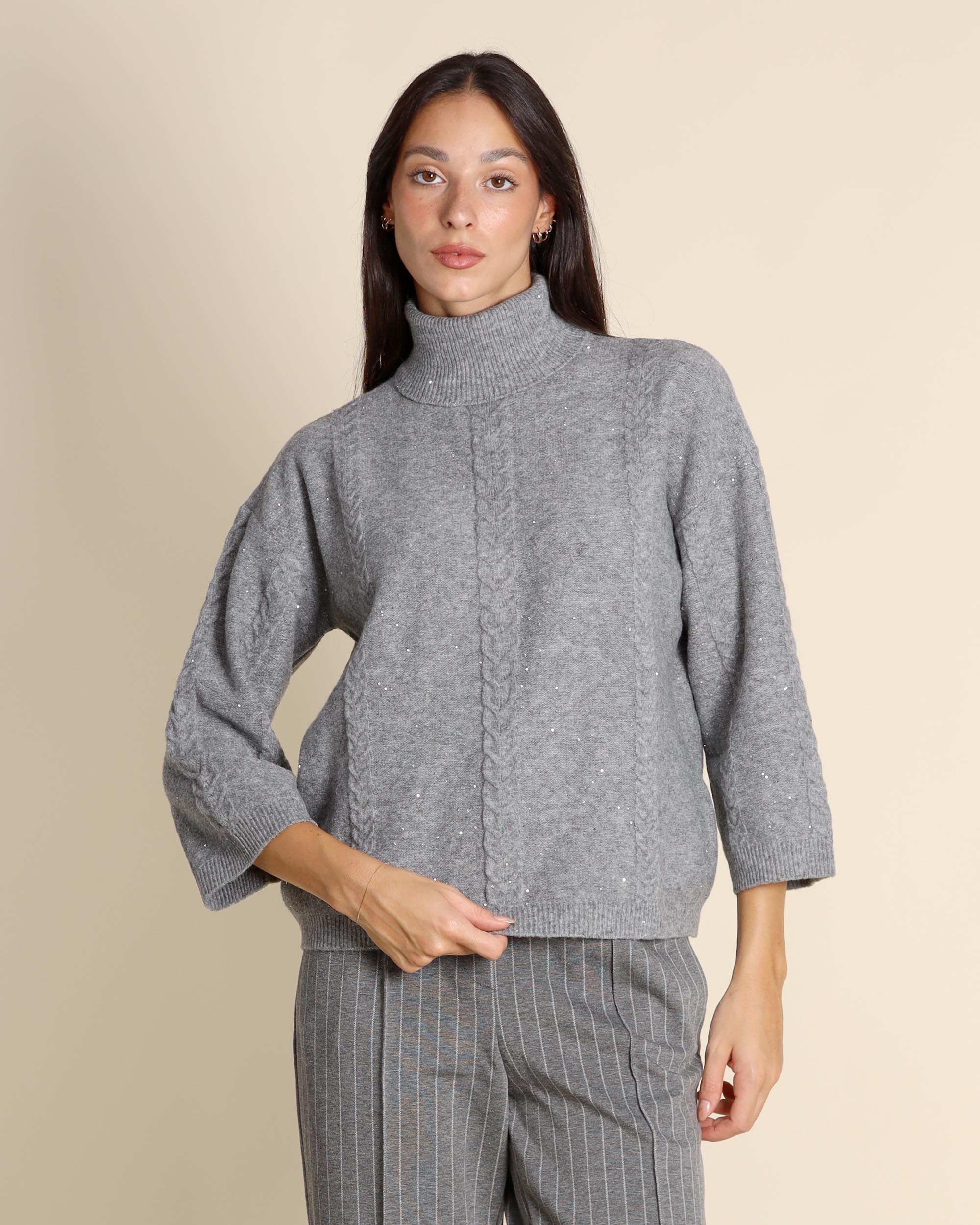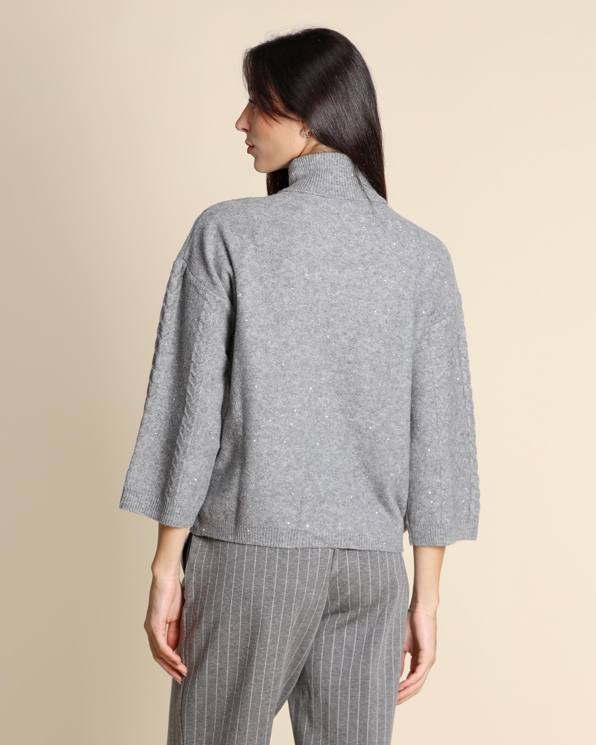 Maglia dolcevita grigio melange in filato comfy con micro paillettes in tinta, collo alto, maniche lunghe, giro sceso, dettaglio di trecce, linea morbida, la modella indossa una tg.S, la modella ha le seguenti misure: altezza 177, seno 87, vita 65, fianchi 93, collezione donna Emme by Marella Autunno Inverno 2025/26